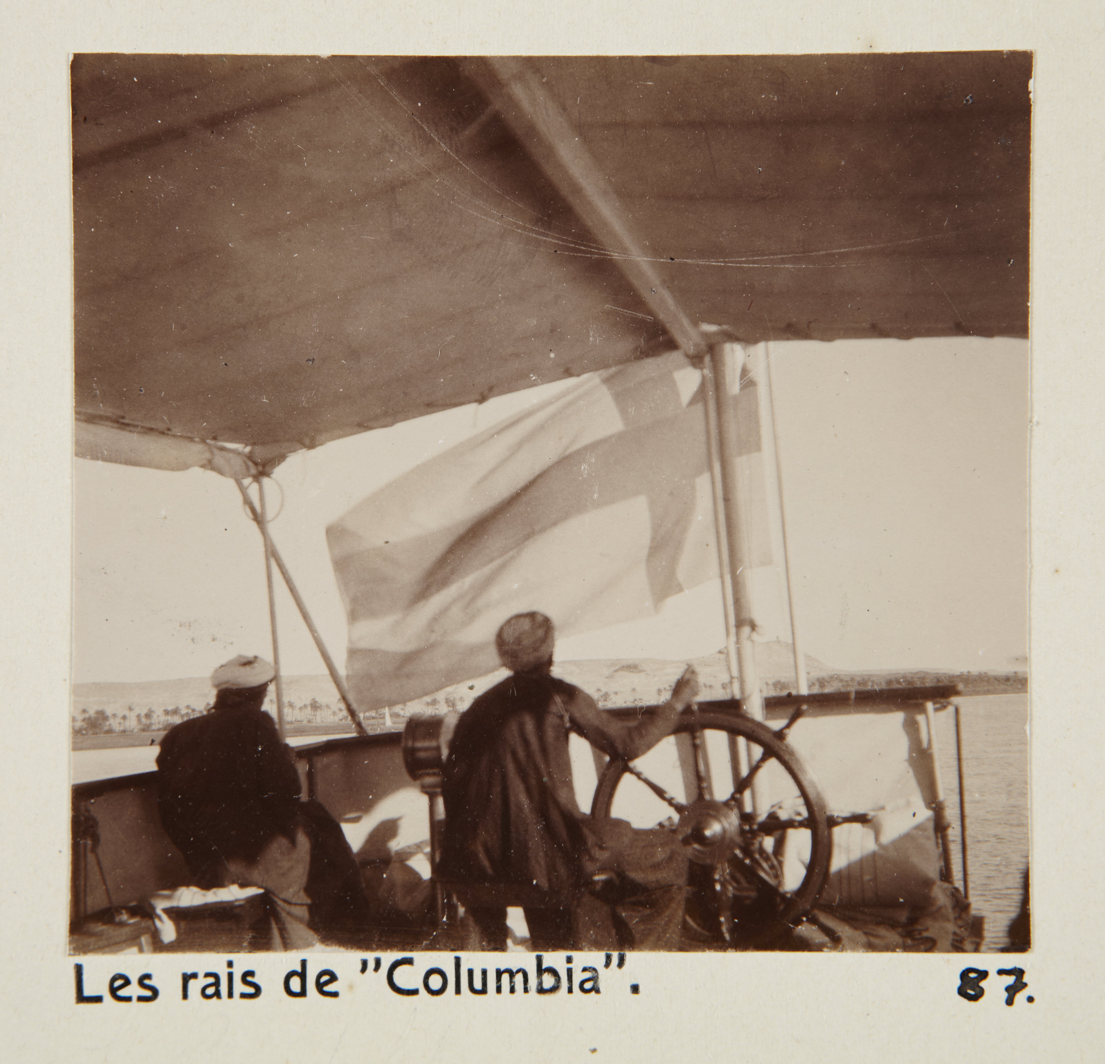 Styrmännen på ångfartyget Columbia. Egypten. Text på fotografiet: Les rais de "Columbia". Fotografierna LXVI:M.01.- 201. kommer från resan till Egypten och Sudan som Wilhelmina och Walther von Hallwyl gjorde vintern 1900-1901. De lämnade Sverige den 5 november 1900 och fortsatte från Egypten till Palestina den 28 mars 1901. Med på resan var döttrarna Ellen med maken Henric de Maré och Irma med maken Wilhelm von Geijer. Wilhelminas sällskapsdam, fröken Ida Uhse reste också med. Under en del av resan anslöt sig ledamoten av Internationella domstolen i Kairo, assessorn Otto Conrad Waldemar Cedercrantz med makan Anna Elisabeth. Vid resan uppför Nilen hade Walther von Hallwyl hyrt ångfartyget Columbia med besättning. Båtresan startade i Kairo 27 december 1900, gick ända till Wadi Halfa varifrån man reste vidare med tåg till Khartum och tillbaka till Wadi Halfa. Båten vände åter i riktning mot Kairo, men det verkar som att sällskapet tog tåg sista biten, från Luxor. Henric och Ellen de Maré samt fru Cedercrantz lämnade båten redan då de passerade Luxor första gången. Resten av sällskapet återvände till Kairo den 1 mars. Fotografierna LXVI:M.01.-120. togs av resenärerna själva, de största av Ellen de Maré, de mellersta av Wilhelmina von Hallwyl och de minsta av Wilhelm von Geijer. Resten köptes av professionella fotografer i Kairo, de flesta från Studio Photogr. Artistique G. Lekegian & Cie. Alla uppgifter kommer från Ida Uhses reseanteckningar.