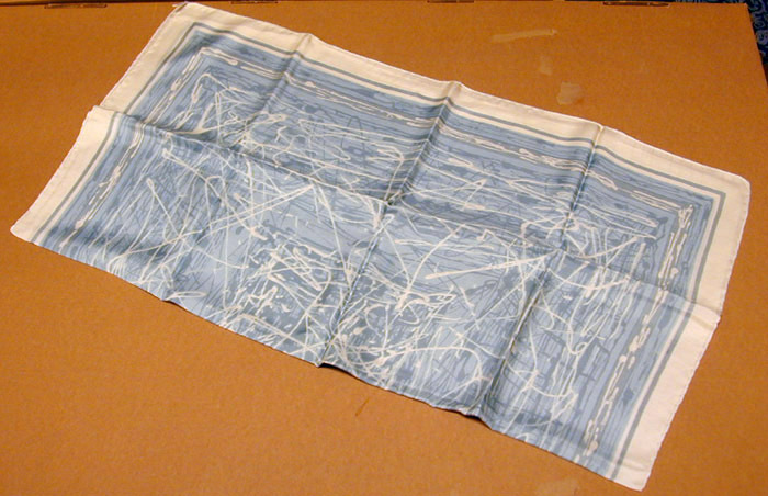 Sidensjal, fållad vit med tryckt mönster i abstrakt virvarr av ljus blått och duvblått. Mönstret avslutas med en smal duvblå bård med vit kant. Handfållad.