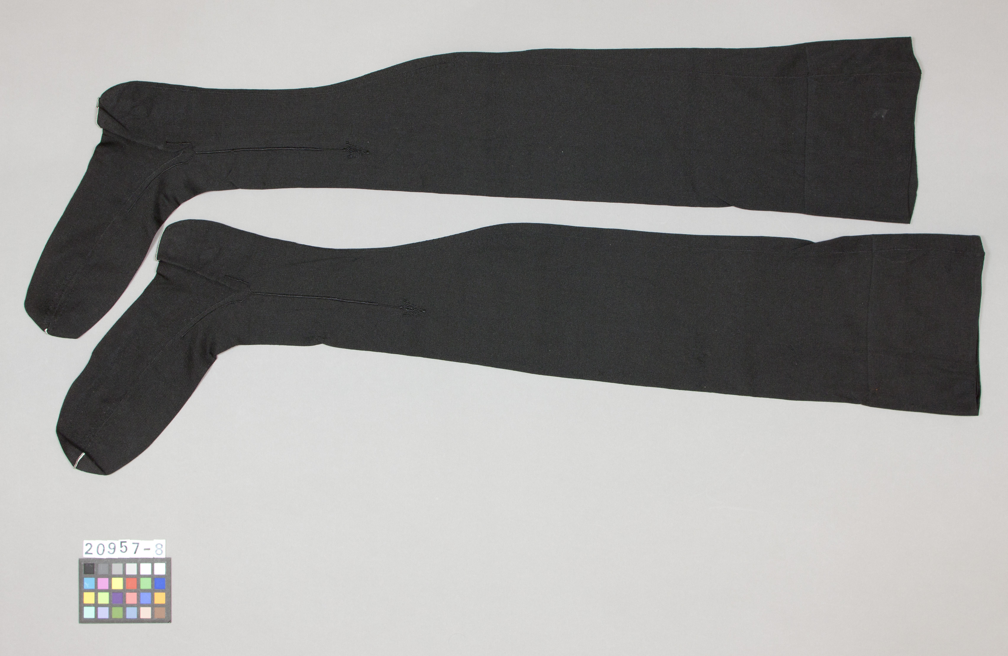 Lång svart strumpa av silke. På benets ut- och insida en dekorativ svart söm krönt av en pil som löper från fotknölen och ca 150 mm upp på vaden. Tå och häl förstärkt med en vit söm.