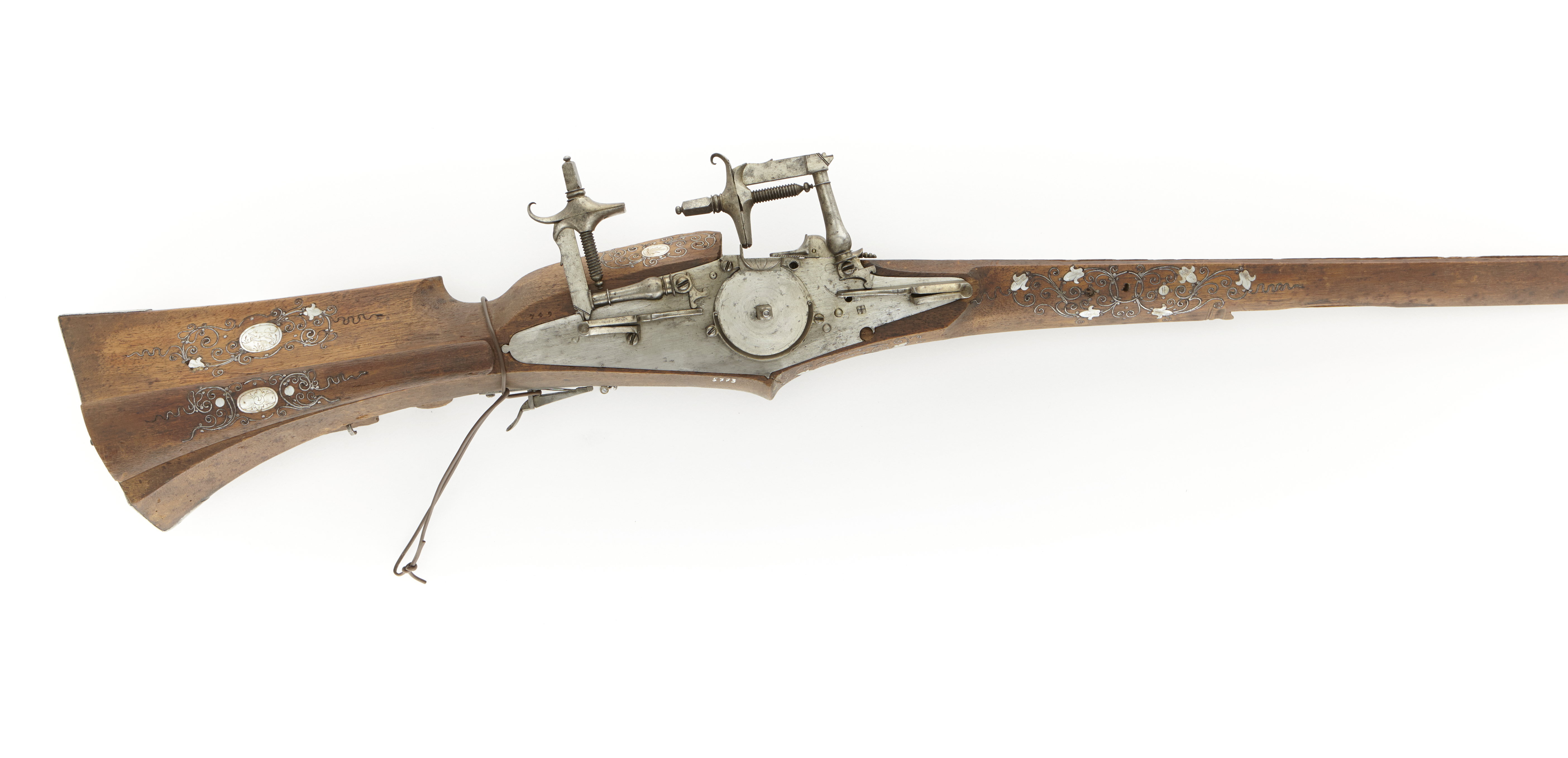 Pipa saknas. Hjullås med plant låsbleck av stål av tysk typ - bakåt avsmalnande genom två fall. Låset har två hanar, en på var sida om hjulet. Hjulet är fäst med en halv ring kl. 3 och kl. 9. Hanarna har lösa underkäkar och korta, uppåtböjda fingergrepp. På låsets insida finns en stämpel med "CV" över en bikupa(?) (se Stöckel nr 2332). Brun helstock av valnöt med kolv av musköttyp. Bakplåt av stål. Kolvlåda med lock av trä med graverad pärlemorinläggning, omgiven av slingor och punkter av inslagen ståltråd. På anslaget och stocken i övrigt finns inläggningar av pärlemor samt slingor och punkter av ståltråd. Två rörkor av stål. Varbygel saknas. Avtryckare med skjutbar spärregel. Utan tillbehör. Märkt: 749 ovanför låsblecket, stanstyp 5376.