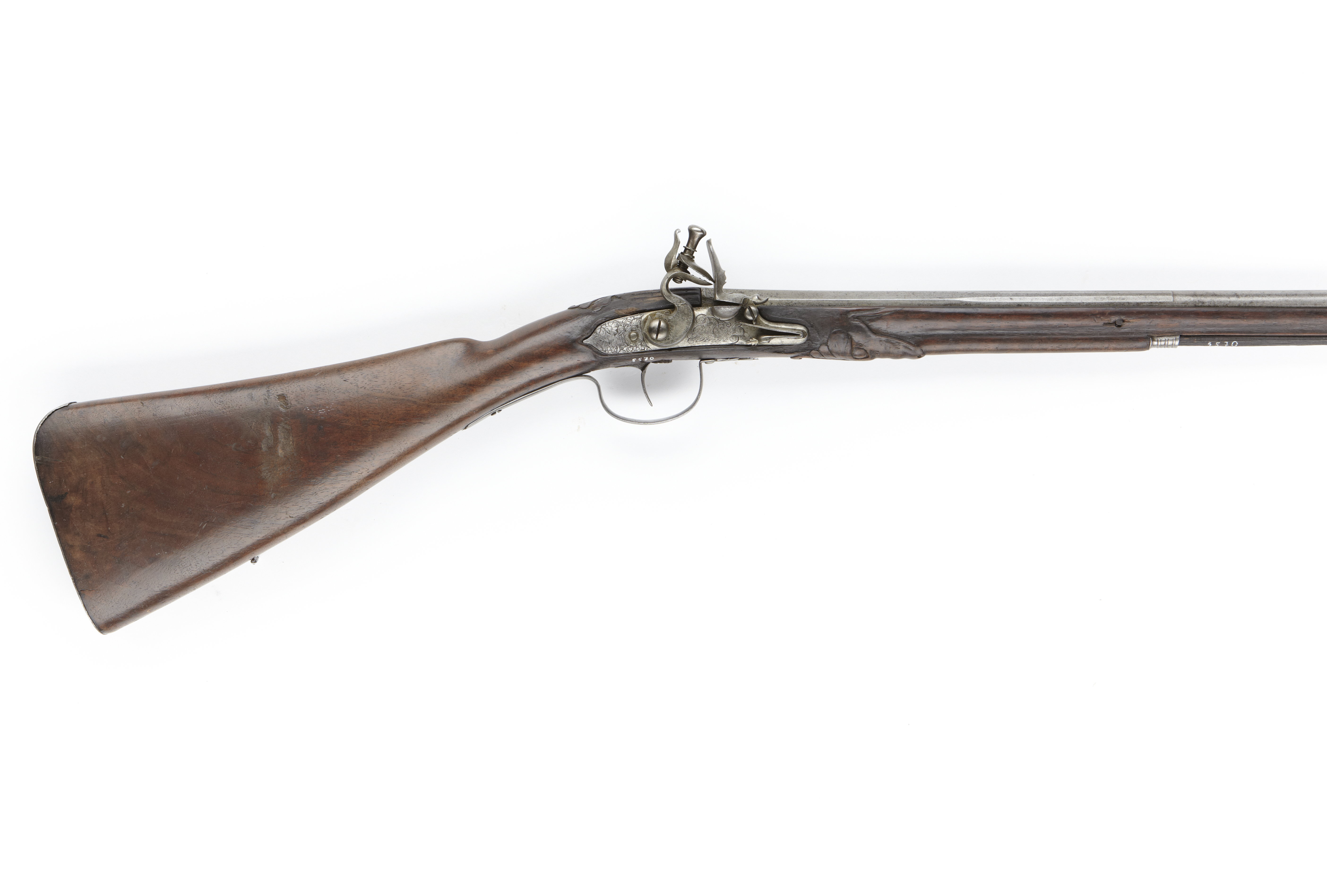 Rund, över kammaren sextonkantig - övergående i Åttkantig, slätborrad pipa. Något utvidgad vid mynningen. Utan sikte, knoppkorn av koppar. Pipans undersida med inslagen halvmåne. Tre piphäften. Flintlås. Kullrigt låsbleck. Låsets mitt signerat "Jan Ceule - Utrecht" Låsbleckets bakre del helt täckt av gravyr. Rundad fängpanna. Utvändig eldstålsfjäder. Nöt utan studel. Hanen ny - 1700-tal. (Platt s-formig med runt kanterna graverat, tunna rocaille - ornament. Bred, hangren. Hanens kropp med hak för varhake.) Hel stock av valnöt. Fransk kolvtyp. Bakplåt av stål, vikt liten bit in över kolvryggen. Bakom svansskruvbladet snidat eklöv, på kolvens undersida - mot framstocken, snidat djurhuvud. Tre piphäften - ej ursprungliga. Näsband av koppar. Två + en profilerad rörka av stål. Fransk varbygel. Tillbehör: Laddstock av svärtat trä, utan doppsko. Ej märkt.
