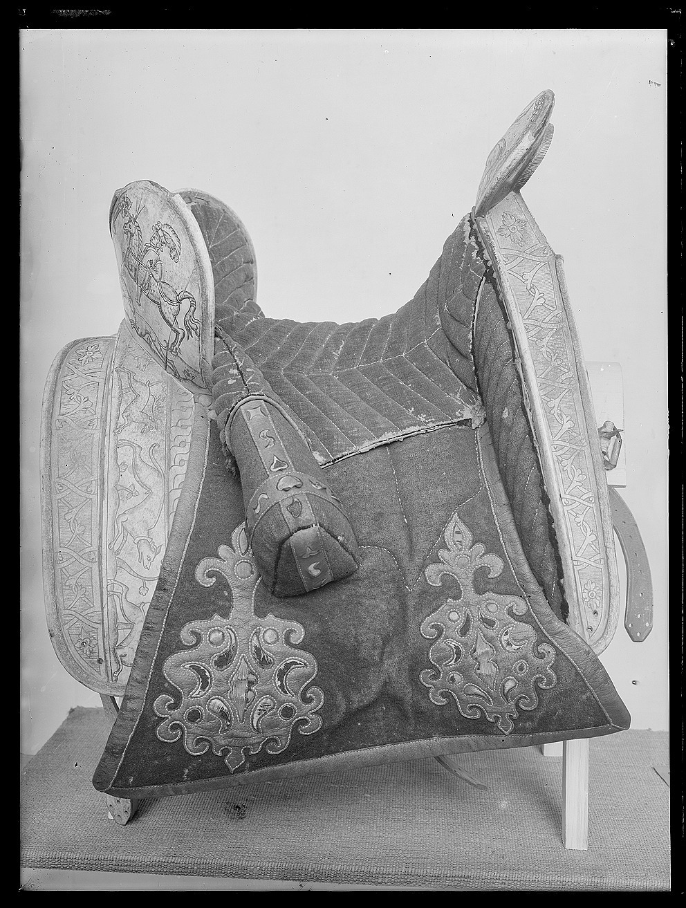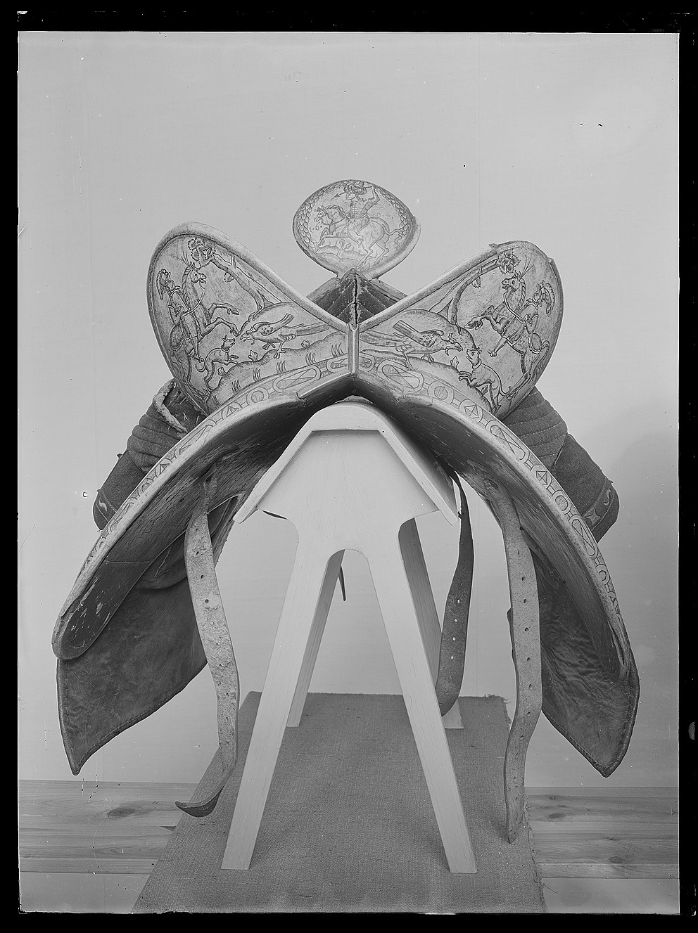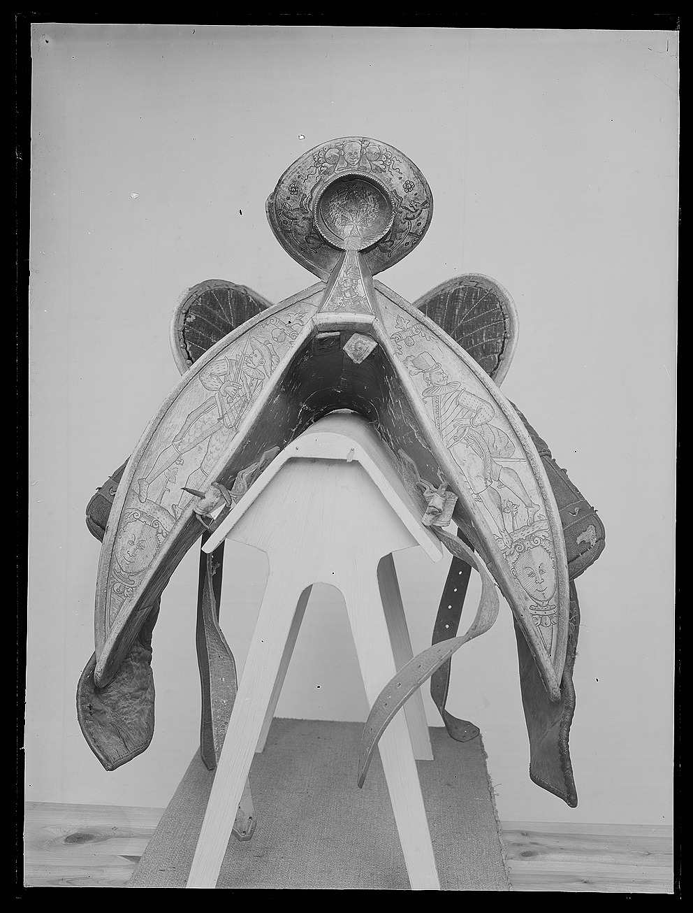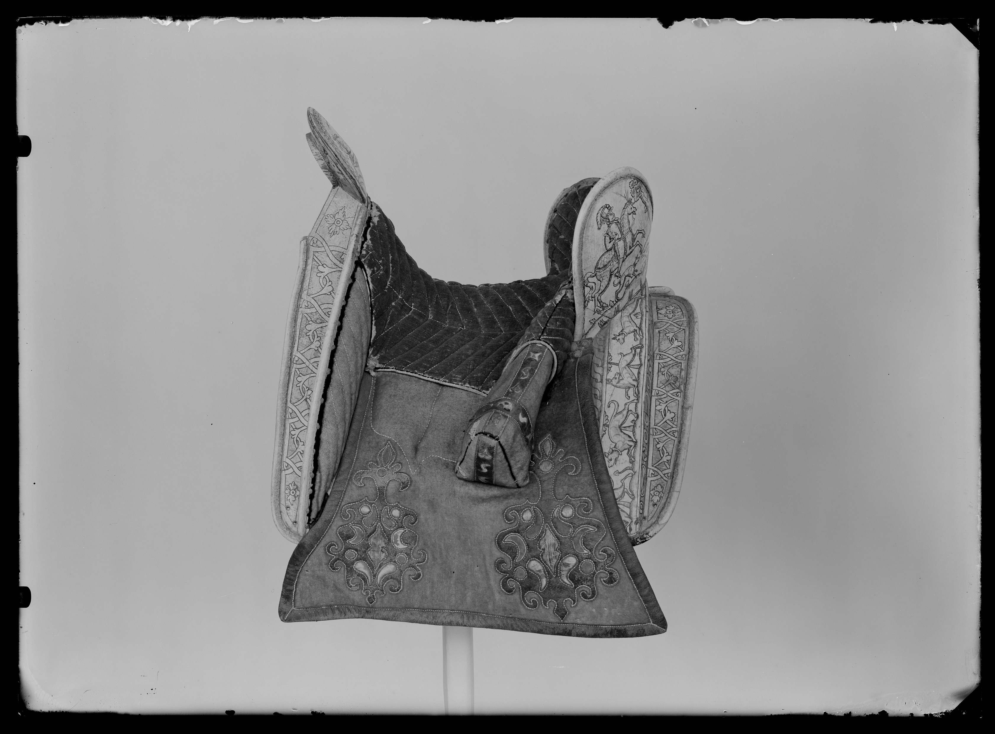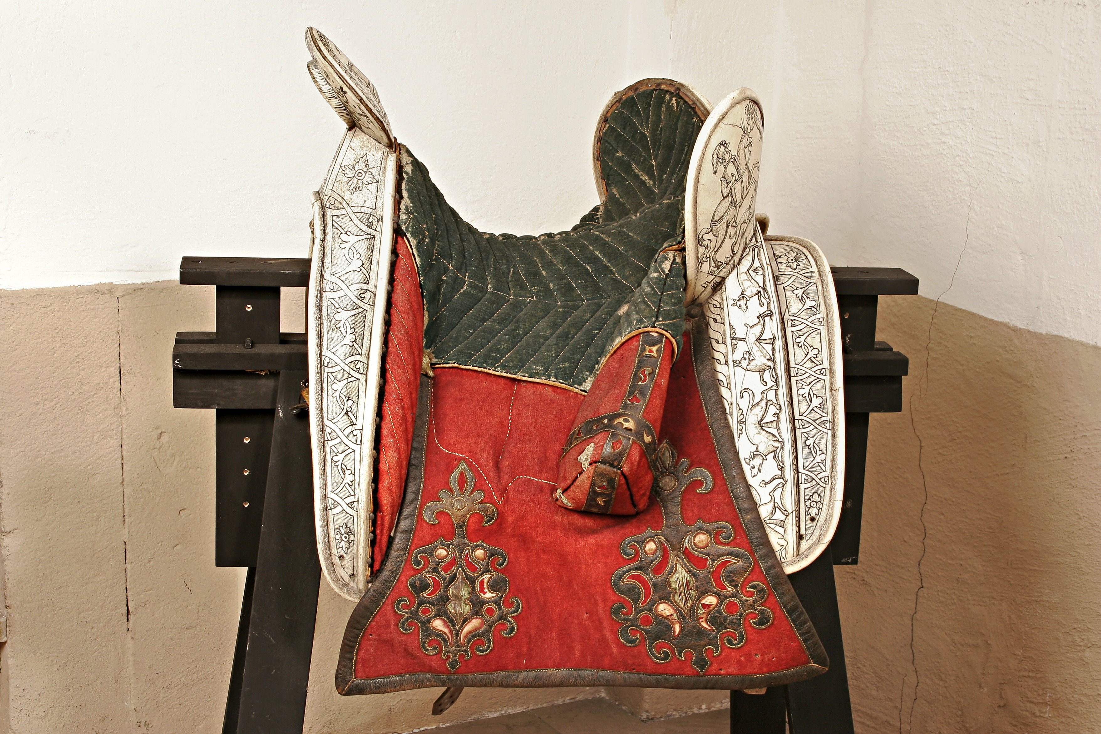 Sadel med fram och bakbommar av ben med rikliga graveringar föreställande bl a riddare, hundar och andra djur. Hög, rundad sadelknapp, på utsidan försedd med staden Danzigs vapen, på insidan årtalet "1605", det sistnämnda möjligen senare ingraverat. Sits av grönt kläde med gula tvärgående sömmar. Kåpor, stödbommar samt frambommens insida av rött kläde. Skinnapplikationer på kåporna i form av turkiskt bladmönster. Foder och kantskoning av läder. Kåpornas form något nedhängande samt bredare nertill. Bakbom med två högt uppstående rundade sittblad. På sittbladens baksida riddare till häst med en hund och fågel i förgrunden. Längs med bakbommens sidor jagande hundar, hjortar och harar. Frambommens båda sidor med två moderiktigt klädda herrar i fokus. Insidan av sadelknappen dekorerad med orientalisk krigare till häst beväpnad med javelin. Stomme på undersidan beklädd med näver. Två remmar med sölja för fäste av förbygel. Fyra sadelgjordsstroppar. Rester av läderögla framför frambommen. Uppges i Livrustkammarens inventarium 1748 ha tillhört Karl X Gustav.