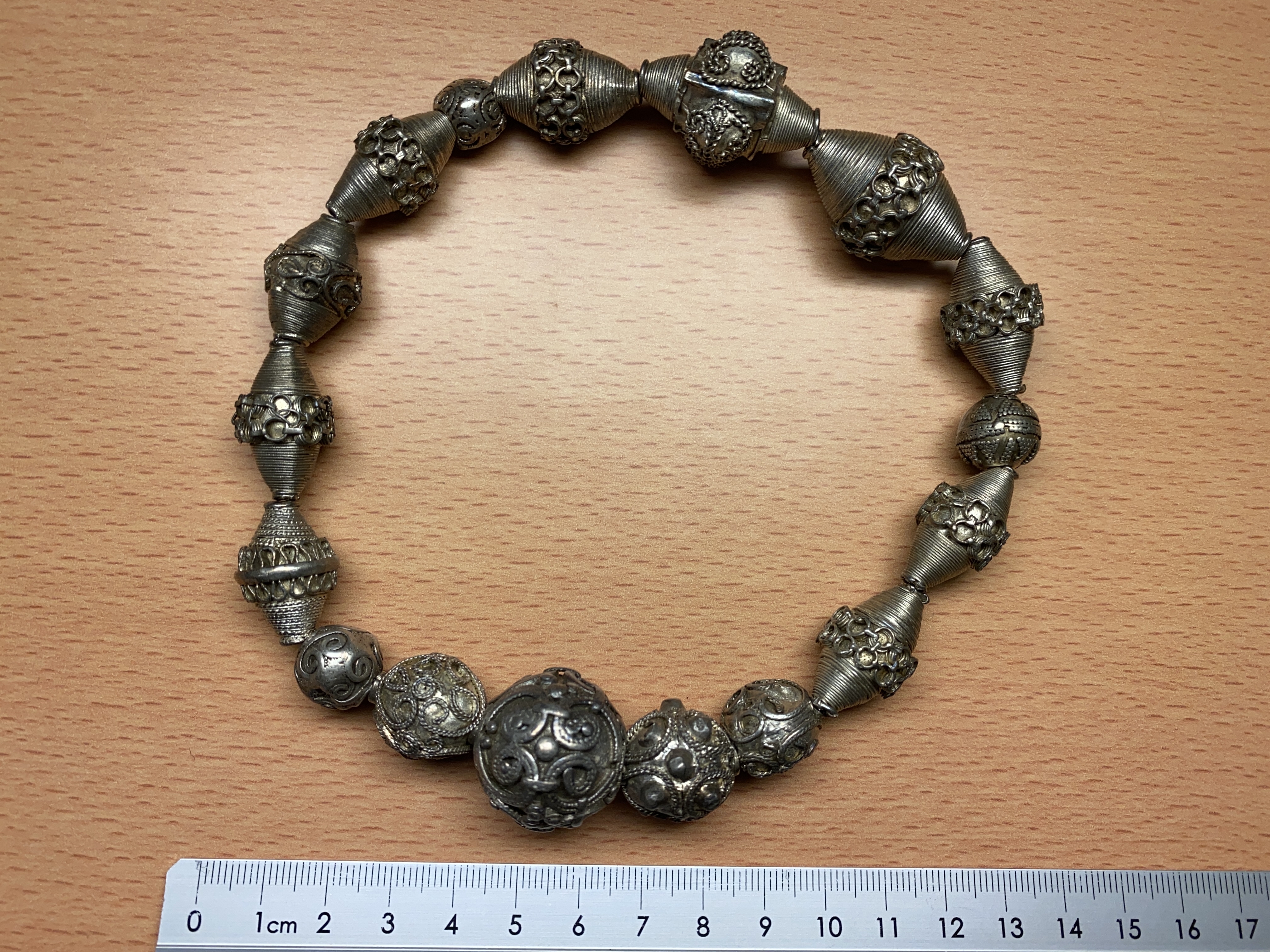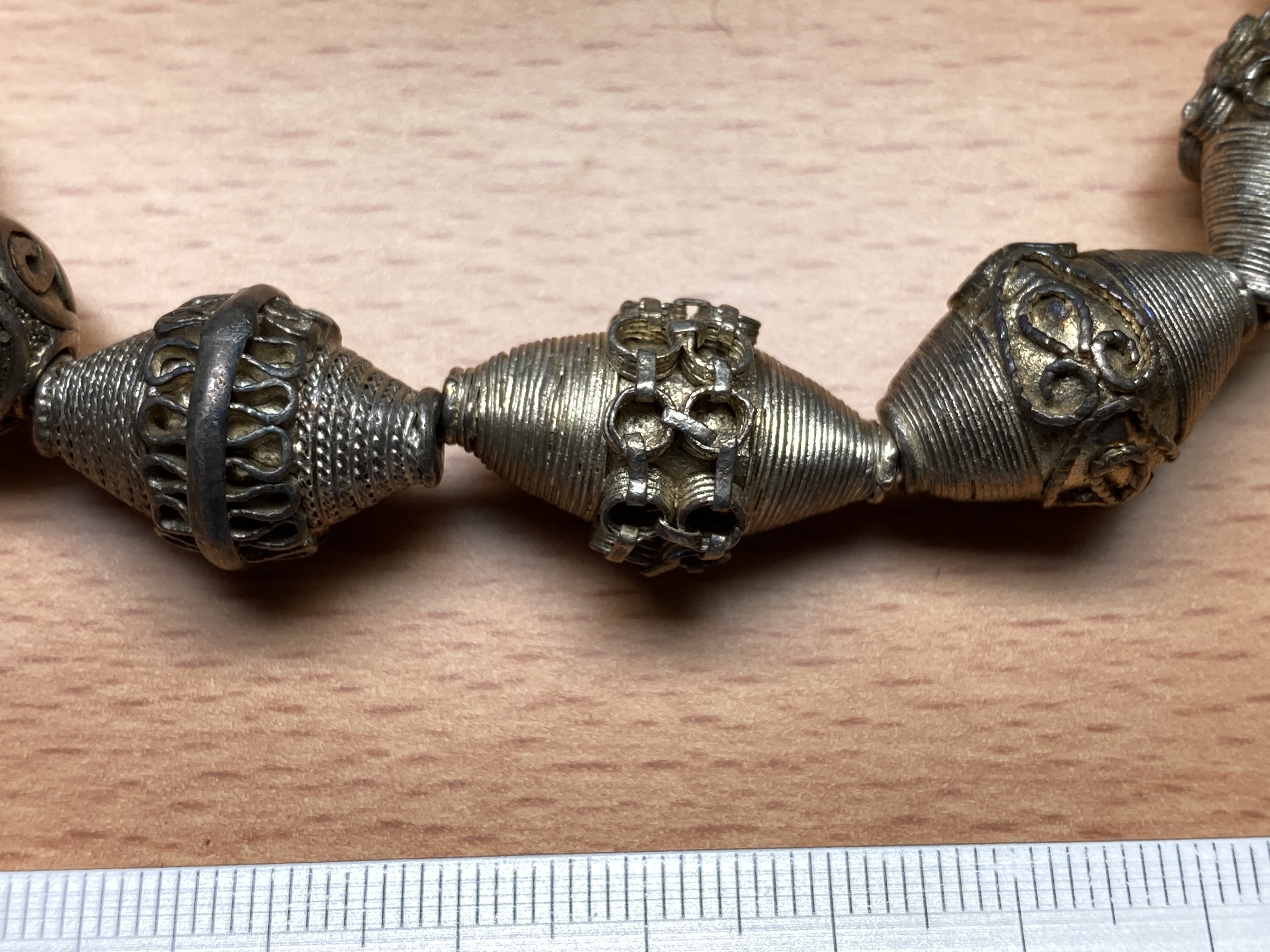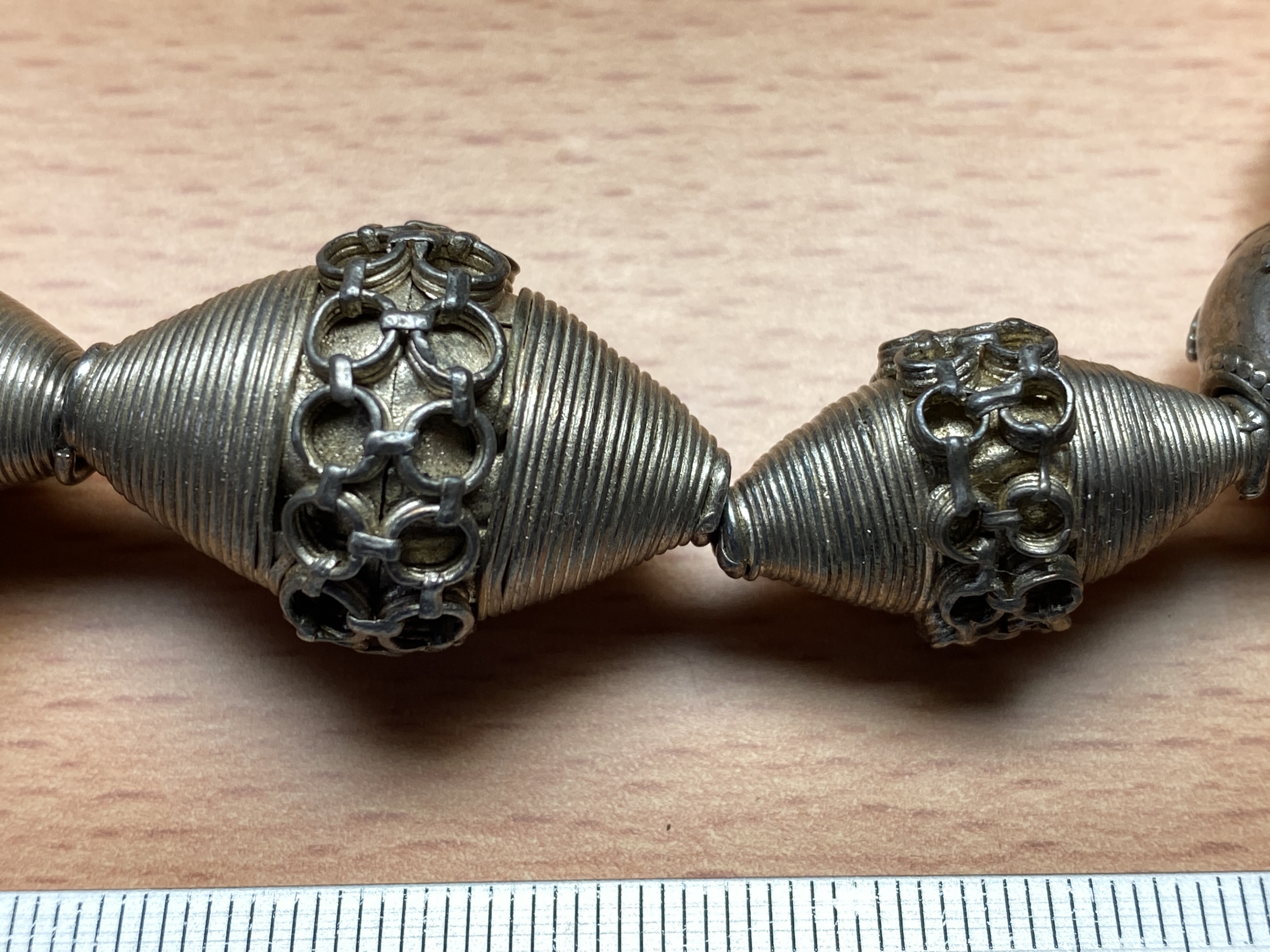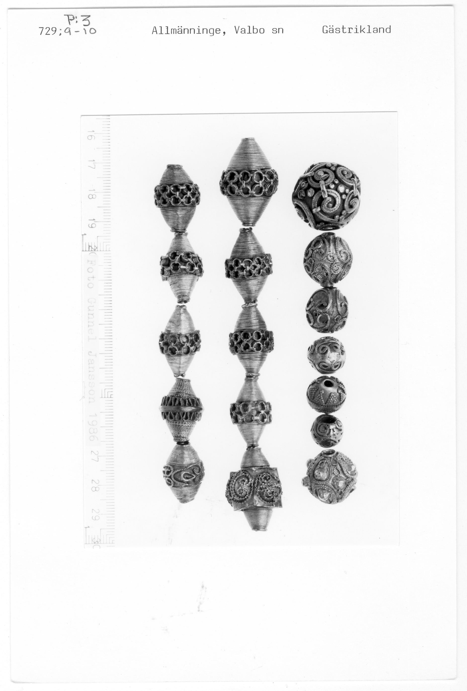 10 bikoniska pärlor, vid ändarna flätad silvertråd, på mitten en gördel med bl a spiralmönster.