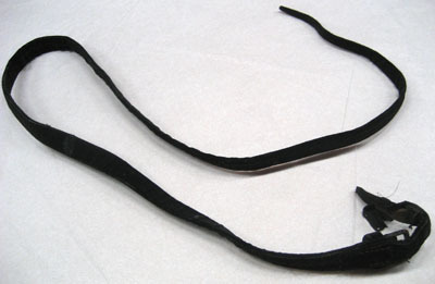 Rem av brunt läder klädd med brun sammet. Fyrkantigt spänne av järn i ena änden, med en nål. Fast sammetsklädd sölja nedanför spännet, bredd: 16 mm. Spännet märkt med vitt: "6435". Andra änden har ett spetsformat avslut. Fastsydd rem under spännet, med spetsigt avslut och med tre synliga hål i rad längs mitten, längd: 205 mm. Pergamentetikett med gnr: "06/2534".