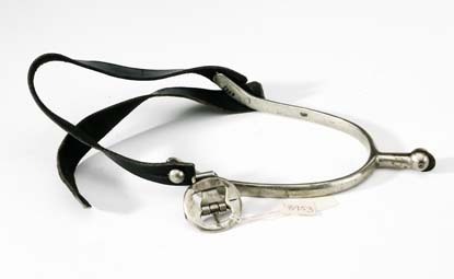 Sporre av försilvrad vitmetall. U-formade skänklar. Kort, rak hals, ansvälld i ytteränden. Klinga i form av rund, slät trissa av stål. Skänkelns ändar med dubbla, kulformiga knappar på hals samt på ena sidan rund sölja.