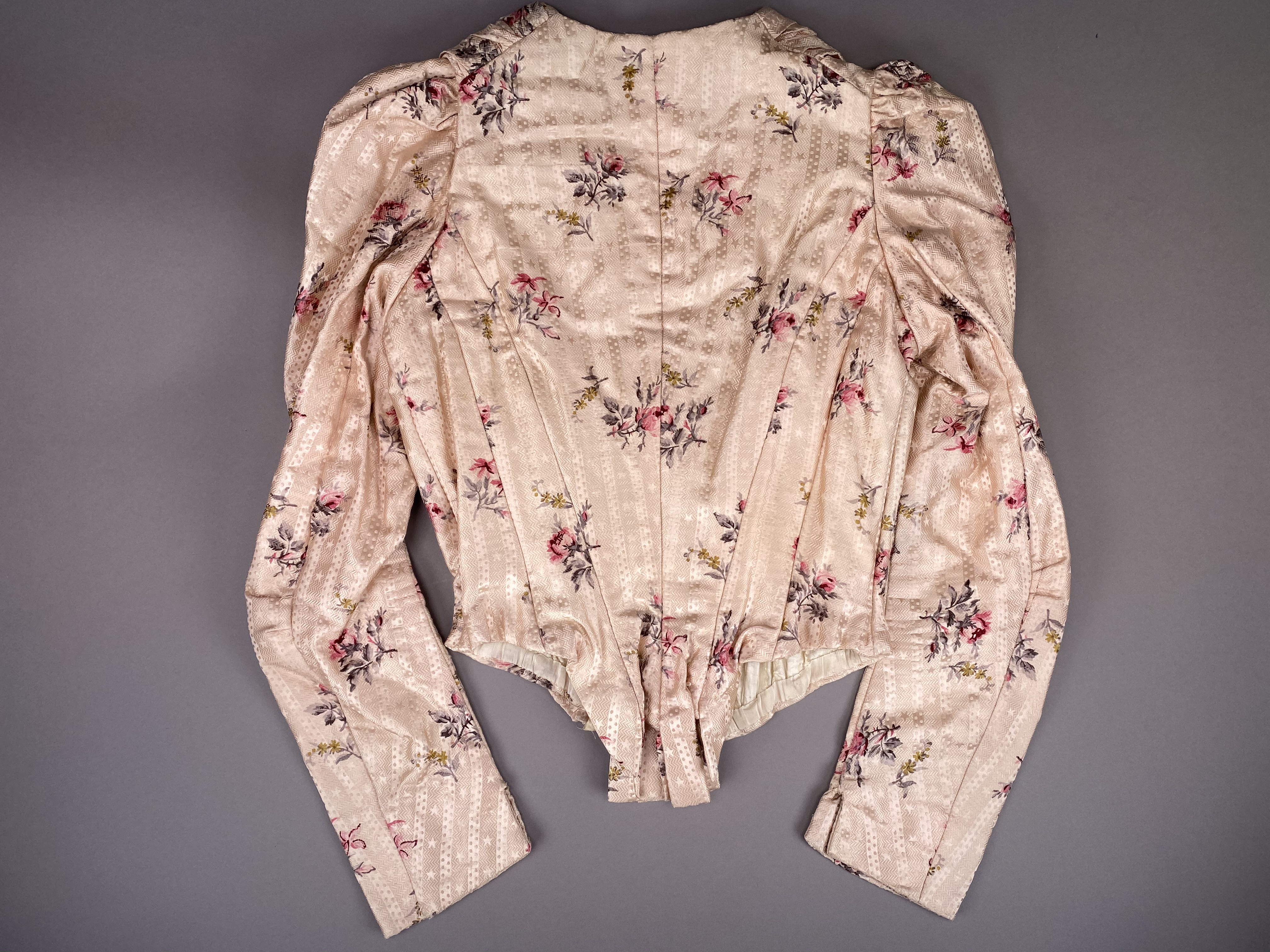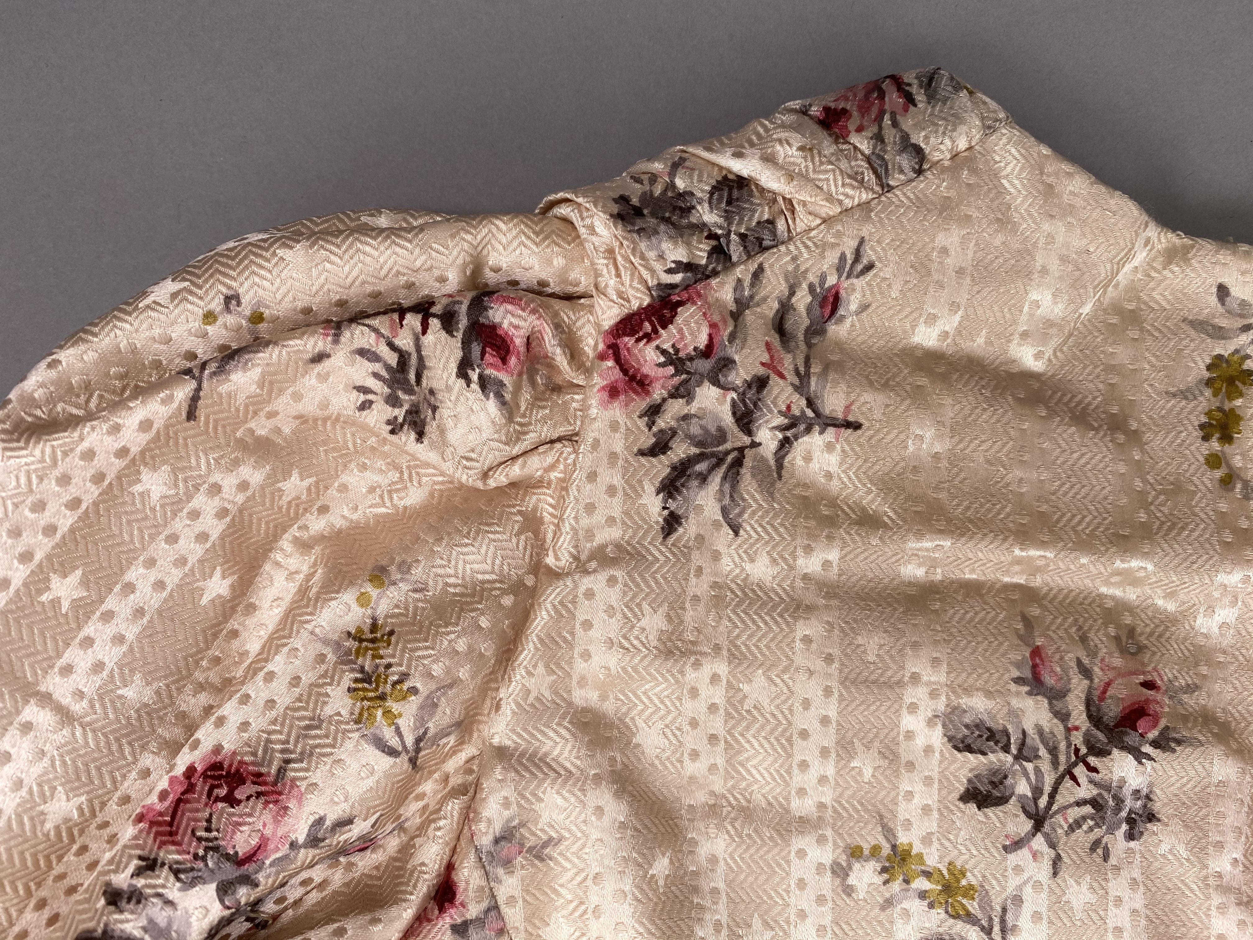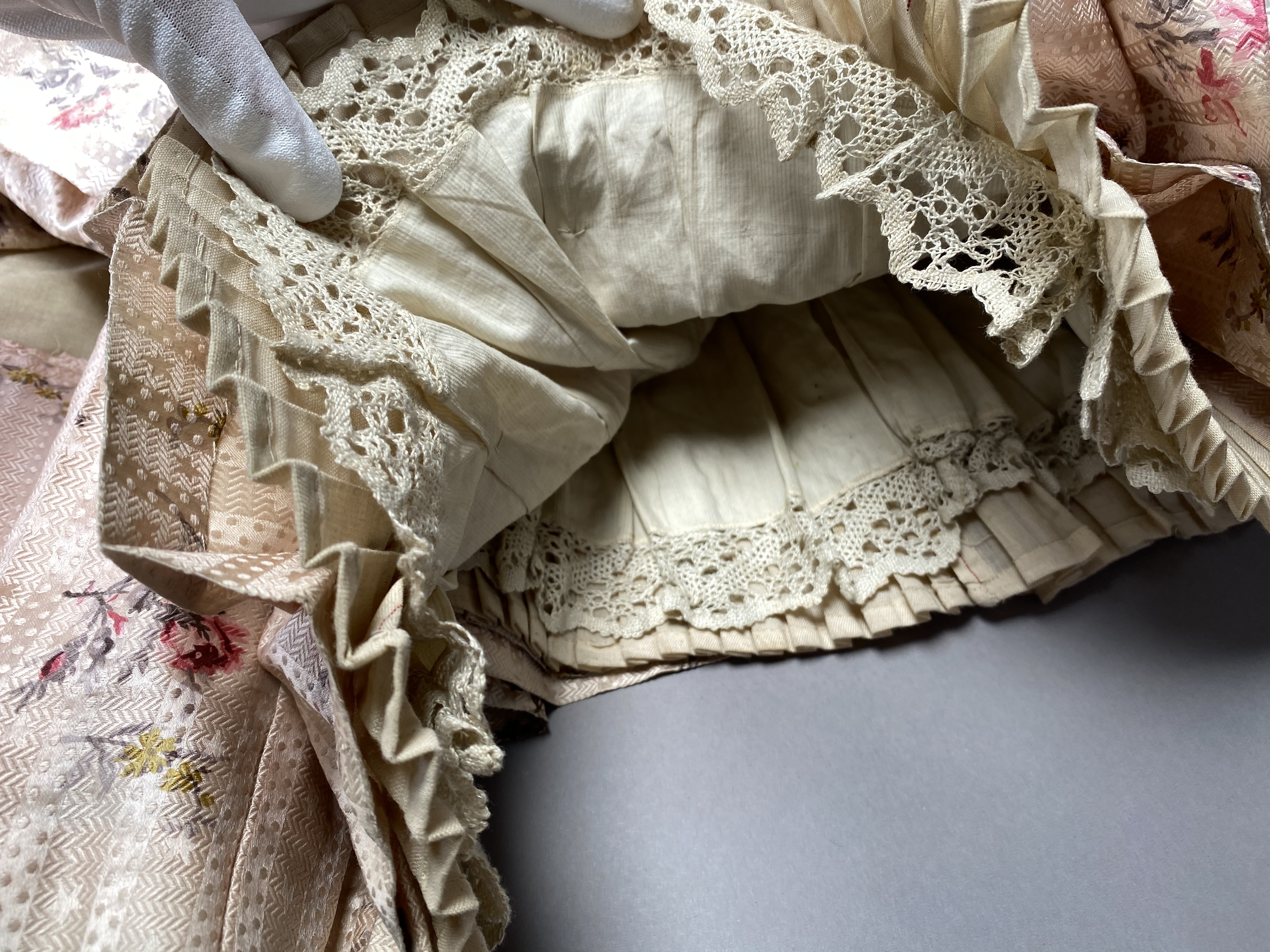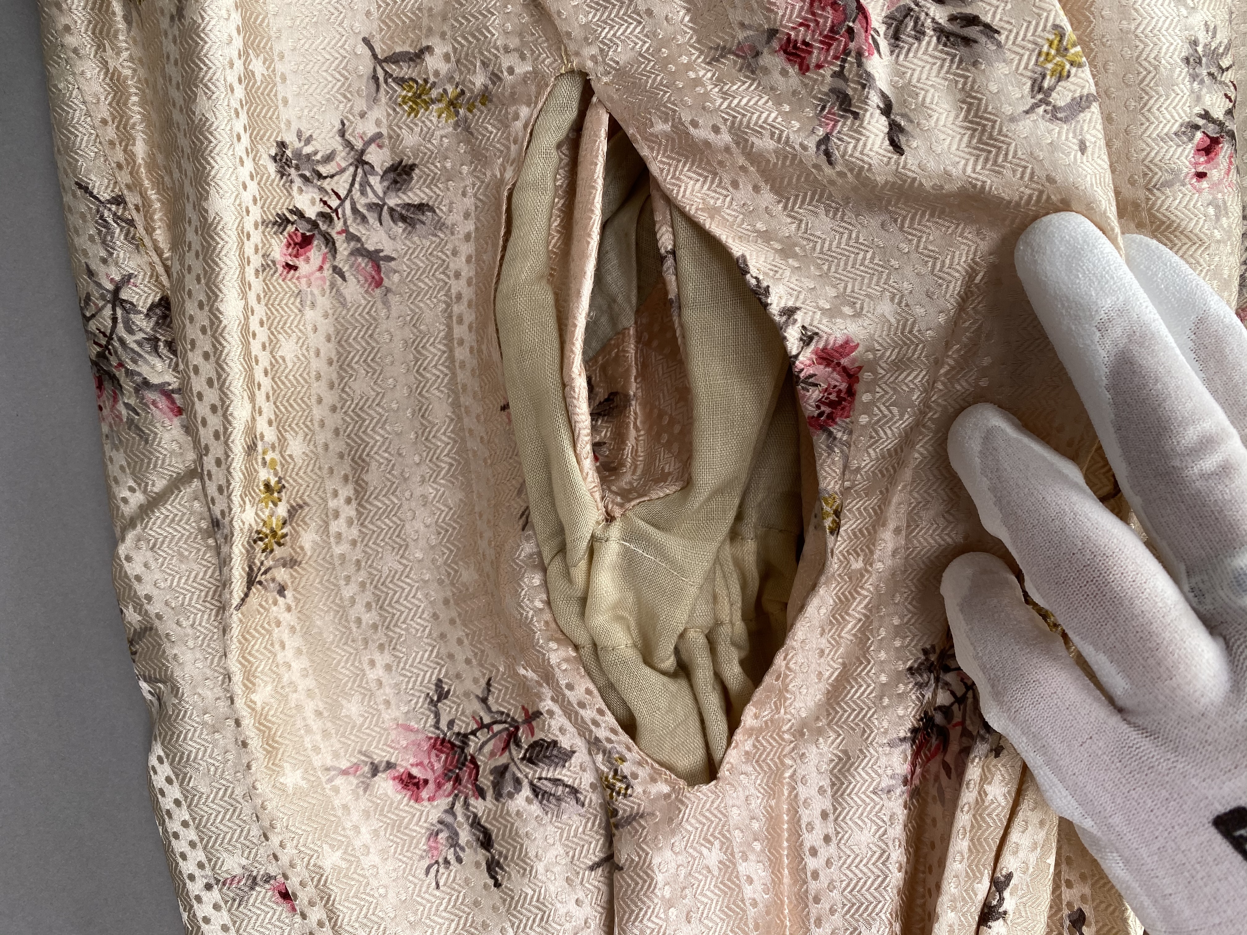 Sidenklänning som tillhört Irma von Geijer (1873-1959) Sidenklänning med två liv och kjol av ljusrosa mönstervävt siden med satinbotten med tryckta blommor i mörkt rosa, grönt och gult. Livet har försetts med ett foder av bomullssatin. Ärmarna har försetts med foder av enklare bomullsväv. Underkjolen har försetts med foder i bomull och linne. Klänningen är hand- och maskinsydd. Kortärmat liv sytt i 13 delar (varav 4 är ärm) med vid urringning och snörning baktill, rynkat framtill vid bröstet och försett med kort puffärm. Ett ripsband löper från vardera axeln ned i en spets till midjan med rosetter på axlar och vid spetsen nedtill. Livet är styvat med 13 insydda band i såväl metall som valbard. Det styvade livet avslutas i spets fram- och baktill. På insidan mitt fram ett ripsband som knäpps i midjan med en hyska och hake. Midjemåttet mäter 57 cm när bandet är knäppt. Livet har försetts med snörning baktill och består av 23 snörningshål med en hyska och hake i den övre kanten. Två tryckknappar är fästade på vardera sida ca 8 cm från snörning i den övre kanten troligen för att fästa i korsett (båda "hanar"). Långärmat liv sytt i 14 delar (varav 4 är ärm) med V-formad urringning och veckat tyg omlott över bröstet. Knäppning framtill med 17 hakar och hyskor, varav de första 4 från övre kant är växelvis placerade på båda sidor, resterande är placerade med hakar på högra sidan och hyskor på vänstra sidan. De nedersta 2-3 hyskorna är vridna inåt, osäkert om detta är avsiktligt eller inte. Veckat tyg går omlott över bröstet från båda axlar och döljer knäppningen. Veck från vänster axel fästs i motsatt sida med hake och hyska. Veck från höger axel går omlott och hänger löst, men det finns en trådrest ca 22 cm från axelsöm i urringning där det troligen suttit en knäppningsanordning. Nålhål finns på motsvarande höjd på vänster stycke. Nedre kant på det vänstra omlottlagda tyget är sytt med råa sömsmåner utåt. Då små vikveck är synliga är det möjligt att den nedre delen har vikts in under livet, men inga fästningsspår kan ses. Bakstycket går ner i en skört i ryggen, i övrigt slätt. Livet är styvat med 11 insydda band av metall. På insidan, baktill, ett ripsband som knäpps i midjan med en hyska och hake. Midjemåttet när bandet är knäppt är 58 cm. Livet har smala ärmar med liten puff och kort sprund i ärmslutet. Livet är märkt "Geijer" med en rund papperslapp som fästs i livets axelparti. Kjolen är sydd i 6 våder (4 baktill och 2 framtill). Kjolen består av över- och underkjol. Överkjolen är mycket veckad baktill, men slät framtill. Underkjolen i linne har tre lager nedtill. Ett lager är i spets, det andra i plisserat linne och det tredje och yttre lagret i plisserat sidentyg. I midjelinningen, baktill, ett sprund knäppt med 3 hakor och hyskor i mässing. På underkjolens baksida är två dragskor sydda. Den första dragskon 30,5 cm ned från linningen och den andra 52 cm från linningen. Kjolen har en ficka på höger sida. Yttertyget har en öppning till fickan, som är sydd i underkjolen. Fickpåsen är av samma tyg som fodertyget, kantad i ficköppningen med samma tyg som överkjolen.