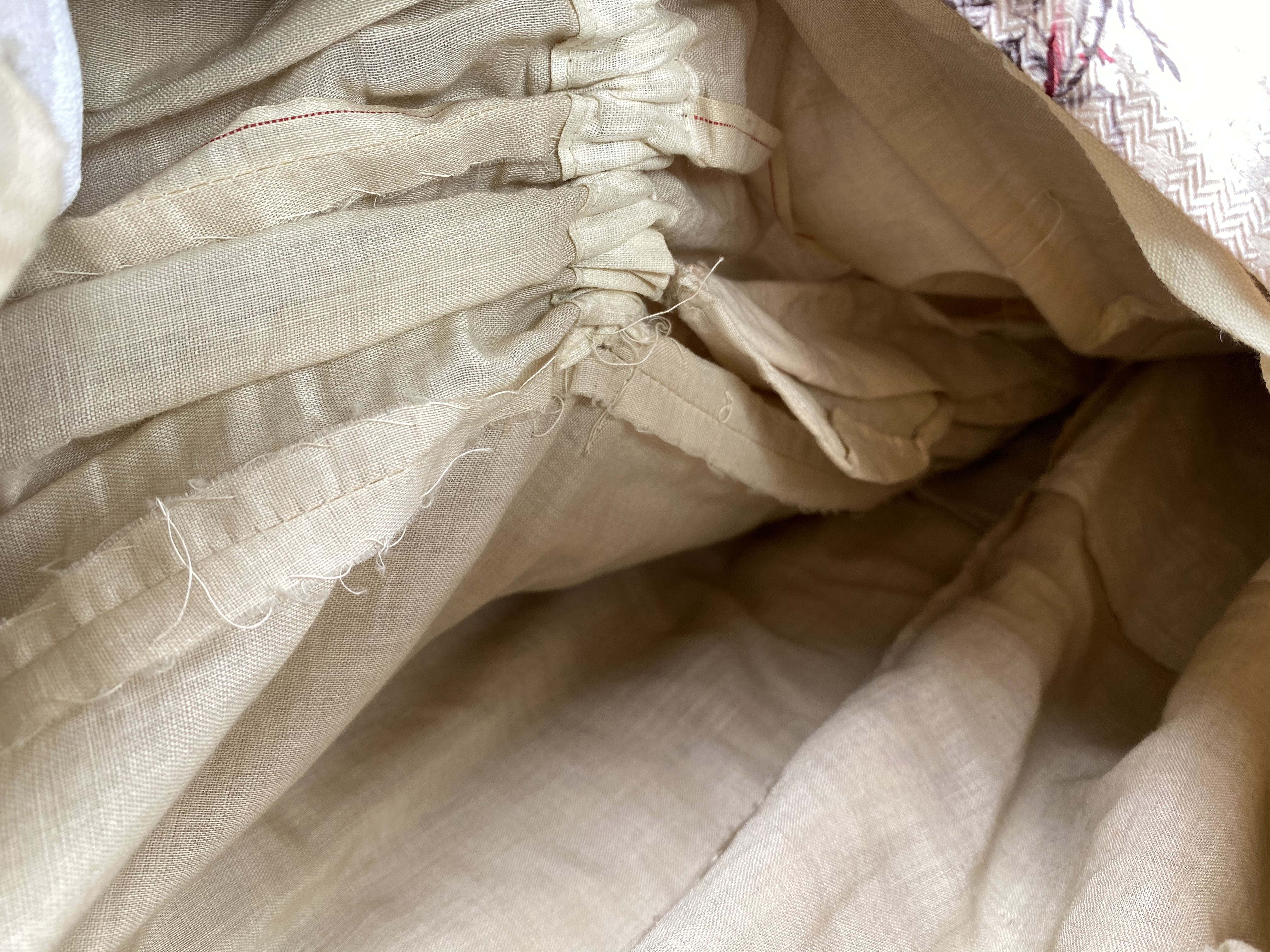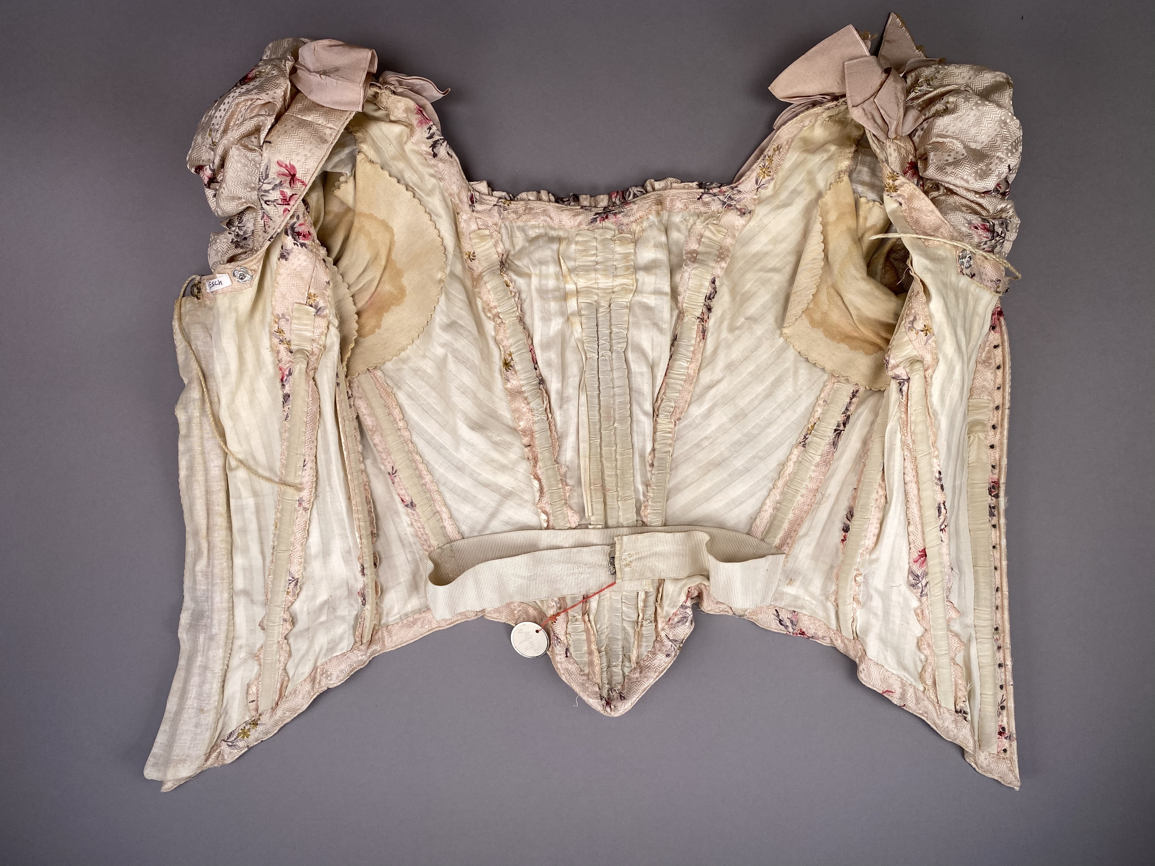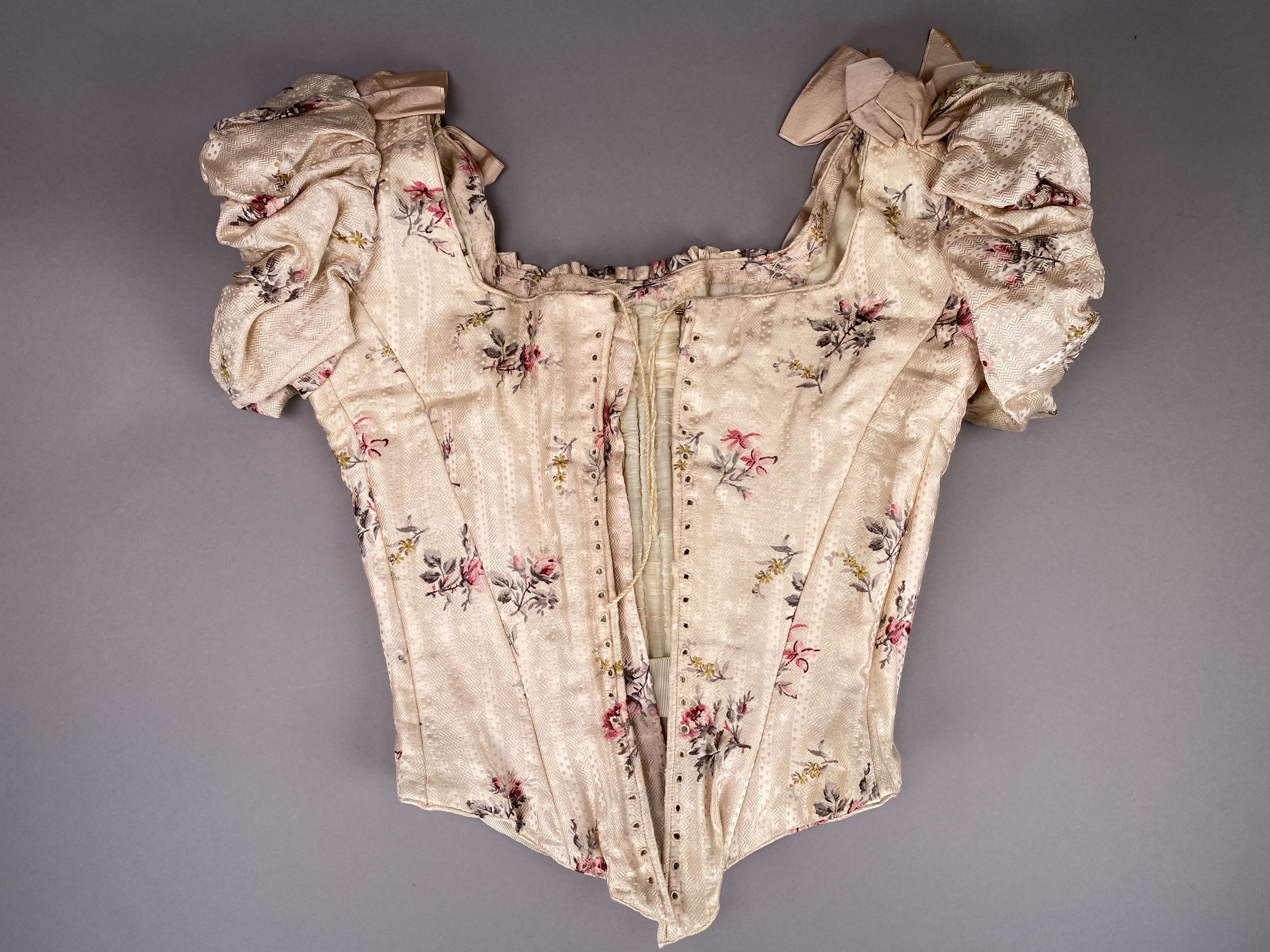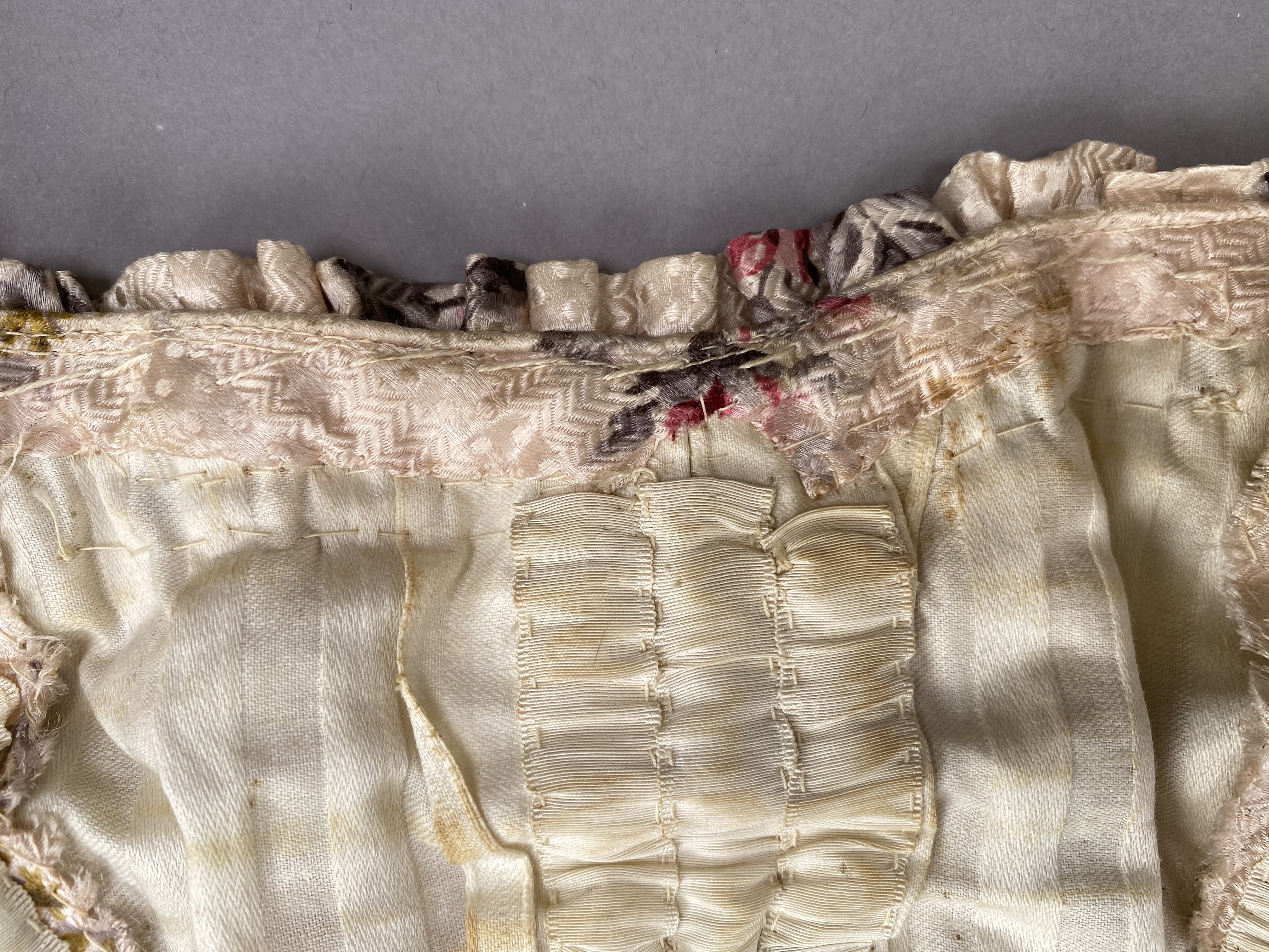 Sidenklänning som tillhört Irma von Geijer (1873-1959) Sidenklänning med två liv och kjol av ljusrosa mönstervävt siden med satinbotten med tryckta blommor i mörkt rosa, grönt och gult. Livet har försetts med ett foder av bomullssatin. Ärmarna har försetts med foder av enklare bomullsväv. Underkjolen har försetts med foder i bomull och linne. Klänningen är hand- och maskinsydd. Kortärmat liv sytt i 13 delar (varav 4 är ärm) med vid urringning och snörning baktill, rynkat framtill vid bröstet och försett med kort puffärm. Ett ripsband löper från vardera axeln ned i en spets till midjan med rosetter på axlar och vid spetsen nedtill. Livet är styvat med 13 insydda band i såväl metall som valbard. Det styvade livet avslutas i spets fram- och baktill. På insidan mitt fram ett ripsband som knäpps i midjan med en hyska och hake. Midjemåttet mäter 57 cm när bandet är knäppt. Livet har försetts med snörning baktill och består av 23 snörningshål med en hyska och hake i den övre kanten. Två tryckknappar är fästade på vardera sida ca 8 cm från snörning i den övre kanten troligen för att fästa i korsett (båda "hanar"). Långärmat liv sytt i 14 delar (varav 4 är ärm) med V-formad urringning och veckat tyg omlott över bröstet. Knäppning framtill med 17 hakar och hyskor, varav de första 4 från övre kant är växelvis placerade på båda sidor, resterande är placerade med hakar på högra sidan och hyskor på vänstra sidan. De nedersta 2-3 hyskorna är vridna inåt, osäkert om detta är avsiktligt eller inte. Veckat tyg går omlott över bröstet från båda axlar och döljer knäppningen. Veck från vänster axel fästs i motsatt sida med hake och hyska. Veck från höger axel går omlott och hänger löst, men det finns en trådrest ca 22 cm från axelsöm i urringning där det troligen suttit en knäppningsanordning. Nålhål finns på motsvarande höjd på vänster stycke. Nedre kant på det vänstra omlottlagda tyget är sytt med råa sömsmåner utåt. Då små vikveck är synliga är det möjligt att den nedre delen har vikts in under livet, men inga fästningsspår kan ses. Bakstycket går ner i en skört i ryggen, i övrigt slätt. Livet är styvat med 11 insydda band av metall. På insidan, baktill, ett ripsband som knäpps i midjan med en hyska och hake. Midjemåttet när bandet är knäppt är 58 cm. Livet har smala ärmar med liten puff och kort sprund i ärmslutet. Livet är märkt "Geijer" med en rund papperslapp som fästs i livets axelparti. Kjolen är sydd i 6 våder (4 baktill och 2 framtill). Kjolen består av över- och underkjol. Överkjolen är mycket veckad baktill, men slät framtill. Underkjolen i linne har tre lager nedtill. Ett lager är i spets, det andra i plisserat linne och det tredje och yttre lagret i plisserat sidentyg. I midjelinningen, baktill, ett sprund knäppt med 3 hakor och hyskor i mässing. På underkjolens baksida är två dragskor sydda. Den första dragskon 30,5 cm ned från linningen och den andra 52 cm från linningen. Kjolen har en ficka på höger sida. Yttertyget har en öppning till fickan, som är sydd i underkjolen. Fickpåsen är av samma tyg som fodertyget, kantad i ficköppningen med samma tyg som överkjolen.