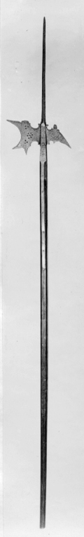 Klinga med fyrsidigt tvärsnitt. Yxblad med konkav egg. Yxbladets nederdel konturerad med rakt nedåtstickande spets, överdelen likadant konturerad, spetsen avbruten. Yxbladet genombrutet av tre små, runda hål upptill och nedtill samt sju hål i mitten. Hake nedåtböjd, överkanten med rakt uppstickande spets, två mindre utskott och intill holken en rund inskärning. På undersidan en rundinskärning, udd och spets. Två skenor, upptill breda, därnedanför smalare, l: 680 resp. 580 mm, fastnitade vid skaftet. Skaft av trä, fyrsidigt med fasade hörn, mörkt brunbetsat.