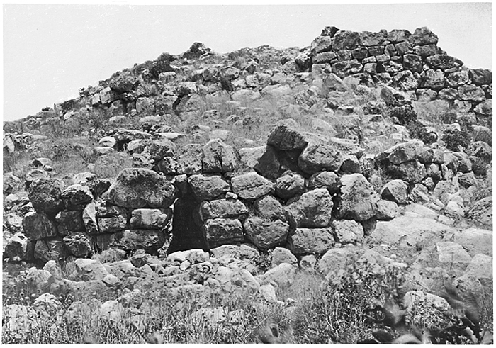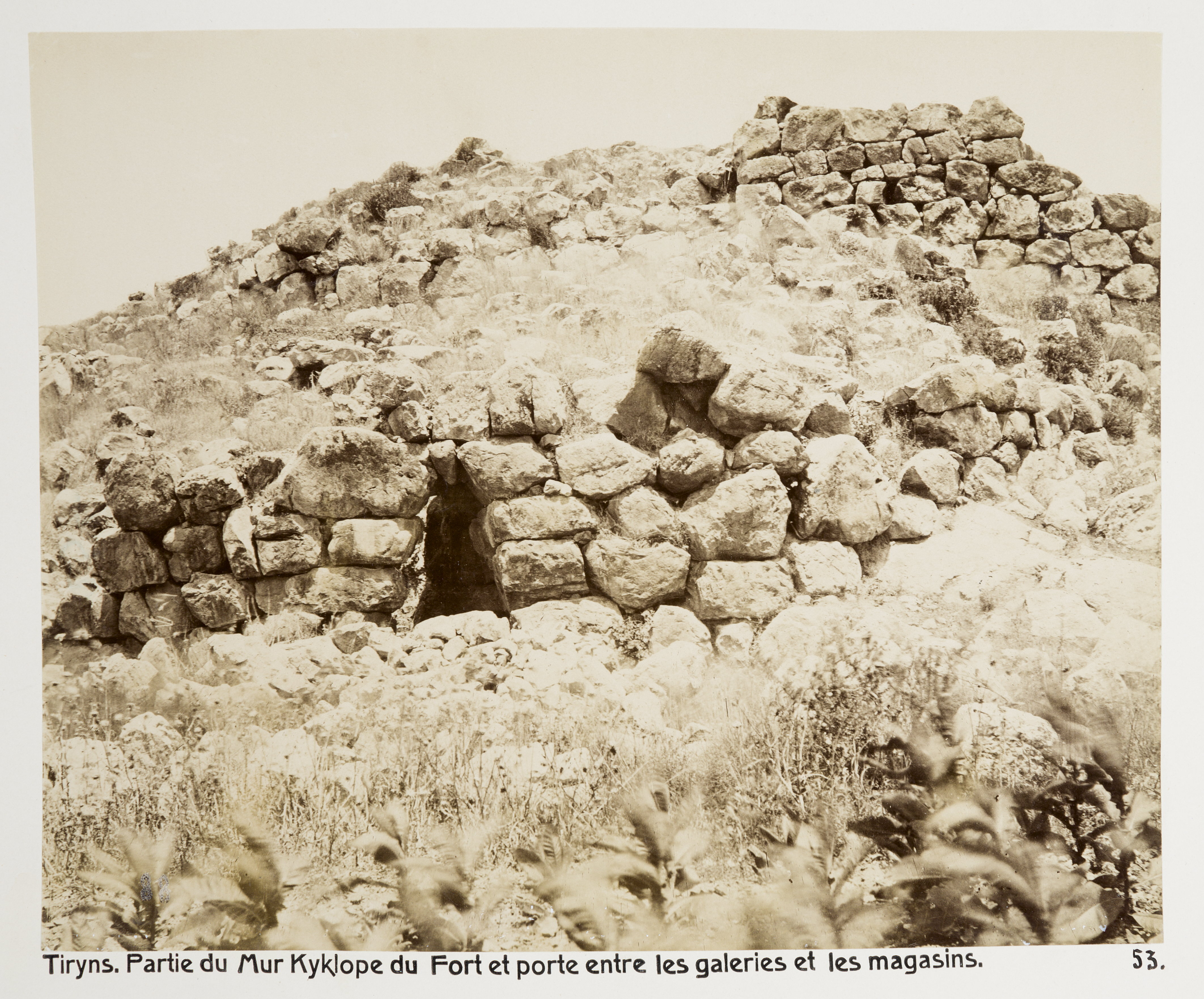 Del av den cyklopiska muren runt fortet i Tiryns. Text på originalet: "Tiryns. Partie du Mur Kyklope du Fort et porte entre les galeries et les magasins." Foto från resa genom Grekland, Makedonien och Serbien, 15 mars-6 juni 1896. Fotografierna LXVI:K.18.-147. är köpta av Wilhelmina von Hallwyl, f. Kempe på Korfu samt i Patras, Nafplion, Aten, Thessaloniki och Belgrad. Med på resan var maken Walther von Hallwyl och fröken Ida Uhse. Uppgifterna kommer från Ida Uhses reseanteckningar.