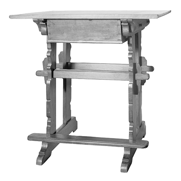 BORD (bockbord). Sannolikt schweiziskt arbete från 1600-talet. Av valnöt, delvis gran. Inköpt av Wilhelmina von Hallwyl 9 oktober 1893 hos antikhandlare Johann Bossard, Luzern, för 60 CHF. Flera schweiziska bord av denna typ finns i Hallwylska samlingen; jmfr. VI:I:A.a.07., VI:I:A.a.08., VI:I:A.a.09. och VI:I:A.a.20.