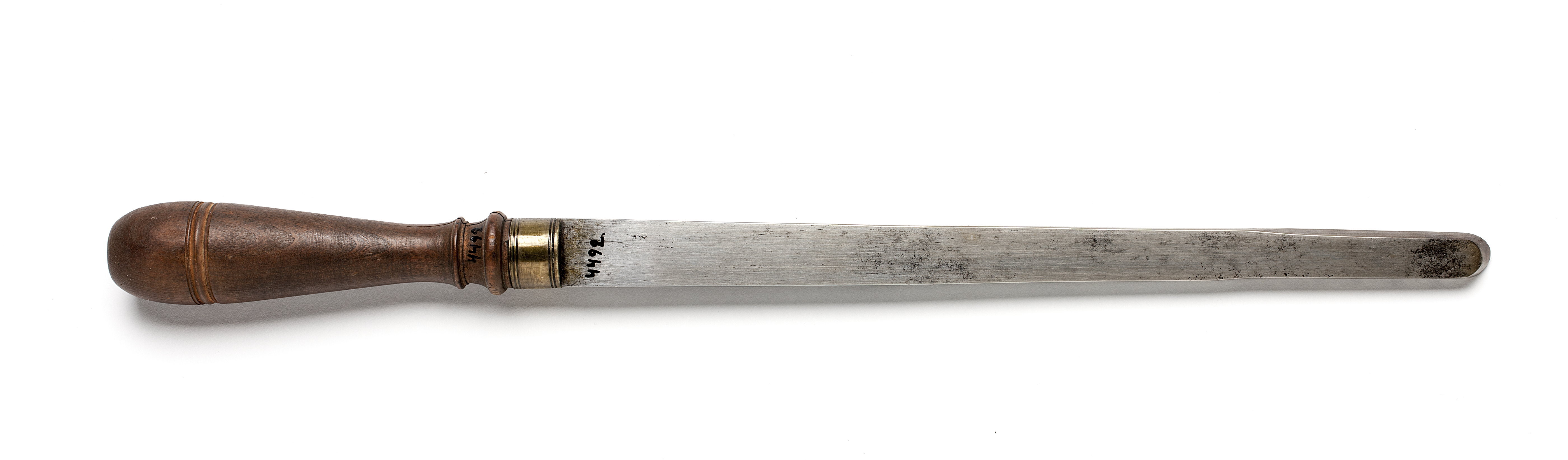 Klinga med rektangulär genomskärning. Stämplat på klingan: "EP". Svarvat skaft av päronträ, med två vulster nedtill ("rydboholmstyp"). Mässingsring. Stämplat på skaftet: "NB".