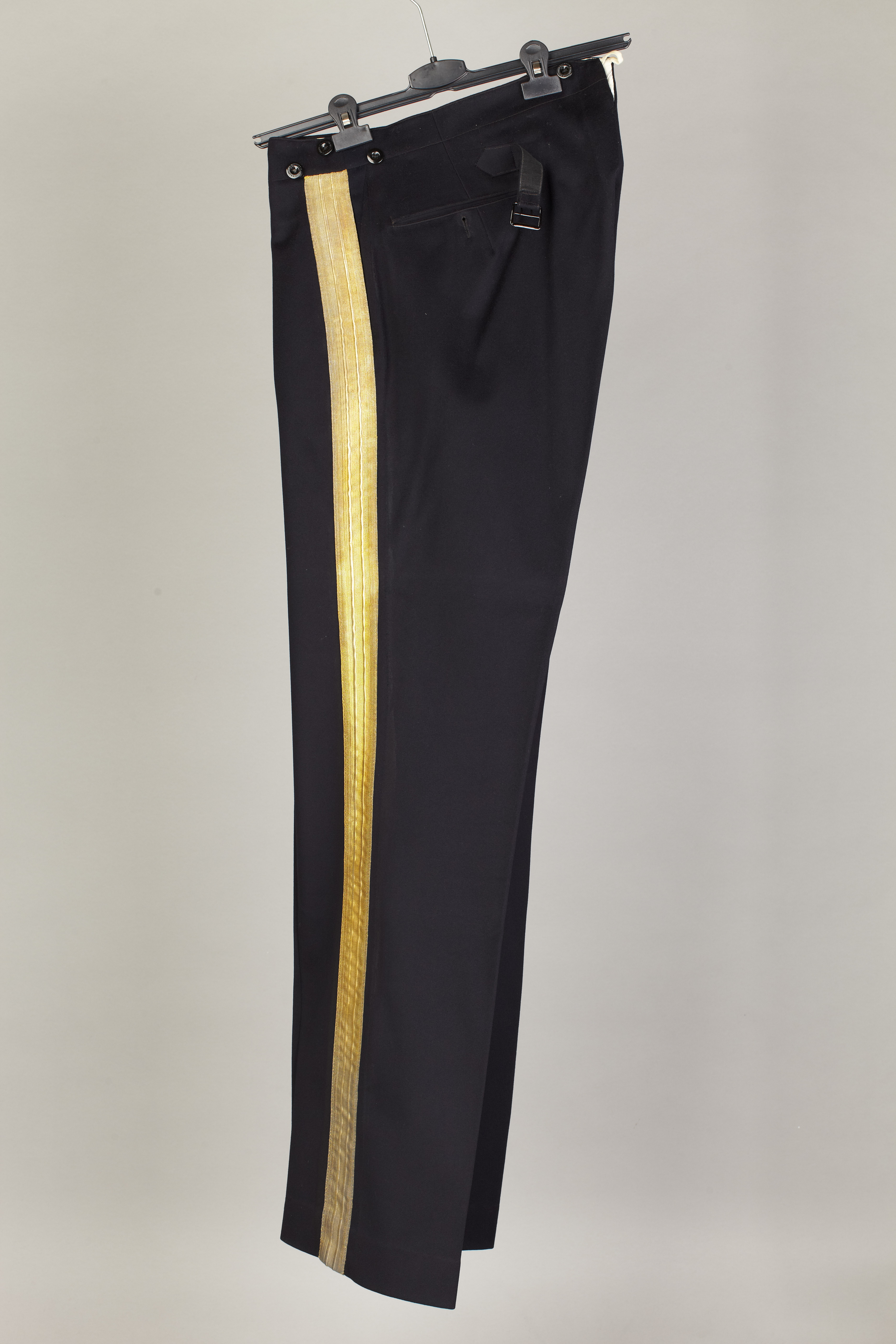 Långbyxor av mörkblått kläde, knäppta med gylf med sex knappar, d: 15 mm, firmanamn: "ZITTORIN &LUNDVIK". På linningen nio knappar d: 17 mm, fem av dessa lika som de i gylfen, en med text: "FORGENTLEMEN", tre st släta. Fickor i sidsömmen, utmed denna 46 mm bred guldgalon. Två bakfickorknäppta med knapp. Nedanför linningen baktill spänntampar med rektangulär sölja med bokstäverna: "F.W. & S." samt dubbla taggar. I mittsömmen v-format sprund sammanhållet av ett smalt bomullsband. Foder upptill på insidan av siden med snedställda blå och vita ränder, därnedanför vitt linne.