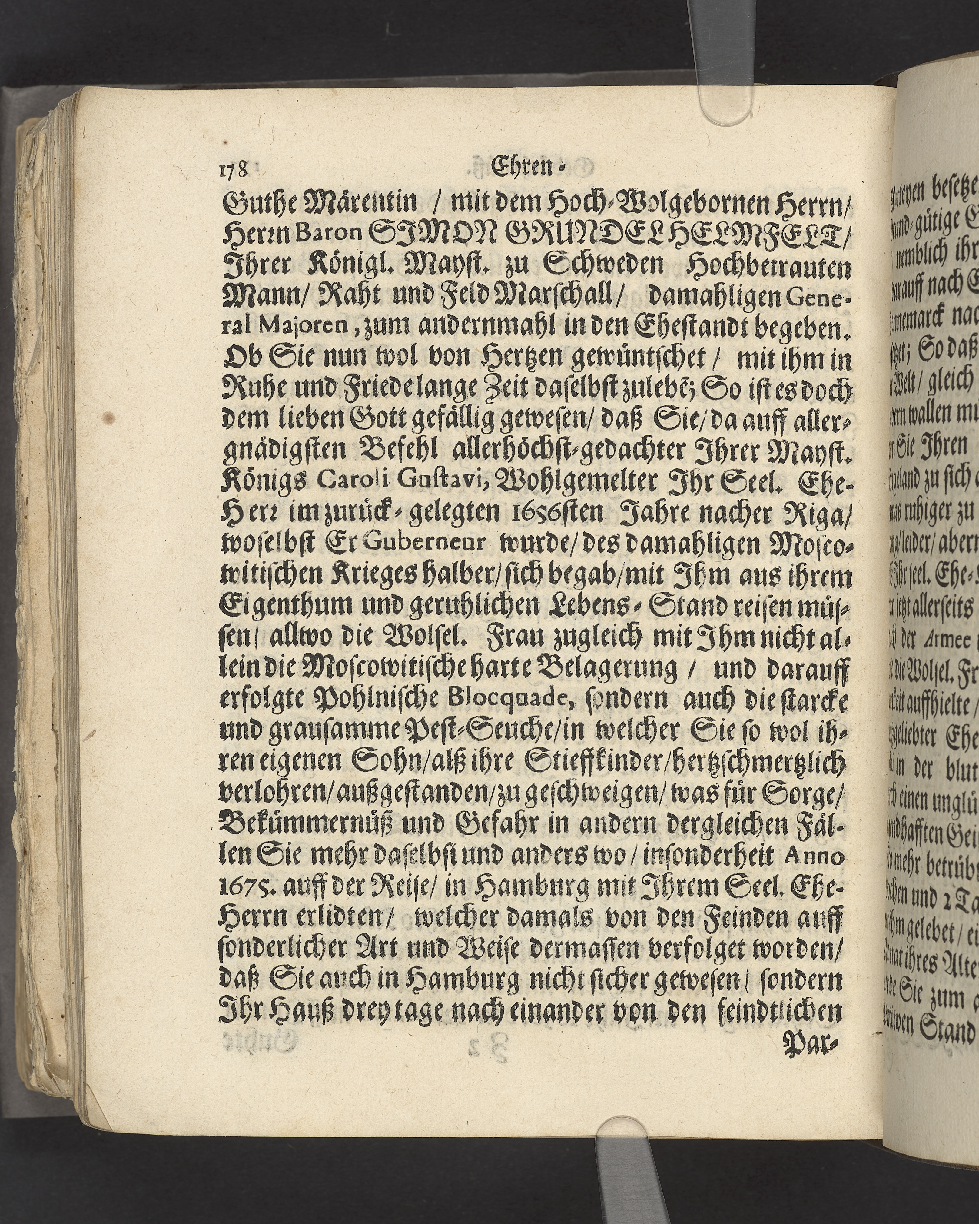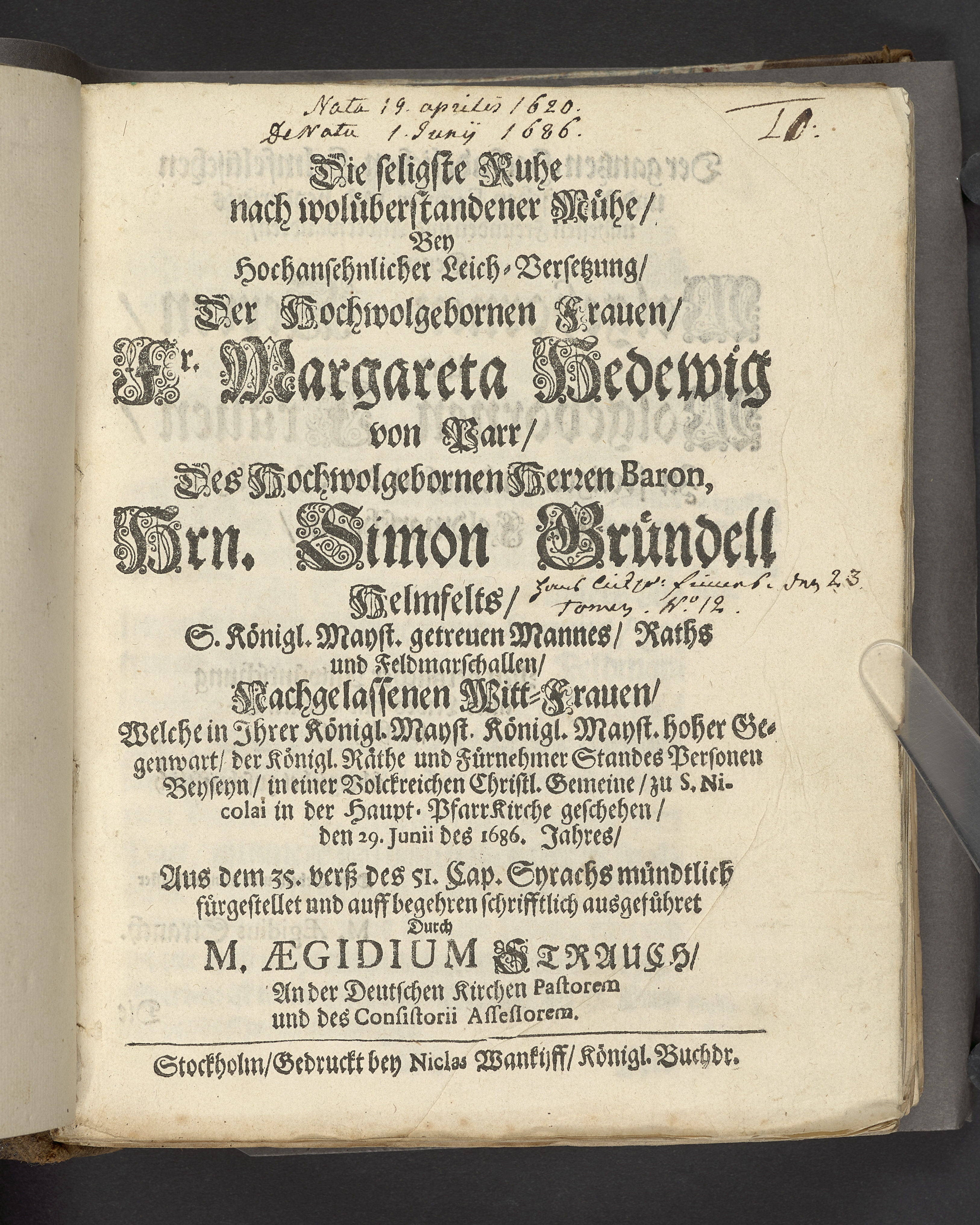 Die seligste Ruhe wolüberstandener Mühe, bey hochansehnlicher Leich-Versetzung, der hochwolgebornen Frauen, Fr. Margareta Hedewig von Parr, des Hochwolgebornen Herren Baron, Hrn Simon Grundell Helmfelts ... nachgelassenen Witt-Frauen geschehen den 29 Junii des 1686 Jahres ... durch M. Aegidium Strauch ... Stockholm, gedruckt bey Niclas Wankijff...