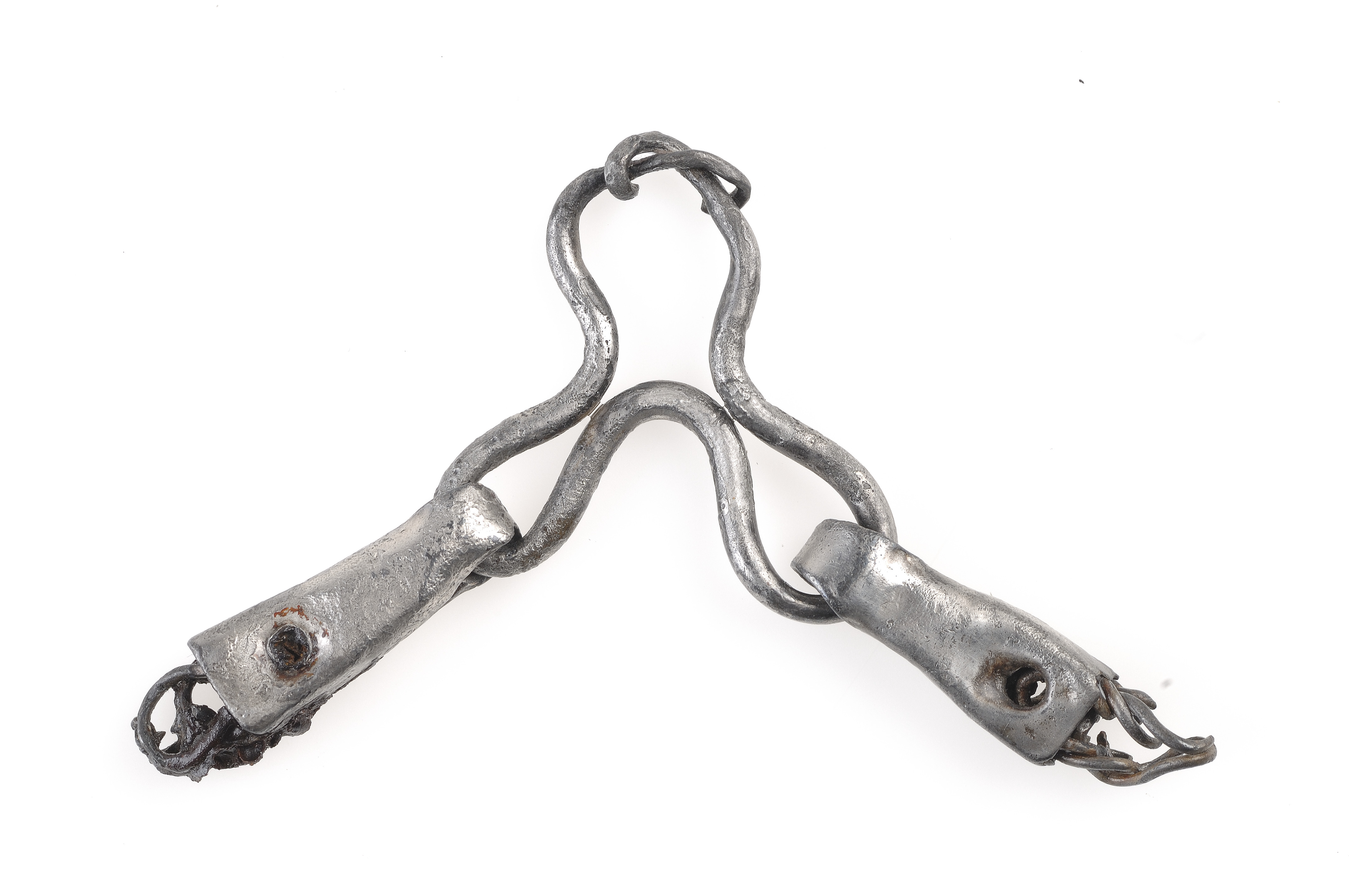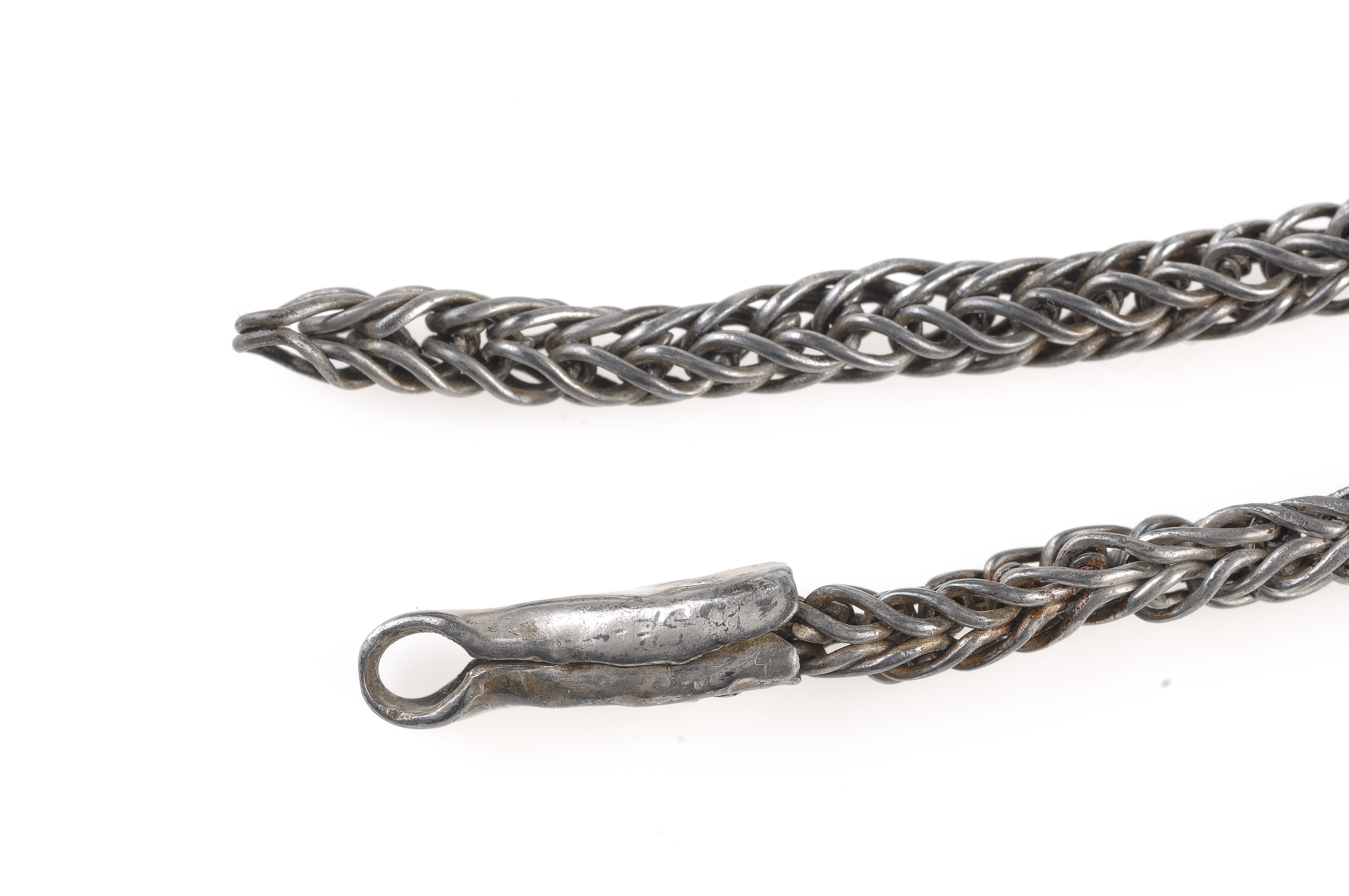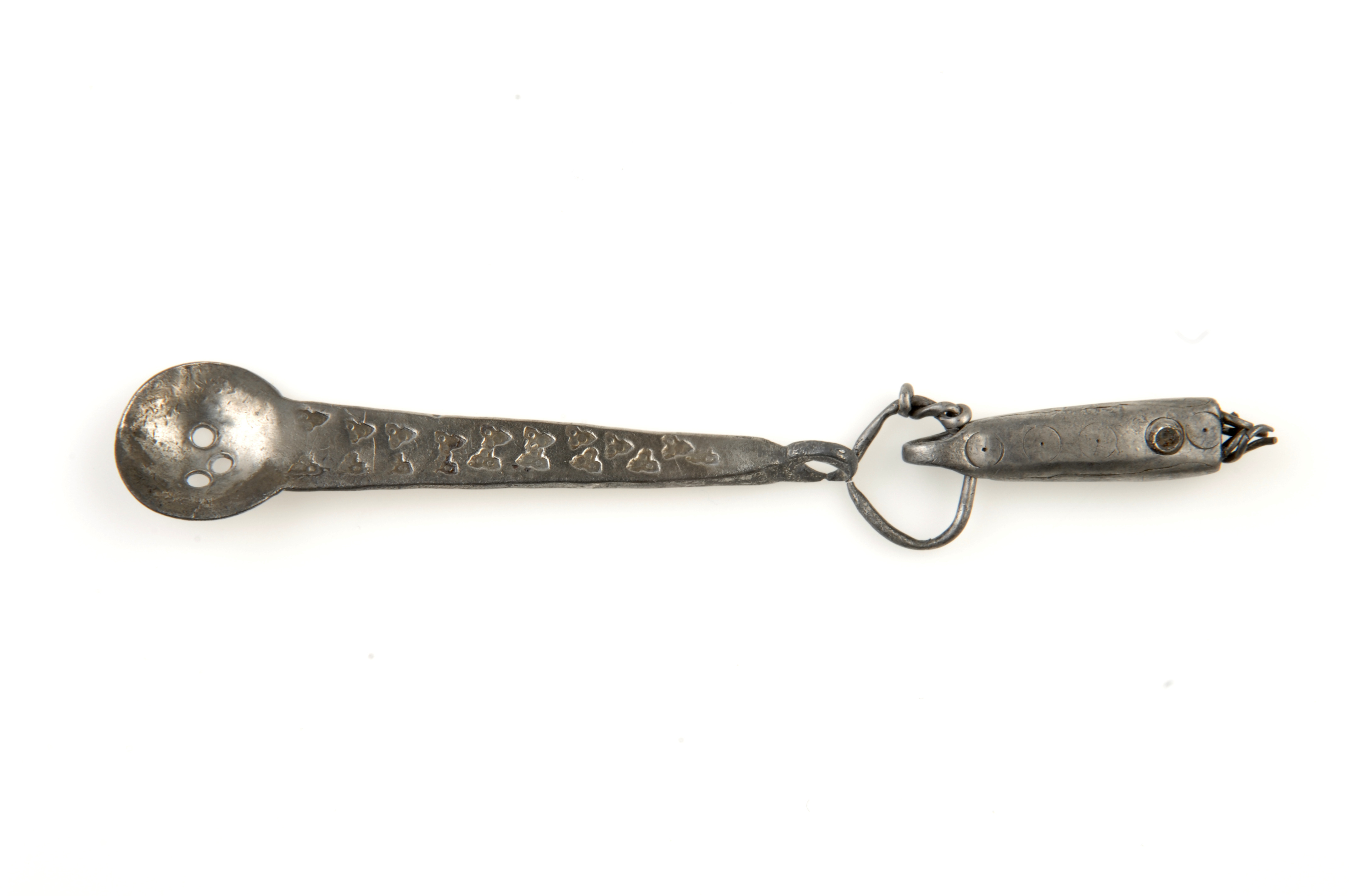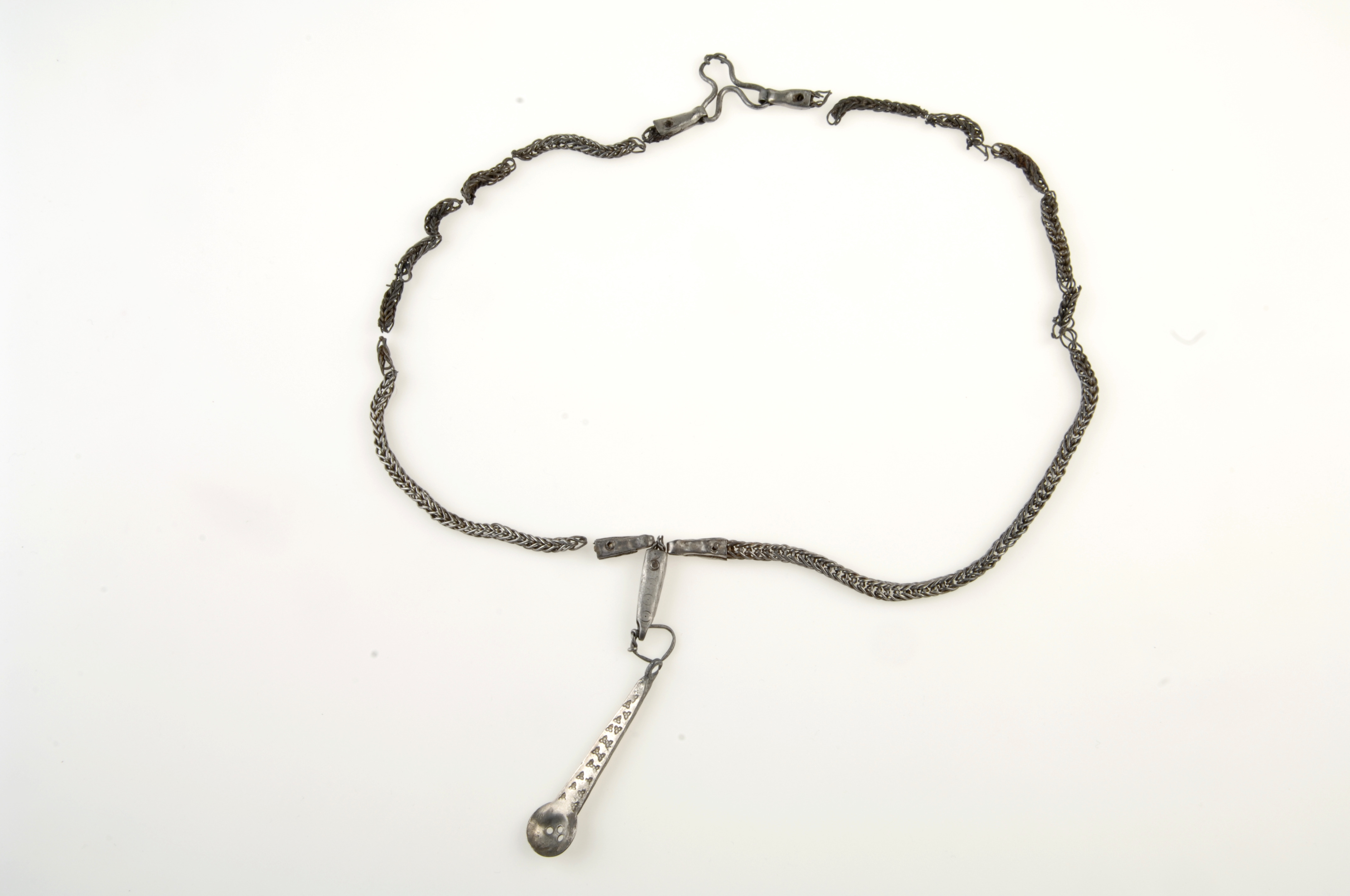 Silverkedjor, klöverbladsformig hållare av silver-tråd med 2 kedjefästen, hållare, sked med 3 hål.