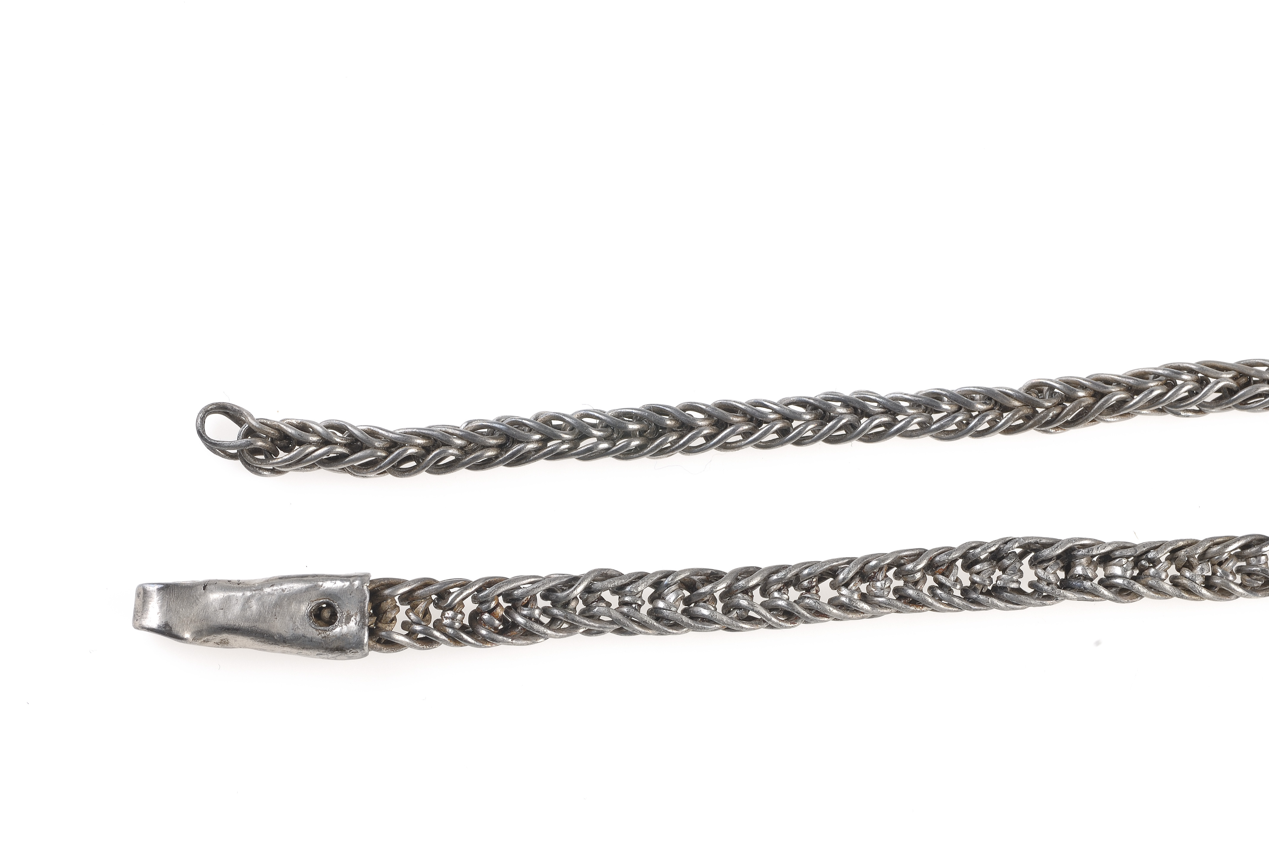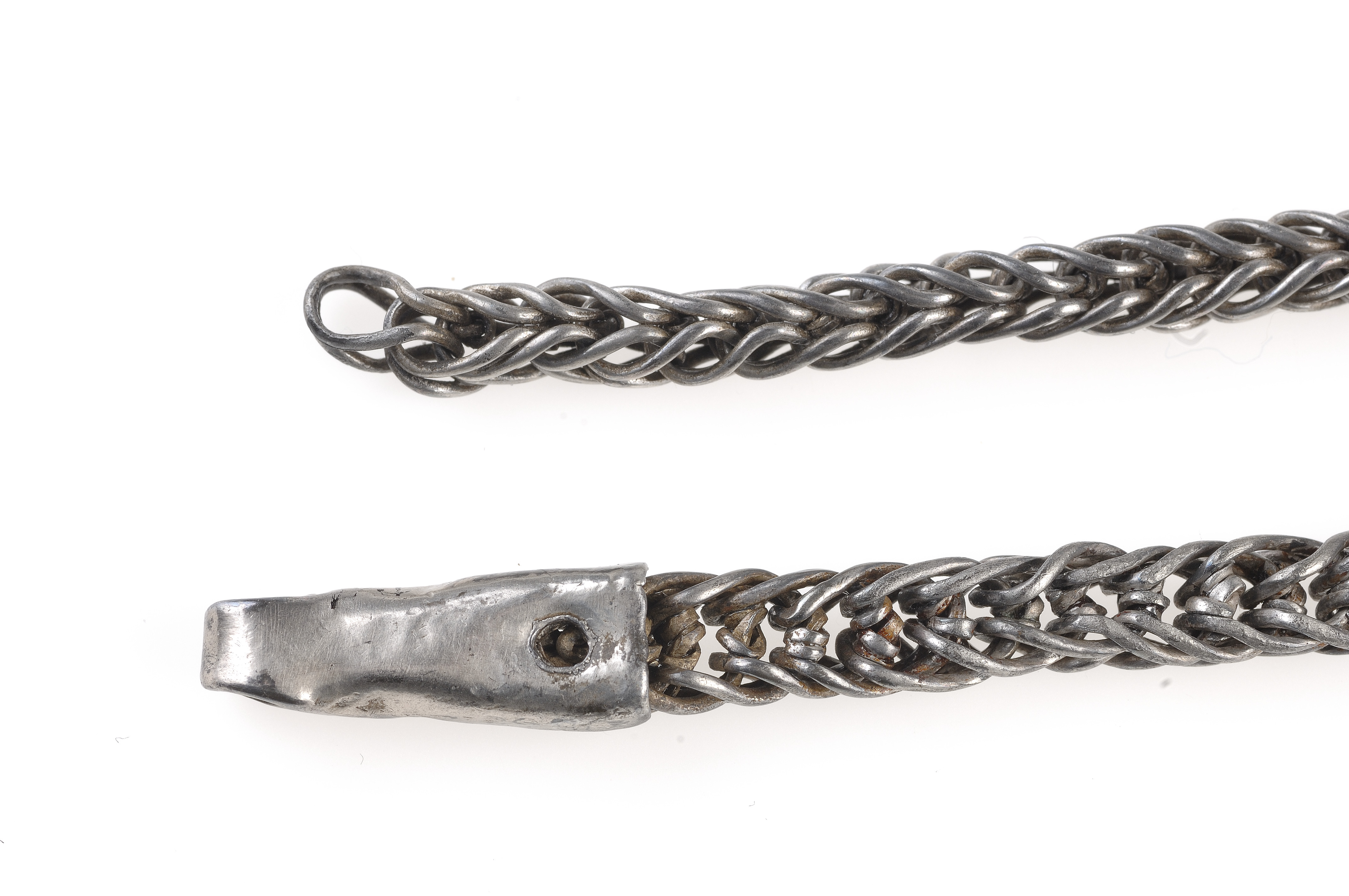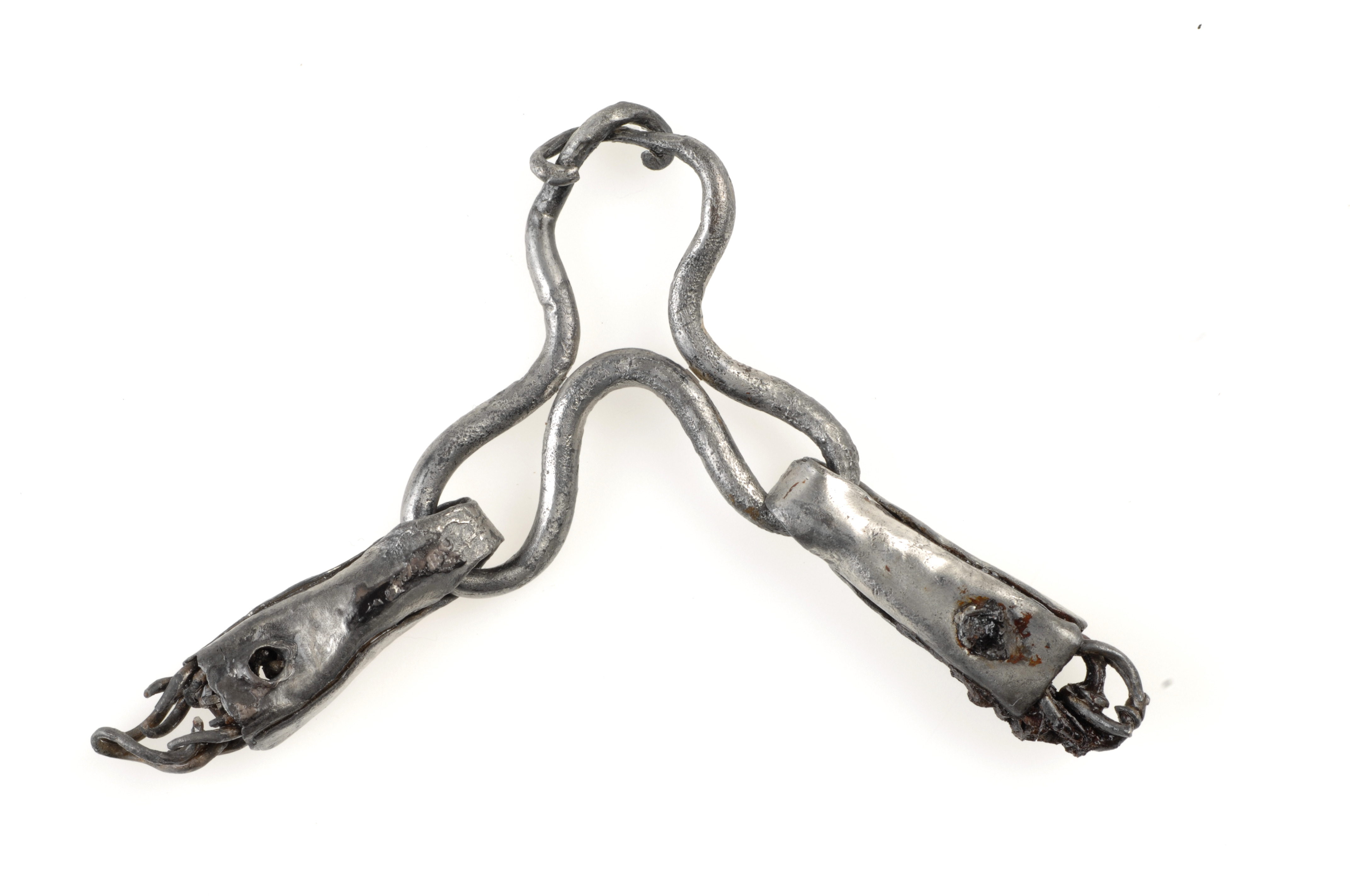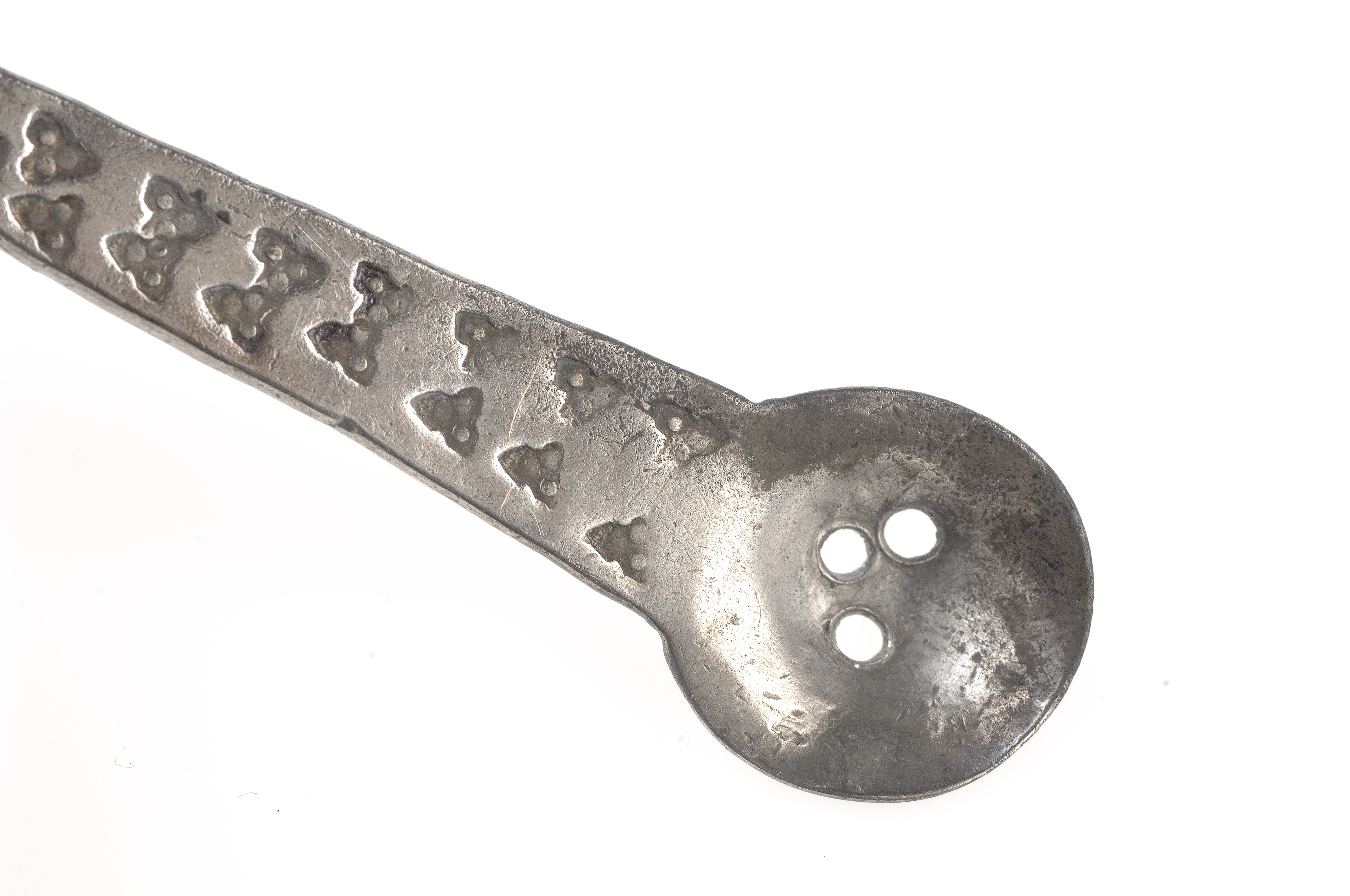 Silverkedjor, klöverbladsformig hållare av silver-tråd med 2 kedjefästen, hållare, sked med 3 hål.