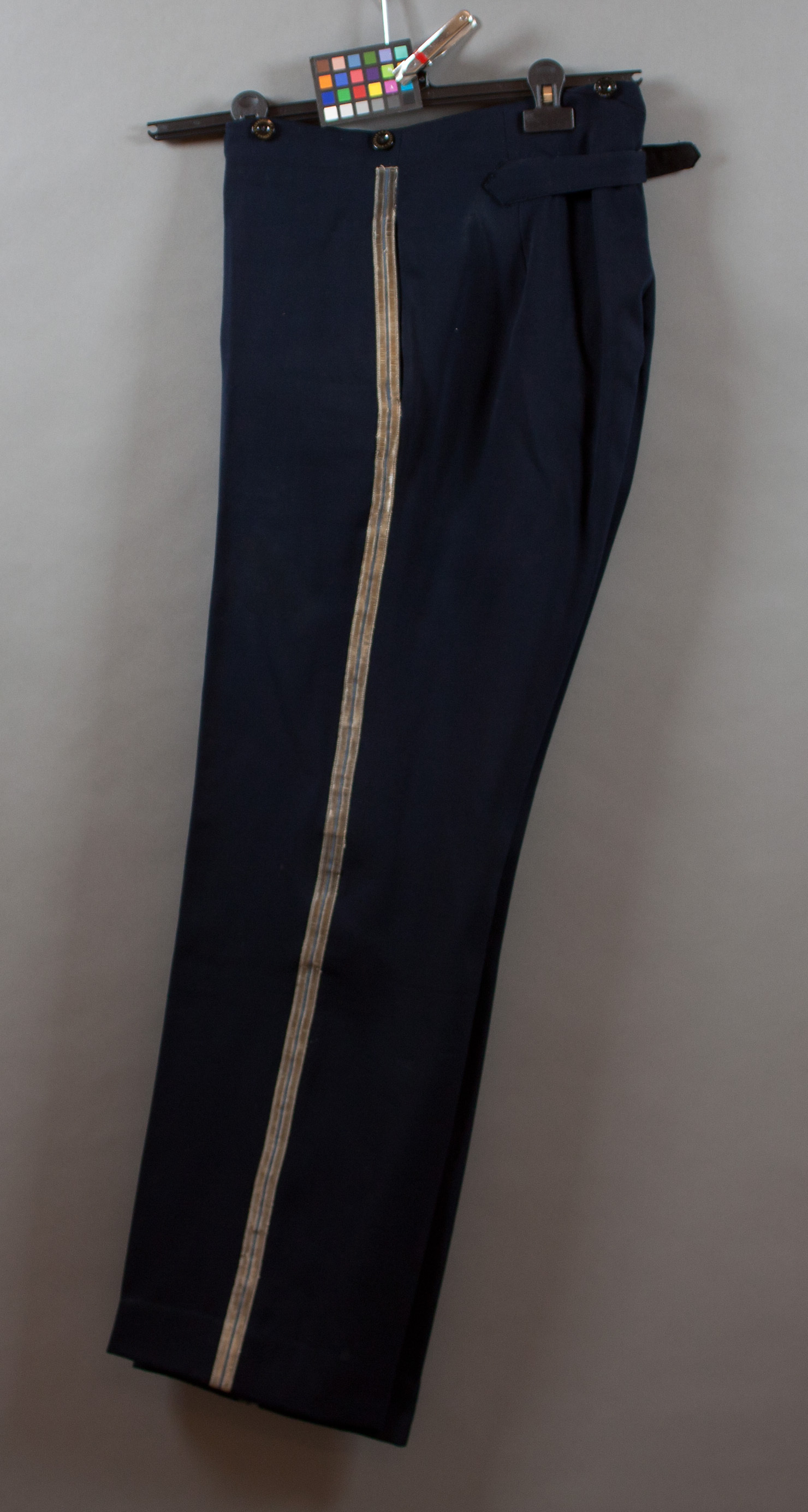 Byxor av mörkblå yllediagonal, knäppta med gylf med fem svarta knappar. I linningensex knappar med firmamärke: " F. SVEDBERG STOCKHOLM". Fickor i sidsömmen, utmed denna en smal silvergalon med invävd blå tråd. En bakfickasamt spänntampar. På den ena firmaetikett: F.SVEDBERG STOCKHOLM // KORNHAMNSTORG 47// Herr Stråle // Dato 1931." Foder i linningen av vitt siden med smala lila ränder. Fickor av gulvitt tjocktbomull.
