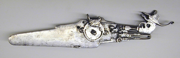 Hjullåsmusköt, 1600-tal, sammansatt av ursprungligen en samhörande delar, stockens inläggningar kompletterade under 1800-talet.