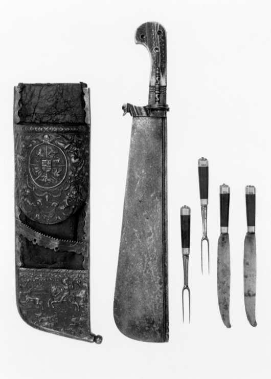Balja av mörkbrunt läder med tre beslag av mörkanlöpt stål, det övre och nedre med reliefornerad, driven och ciselerad dekor. På utsidan ett kraftigt utbyggt fodral med fem hål för bestick (varav ett saknas). Det övre beslaget stort, konvext med rundat avskuren nederdel. På beslaget en oval kartusch med Holstein-Gottorps vapen och därovanför en liten dödskalle. Kartuschen omgiven av fyra figurer: två kvinnofigurer lutar sig mot vapenskölden. Den till högerhåller ett klot i handen. Nedanför till vänster en flöjtblåsare, till höger en trumslagare. På baksidan vinkelformig nederkant. Det mellersta beslaget i form av ett snedställt stålband med sågtandad överkant och konturerad nederkant samt två små hål. Det nedre beslaget med ornering i form av ett jaktmotiv - en ryttare och två hundar jagar en hjort, upptill lövverk. Baksidan med vågformig överkant. Nedtill vid ryggsidan en kulformig knapp. Baljans kanter med släta beslag. Deposition (senare inlöst) till LRK, ur ingenjör Carl Rombert Lamms samling, Näsby nr 2004.