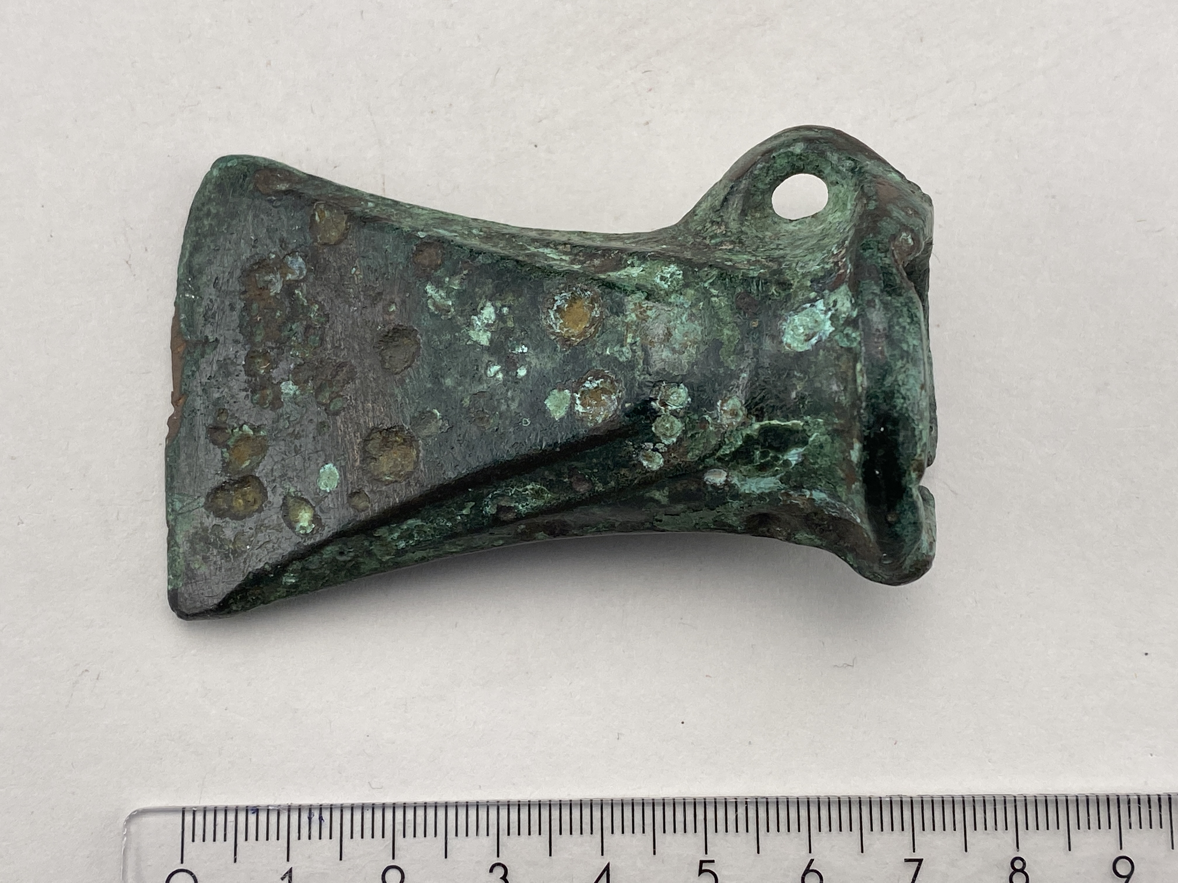 Holkyxa av brons med rund holköppning och med ca 1 cm:s bred ås runt övre kanten jämte ögla. Gjutsömmar på de runda kanterna.