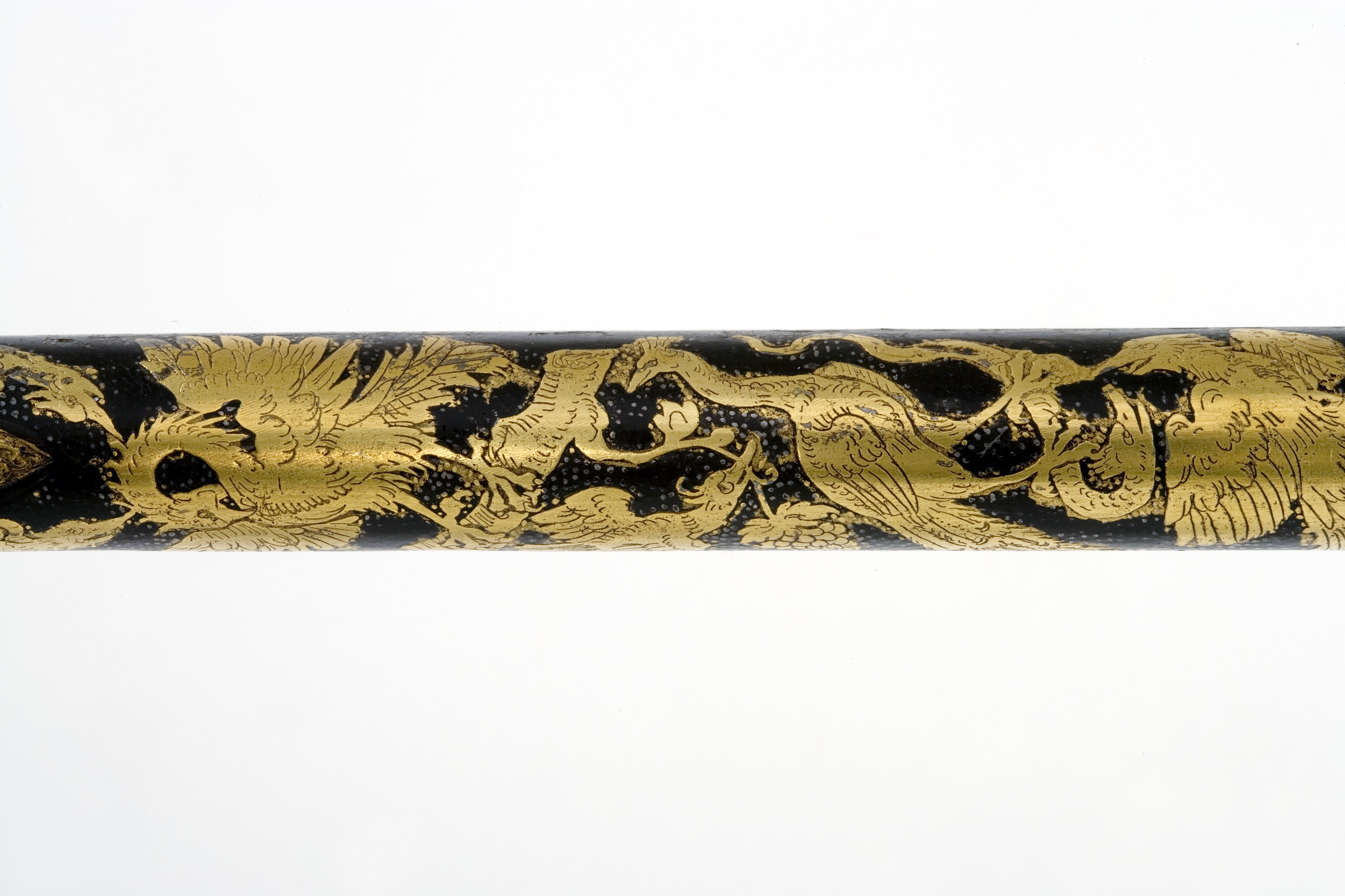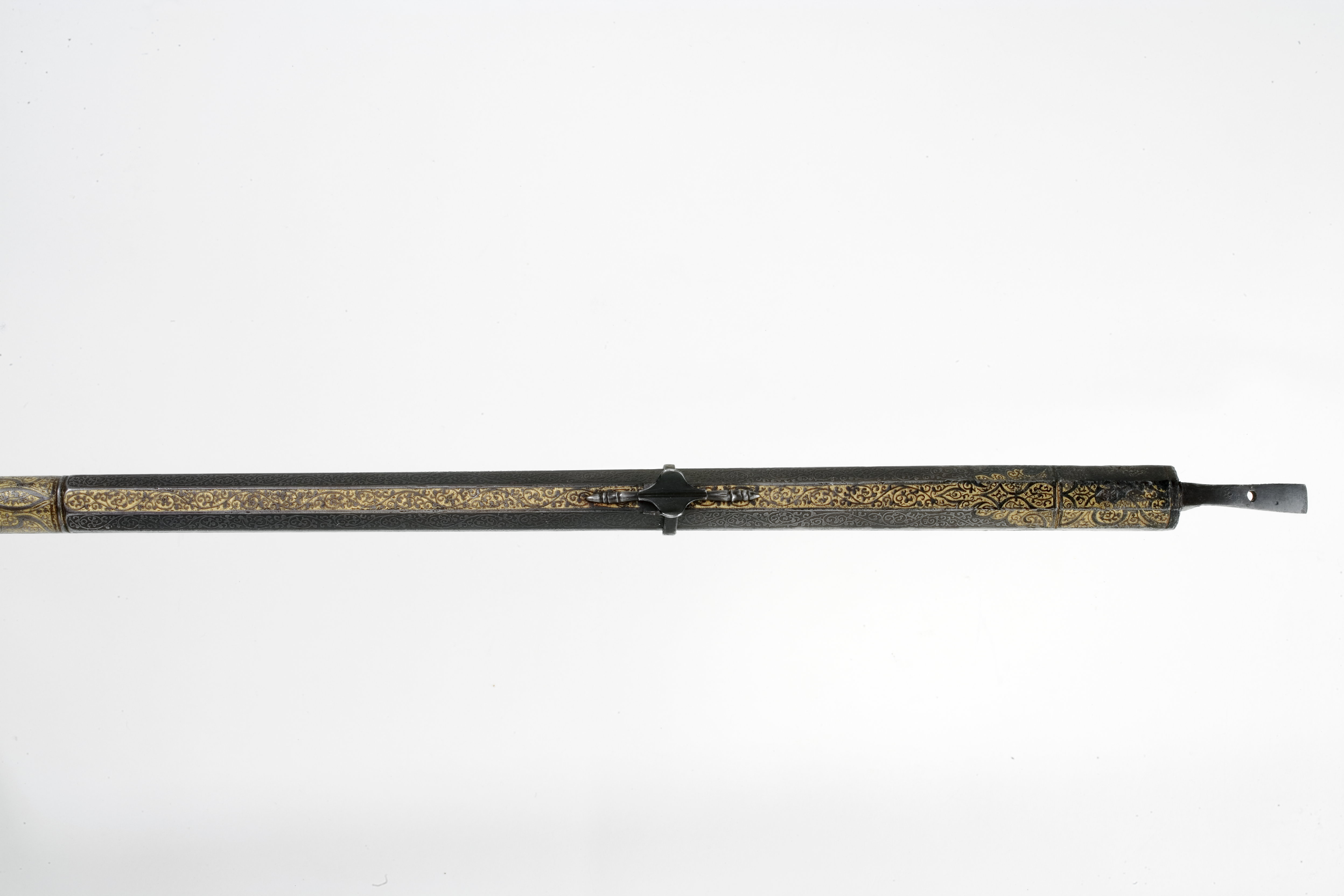 Rund, slätborrad pipa av brunerat stål. Åttsidig kammare avgränsat med ringvulster. Kammarens ovansida ornerad med etsad dekor i form av rankor, baktill och längs ryggen är rankan svartlackerad mot guldgrund. Baktill på kammaren två stämplar: en sabel (Stöckelnr 5812, LRK vägl.1921:273) och Augsburgs kontroll (Stöckelnr 1298, LRK vägl.1921:233, ca 1550-1600). På pipan etsad dekor, närmast kammaren i form av bandornament och rankor mot guldbotten, därframför i två fält olika fåglar, bl a en påfågel och en fågel Fenix (?) i guld mot lackerad svartbrun botten med etsade prickar, på mitten vid mynningen band- och rankornament mot lackerad, svartbrun guldgrund. Bakåt breddat, tvärt avskuret svansskruvblad. På pipans h. sida ett invändigt gängat hål, d: 9 mm. Riktmedel: Stort skålat gördelsikte av stål fäst med ring runt pipan. Knoppkorn av mässing. Fästning: Tre häften.