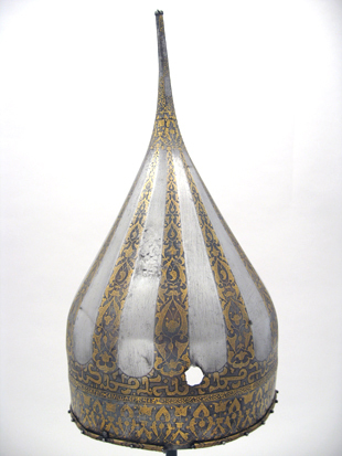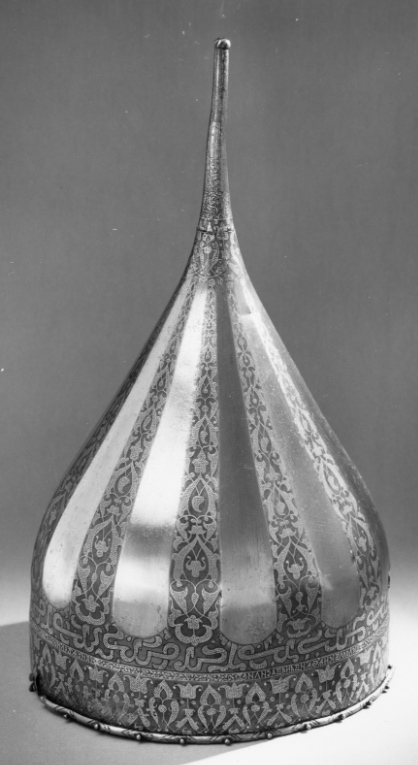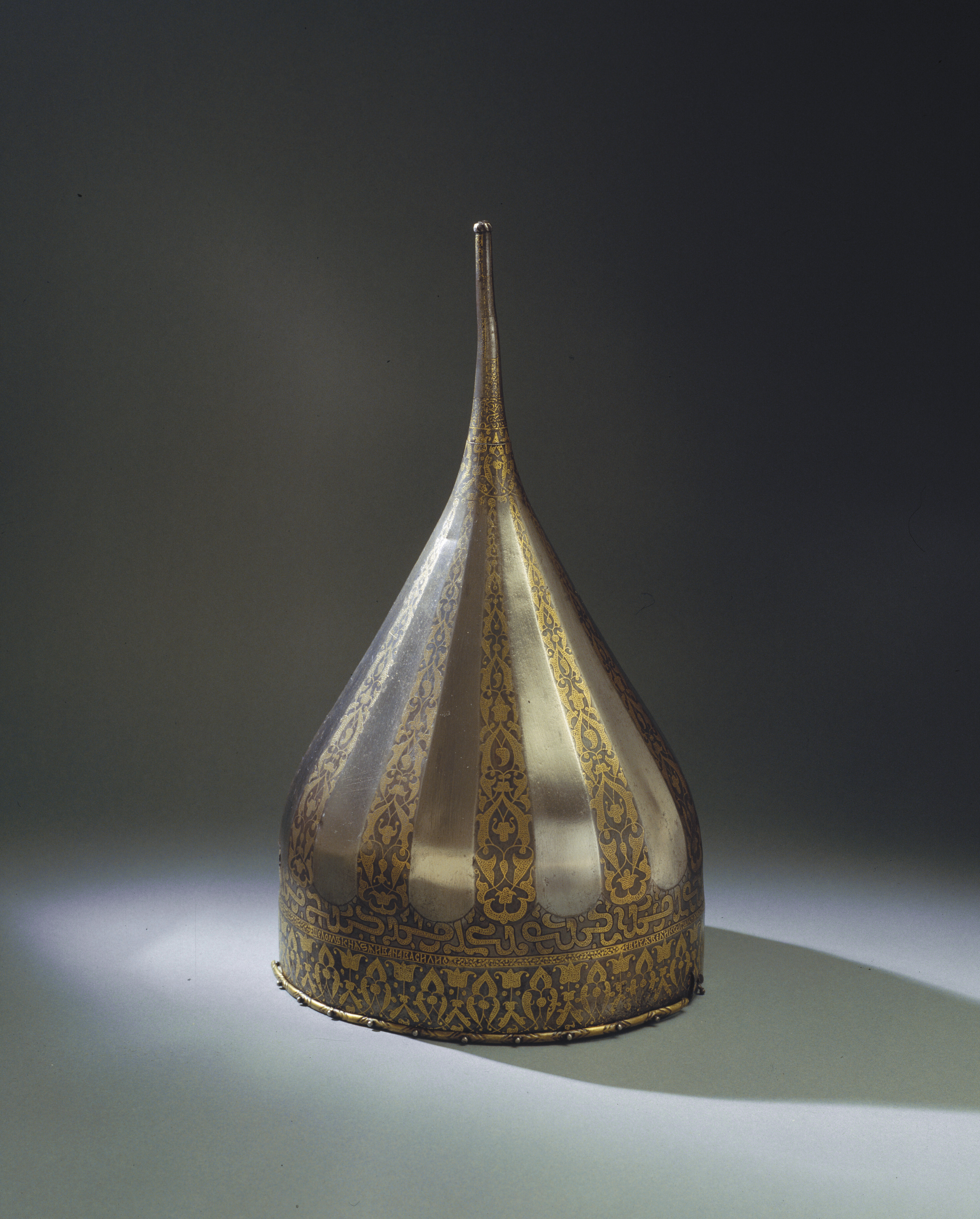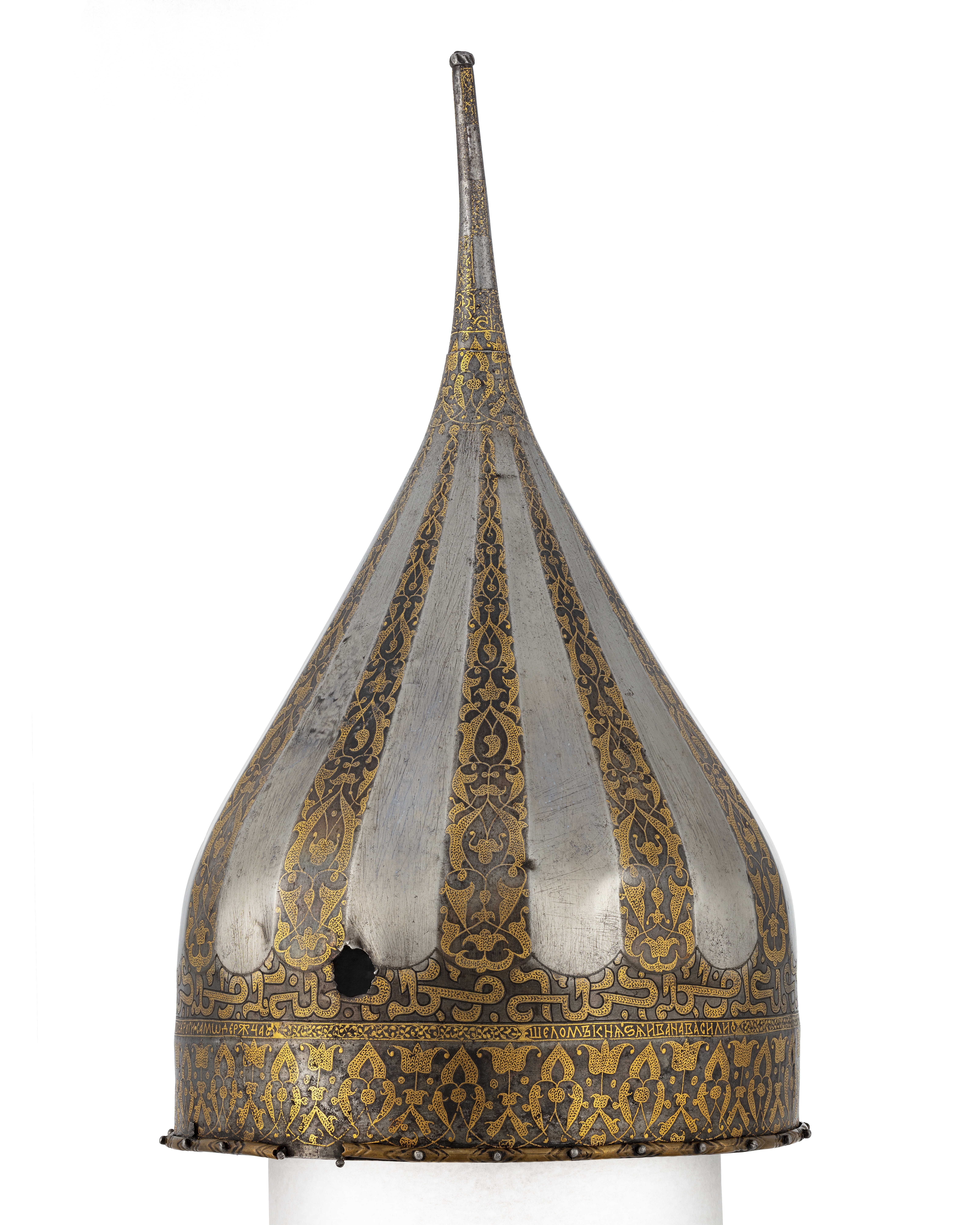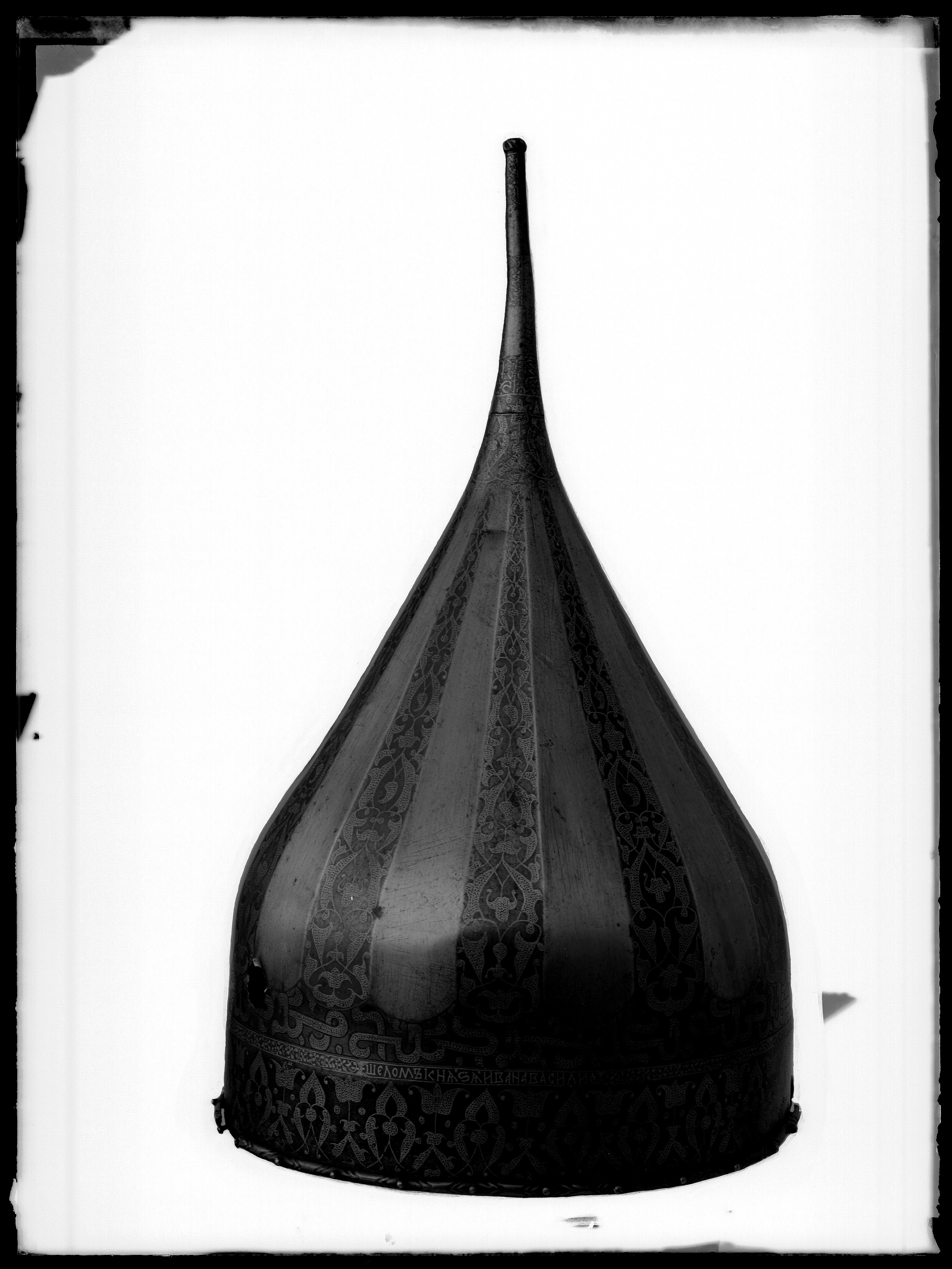 Spetsig hjälm av stål med påslagen gulddekor. Nertill en ca 35 mm bred rand med symmetrisk rankdekor där blommor och blad är täckta av små guldbågar. Därovanför ett 5 mm brett band med guldkanter och rankdekor där bladen är helt av guld. I bandet är utsparade fält med spetsiga ändar, vartannat med bladrankor, vartannat med gammalrysk guldtext (fyra textfält): "Hjälm som tillhört furst Ivan Vasiljevitj, son till storfursten Vasilij Ivanovitj, herre och hela Rysslands självhärskare". Därovanför ett band, b: 20-25 mm med arabisk-liknande skrifttecken med breda staplar med påslagna guldbågar och breda, punsade kantlinjer (urspr. täckta av silver?). Därovanför uppåt avsmalnande fält med bågformig avslutning, nertill i form av en påslagen silverlinje, vartannat fält blankt, vartannat med bladrankor av guld. Hjälmklockan avslutad upptill med ett band, b: 25 mm med bladrankor. Längs nederkanten fastnitat med nitar med kulformiga huvuden en något profilerad, rundad mässingslist, listen saknas på tre ställen. Upptill en konisk spets, l: 108 mm, avslutad med en snedräfflad kula, på spetsen nertill övre delen av klockans rankdekor, därovanför ett band med rankdekor, b: 15 mm. Övre delen av spetsen schackrutig med långa, rektangulära, blanka och rankdekorerade fält (dekoren delvis utsliten). Spetsen är fastnitad på platta som förts upp i hjälmklockan underifrån, men är nu rörlig runt axeln. Krigsbyte från Warszawa 1655, troligen tagen av polackerna i Moskwa under stora oredan 1611-1612. Enligt inskriptionen är hjälmen tillverkad för Ivan IV medan fadern ännu levde (+ 1533). Hjälmen är i äldre inventarier sammanförd med en sköld (avskriven 1822), men troligen har en förväxling skett. De kallas i inv. 1671 för "Een Romersk Skilt medh en Caschet utaf Jern medh silfuer utharbetat och förgylt".