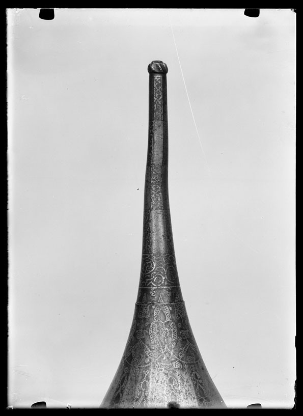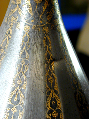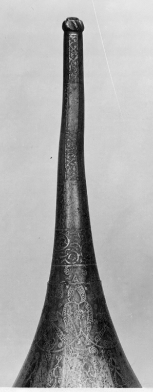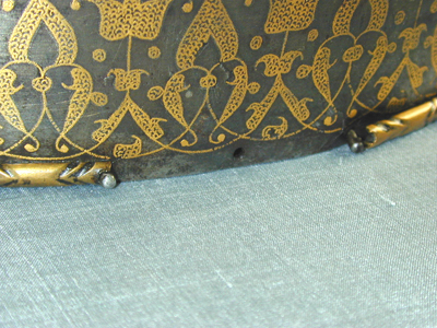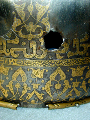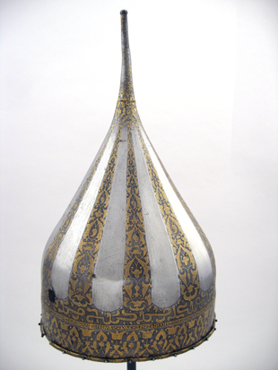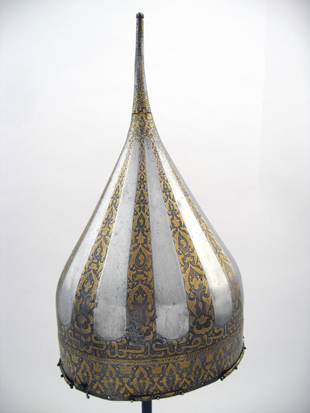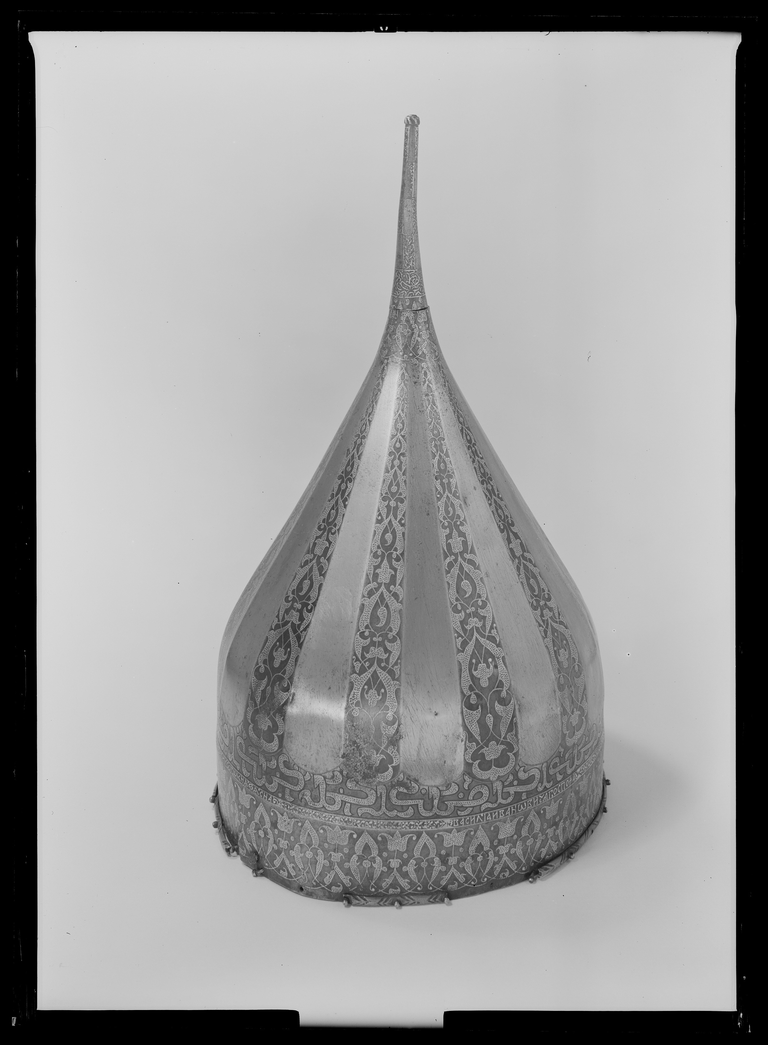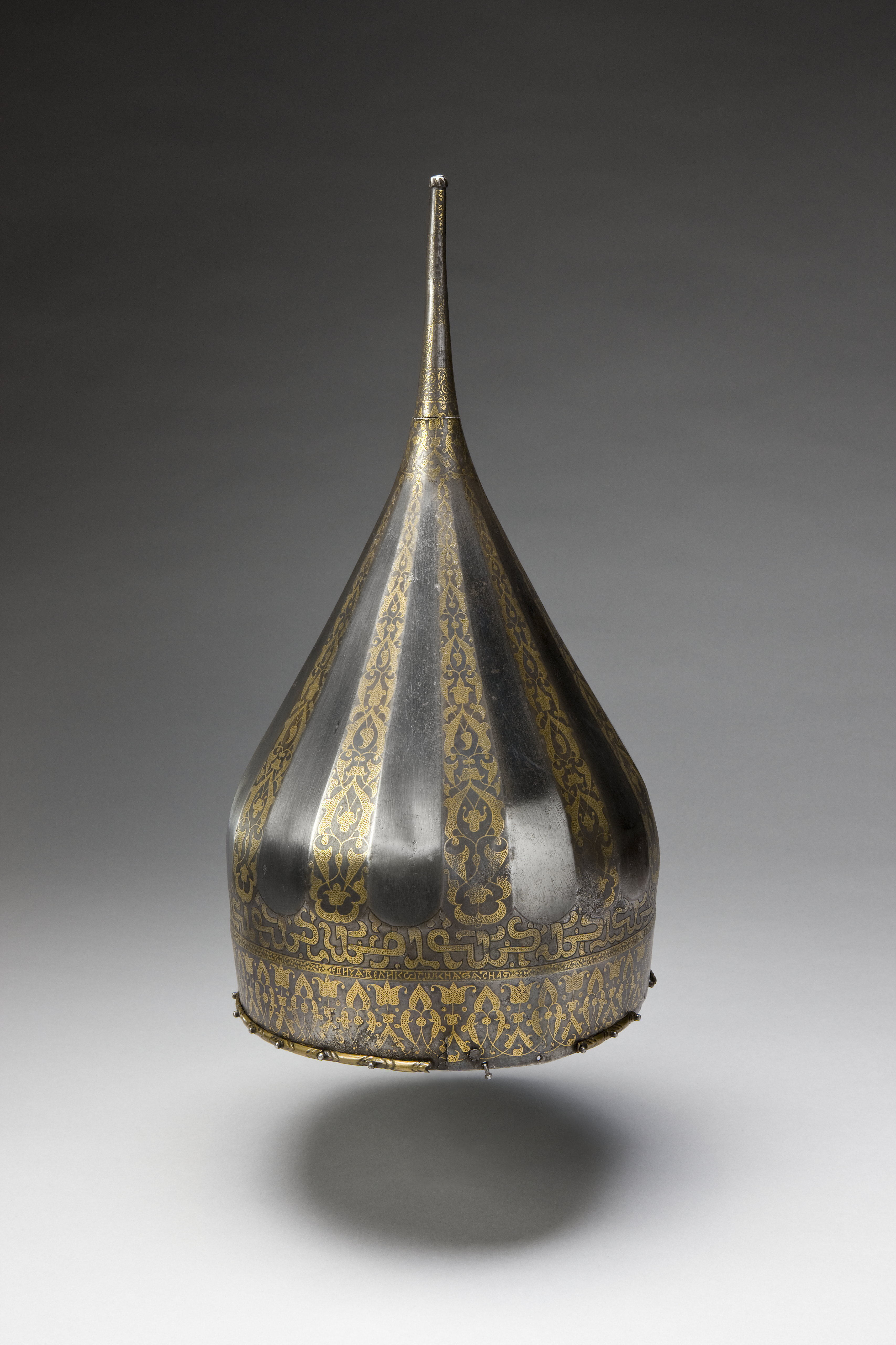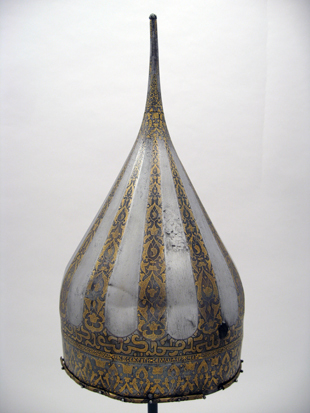 Spetsig hjälm av stål med påslagen gulddekor. Nertill en ca 35 mm bred rand med symmetrisk rankdekor där blommor och blad är täckta av små guldbågar. Därovanför ett 5 mm brett band med guldkanter och rankdekor där bladen är helt av guld. I bandet är utsparade fält med spetsiga ändar, vartannat med bladrankor, vartannat med gammalrysk guldtext (fyra textfält): "Hjälm som tillhört furst Ivan Vasiljevitj, son till storfursten Vasilij Ivanovitj, herre och hela Rysslands självhärskare". Därovanför ett band, b: 20-25 mm med arabisk-liknande skrifttecken med breda staplar med påslagna guldbågar och breda, punsade kantlinjer (urspr. täckta av silver?). Därovanför uppåt avsmalnande fält med bågformig avslutning, nertill i form av en påslagen silverlinje, vartannat fält blankt, vartannat med bladrankor av guld. Hjälmklockan avslutad upptill med ett band, b: 25 mm med bladrankor. Längs nederkanten fastnitat med nitar med kulformiga huvuden en något profilerad, rundad mässingslist, listen saknas på tre ställen. Upptill en konisk spets, l: 108 mm, avslutad med en snedräfflad kula, på spetsen nertill övre delen av klockans rankdekor, därovanför ett band med rankdekor, b: 15 mm. Övre delen av spetsen schackrutig med långa, rektangulära, blanka och rankdekorerade fält (dekoren delvis utsliten). Spetsen är fastnitad på platta som förts upp i hjälmklockan underifrån, men är nu rörlig runt axeln. Krigsbyte från Warszawa 1655, troligen tagen av polackerna i Moskwa under stora oredan 1611-1612. Enligt inskriptionen är hjälmen tillverkad för Ivan IV medan fadern ännu levde (+ 1533). Hjälmen är i äldre inventarier sammanförd med en sköld (avskriven 1822), men troligen har en förväxling skett. De kallas i inv. 1671 för "Een Romersk Skilt medh en Caschet utaf Jern medh silfuer utharbetat och förgylt".