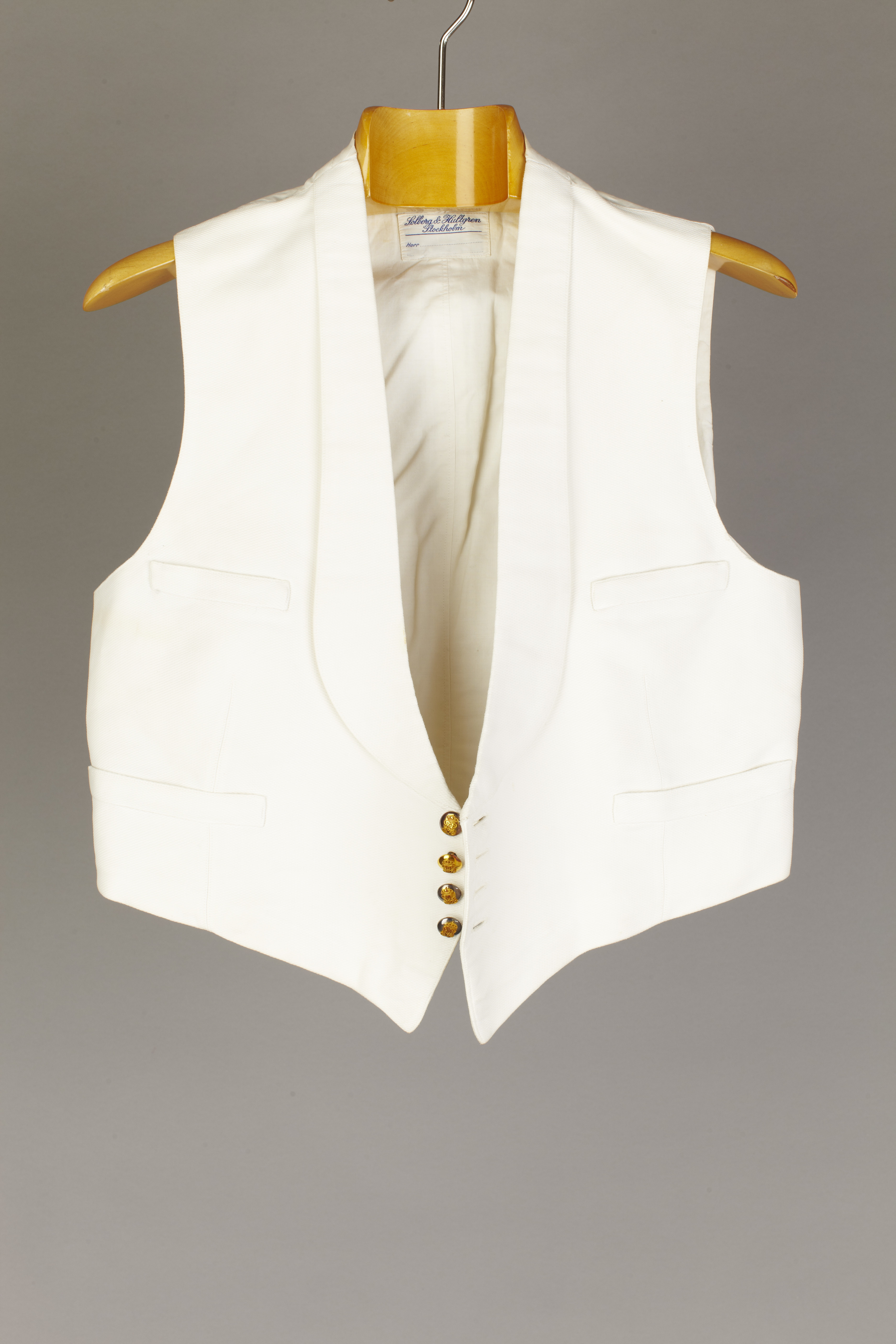 Väst av vit bomullspiké tillskuren utan ärm och med sjalkrage. Fyra fickor. Bakstycke av vit bomull. Knäppning fram med fyra små förgyllda mässingsknappar med Gustav V:s namnchiffer. Foder av vit bomull. Upptill i ryggen firmaetikett: "Solberg & Hultgren //Stockholm". Har tillhört kammarherren friherre Reinhold H.J.Rudbeck (1871-1957).
