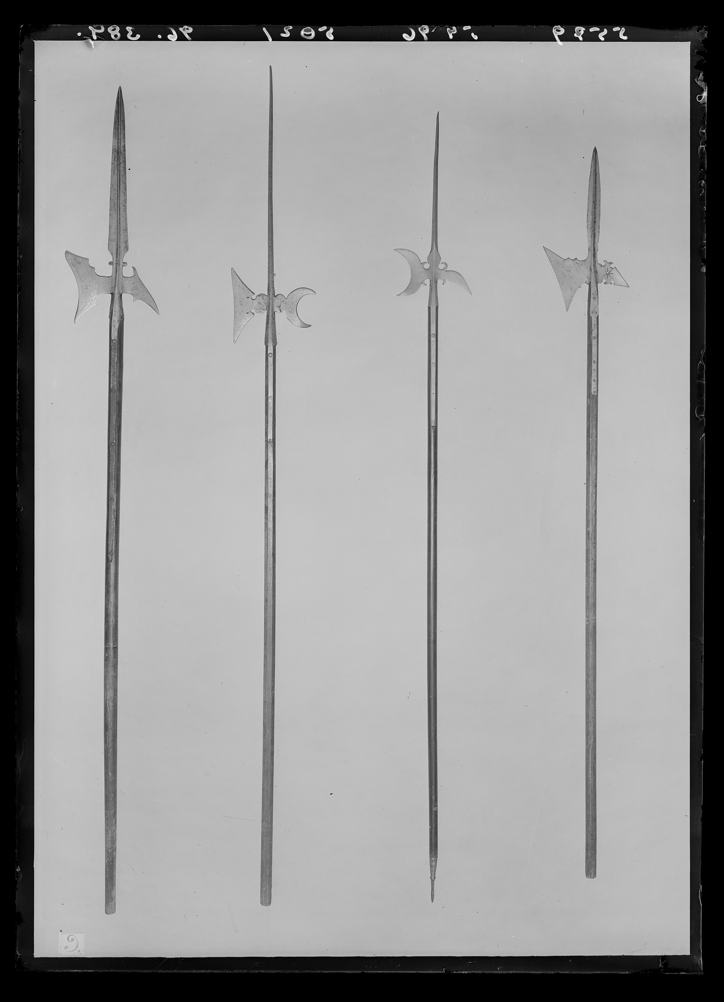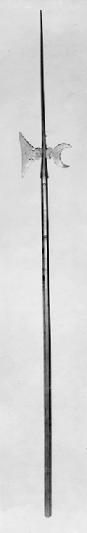 Klingan, 655 mm med fyrkantigt tvärsnitt. Yxblad smalt vid holken, vidgar sig jämnt mot eggen, som är nästan rak, parallell med skaftet. Nära holken två runda inskärningar i yxbladet och två små runda hål. Halvmånformig hake (bakåtriktad) Holk L: 102 mm fyrsidig med fasade kanter med skenor på bladets flatsida, L: 275 mm fastnitade vid skaftet. Skaft av ljust brunbetsat trä (bok), åttkantigt.