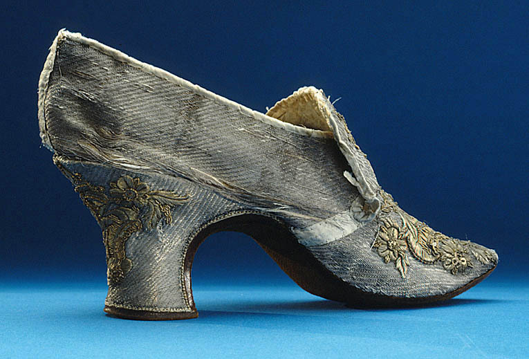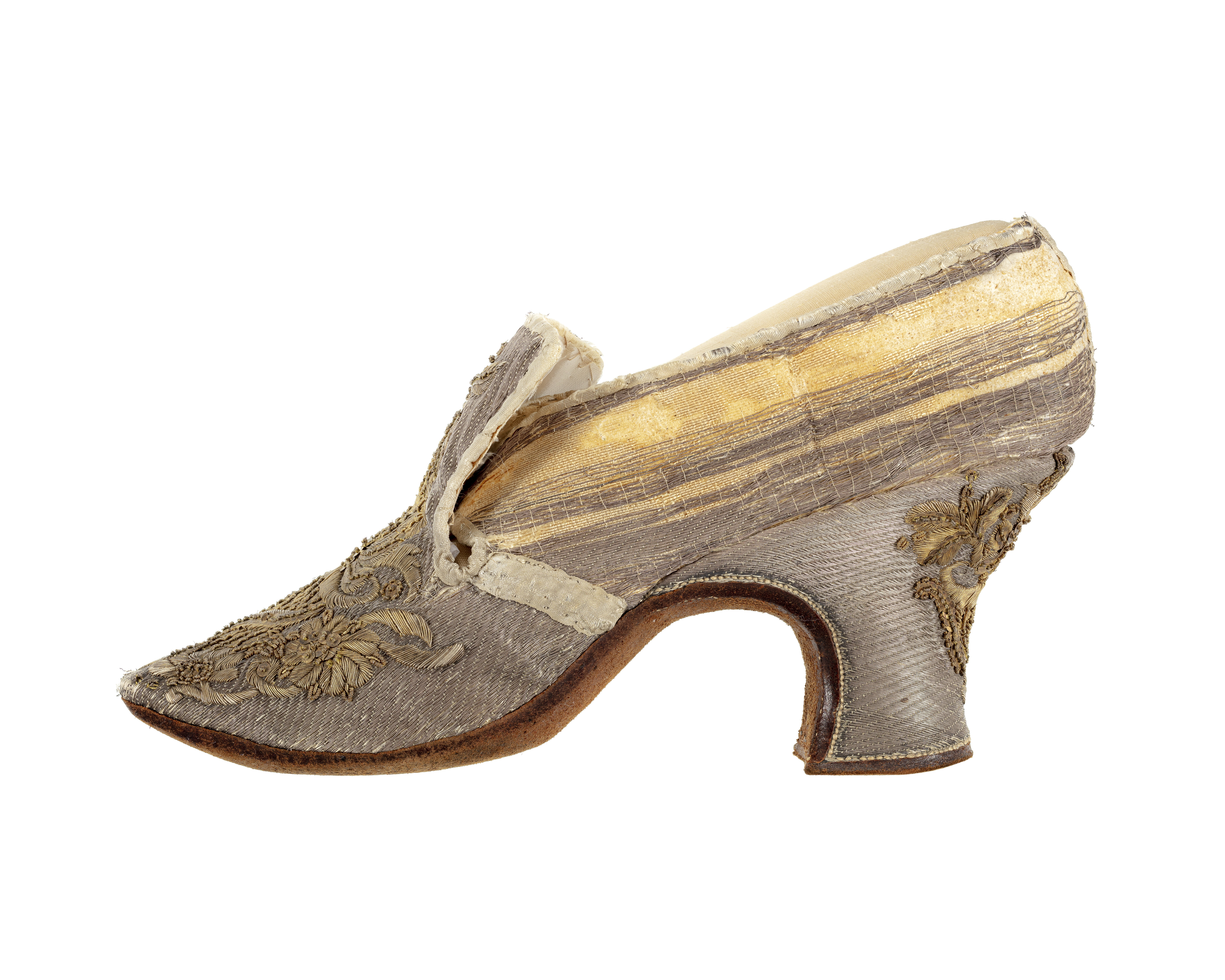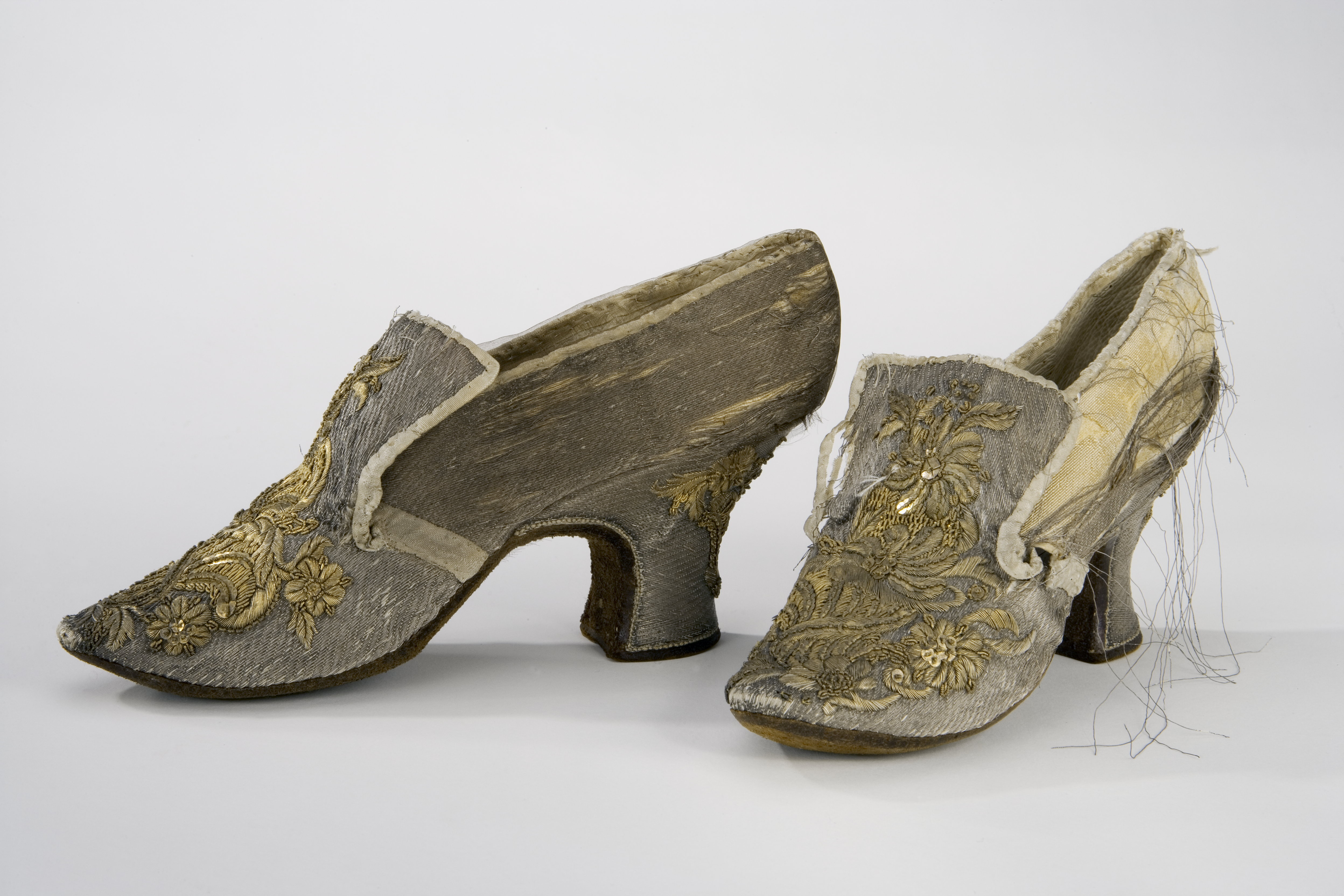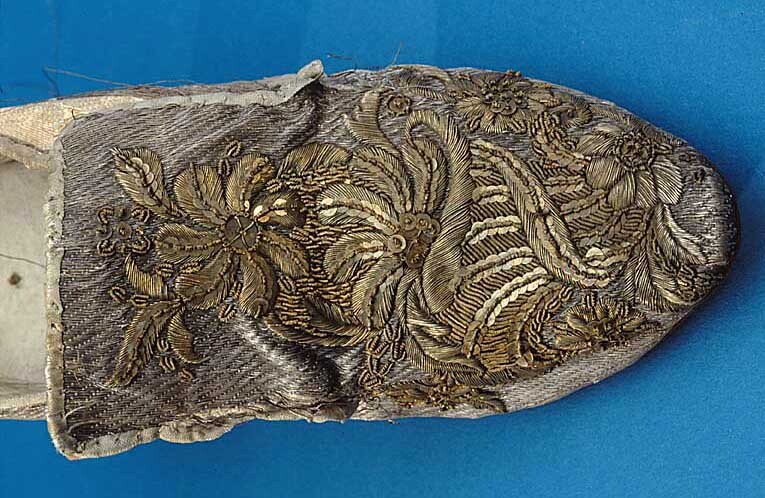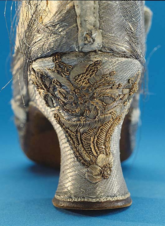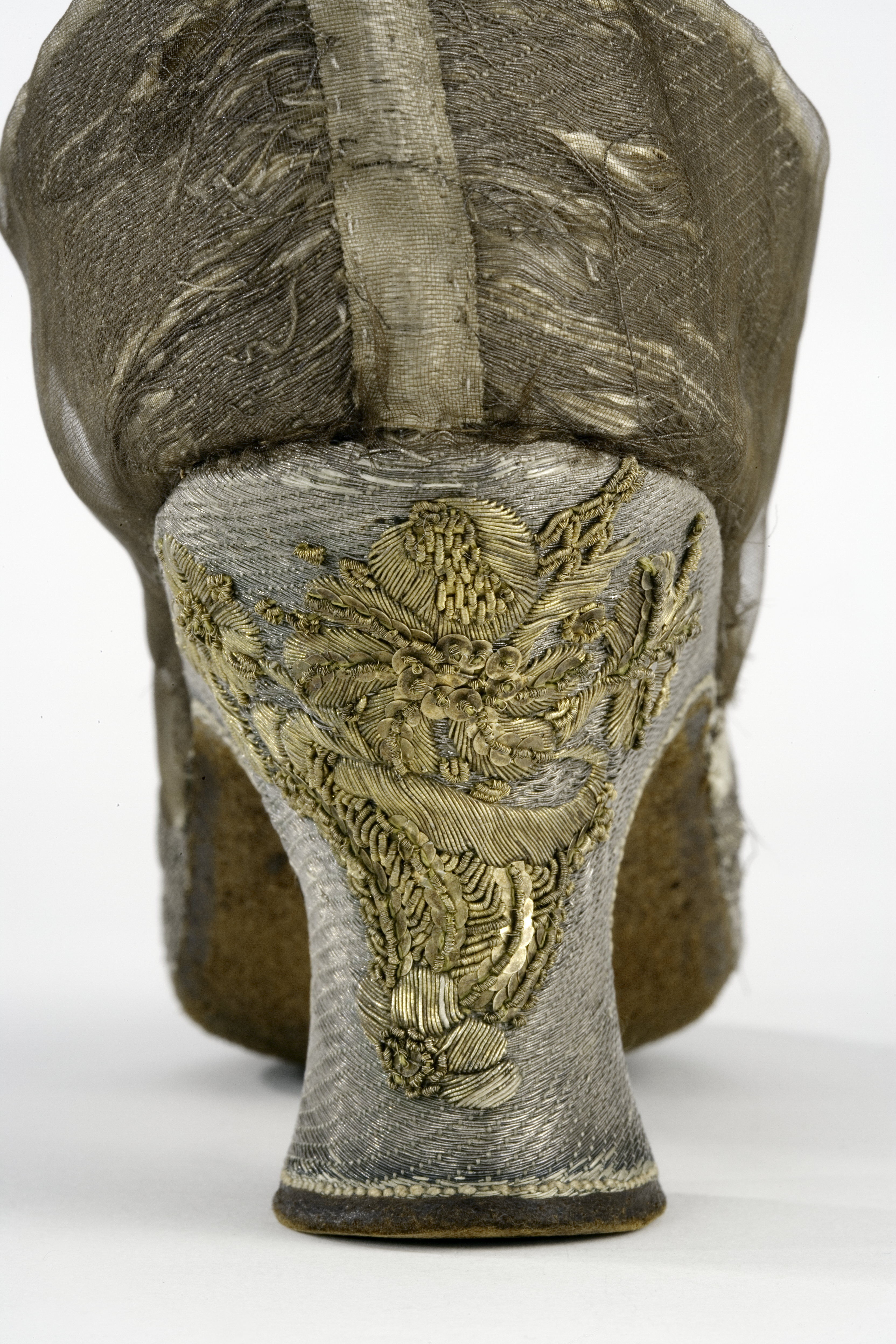 Skon är klädd med ett kypertvävt silvertyg med guldbroderi utfört av hovbrodör Christopher Sergell. Modellen är rak med uppnäst skospets och hög indragen klack. Skon är skuren med rak plös och bakstycken utdragna till korta slejfar. Framtill är skon fodrad med vitt linne och baktill med vitt getskinn. Det vegetativa broderiet är utfört med guldtråd, kantiljer och paljetter och täcker större delen av frampartiet, plösen och klackens baksida. Botten är vändsydd och slitsulan har klisterputsade kanter samt sex stjärnformiga pinnhålsstämplar. Skons längd motsvarar idag storlek ca 32.