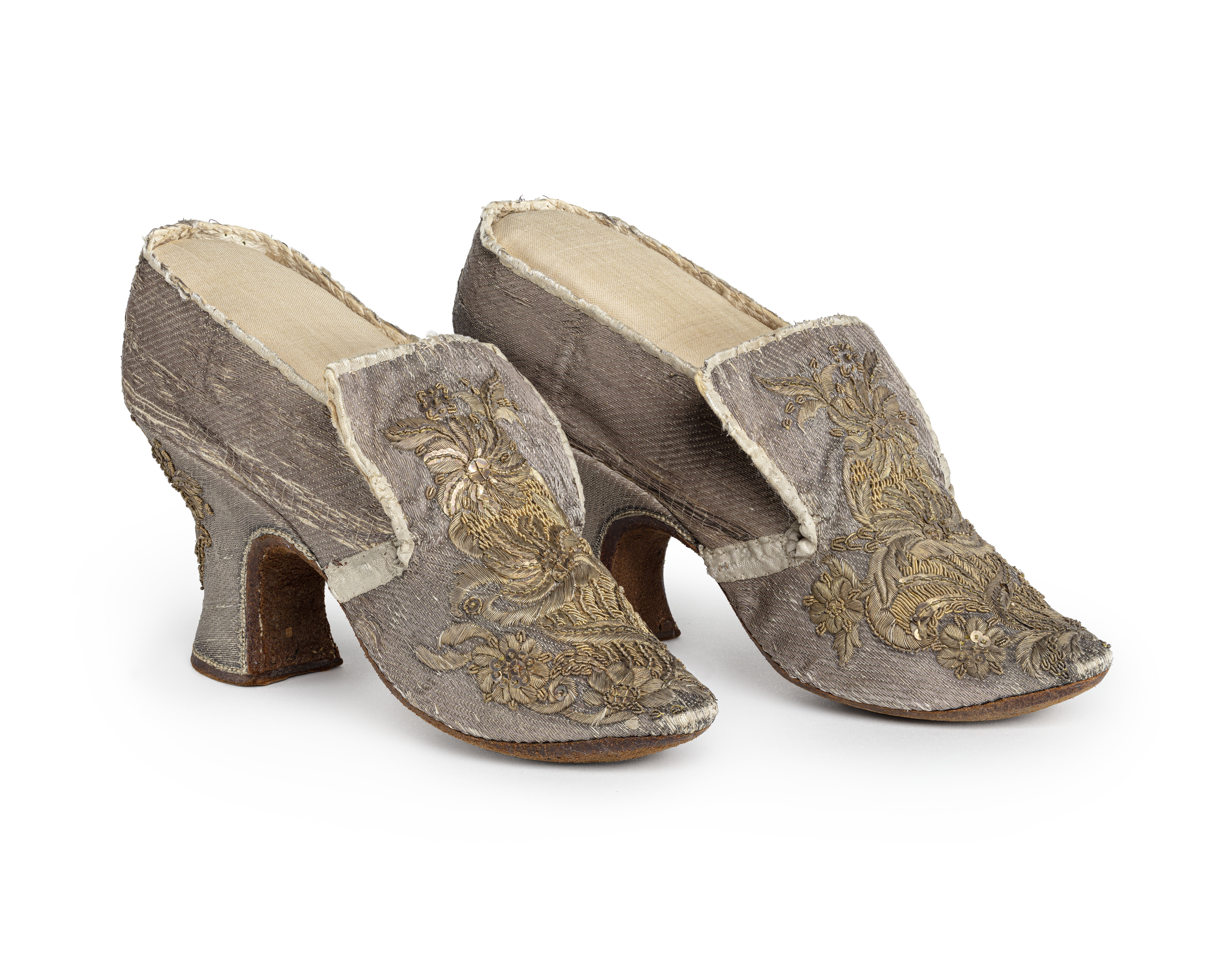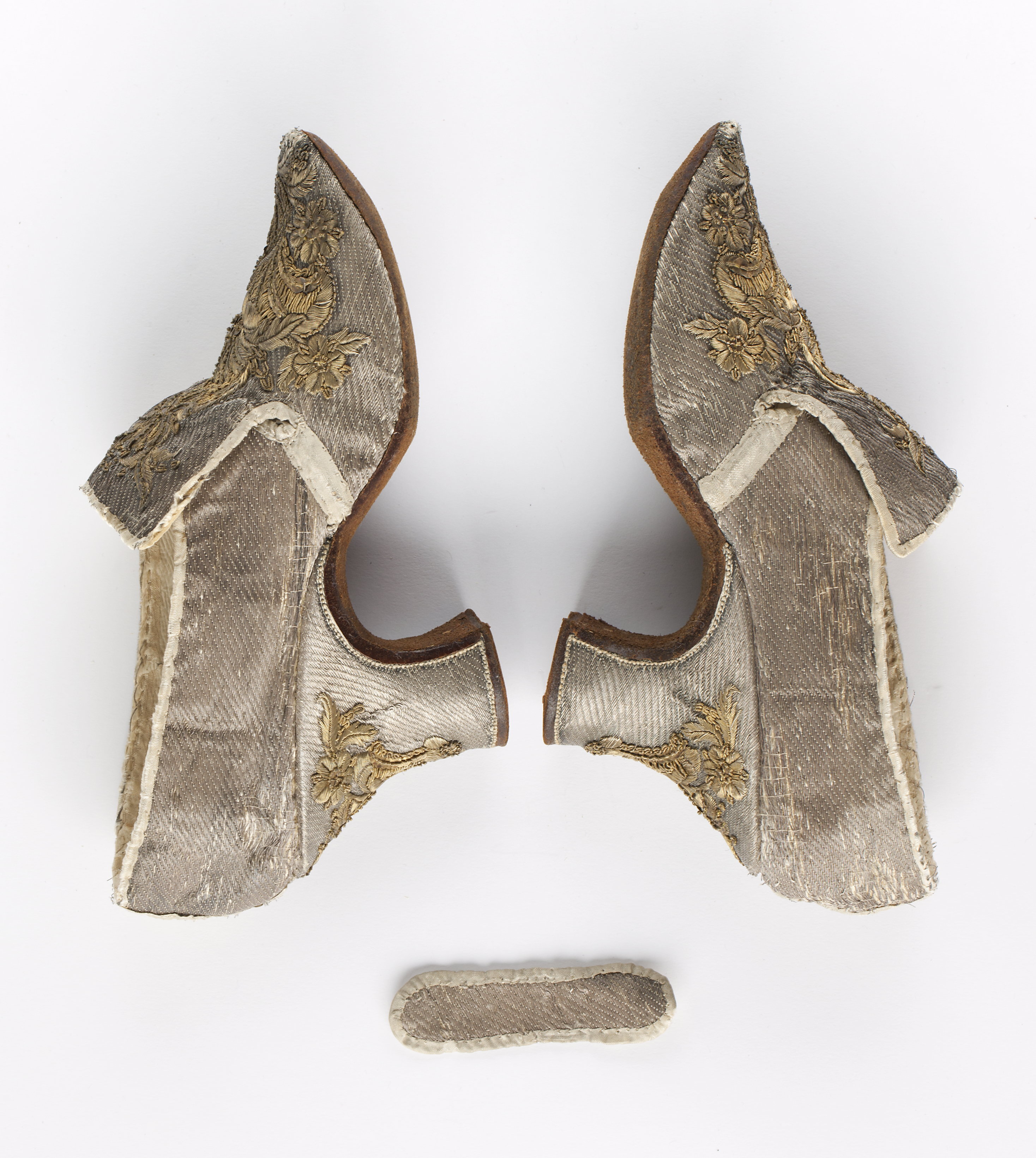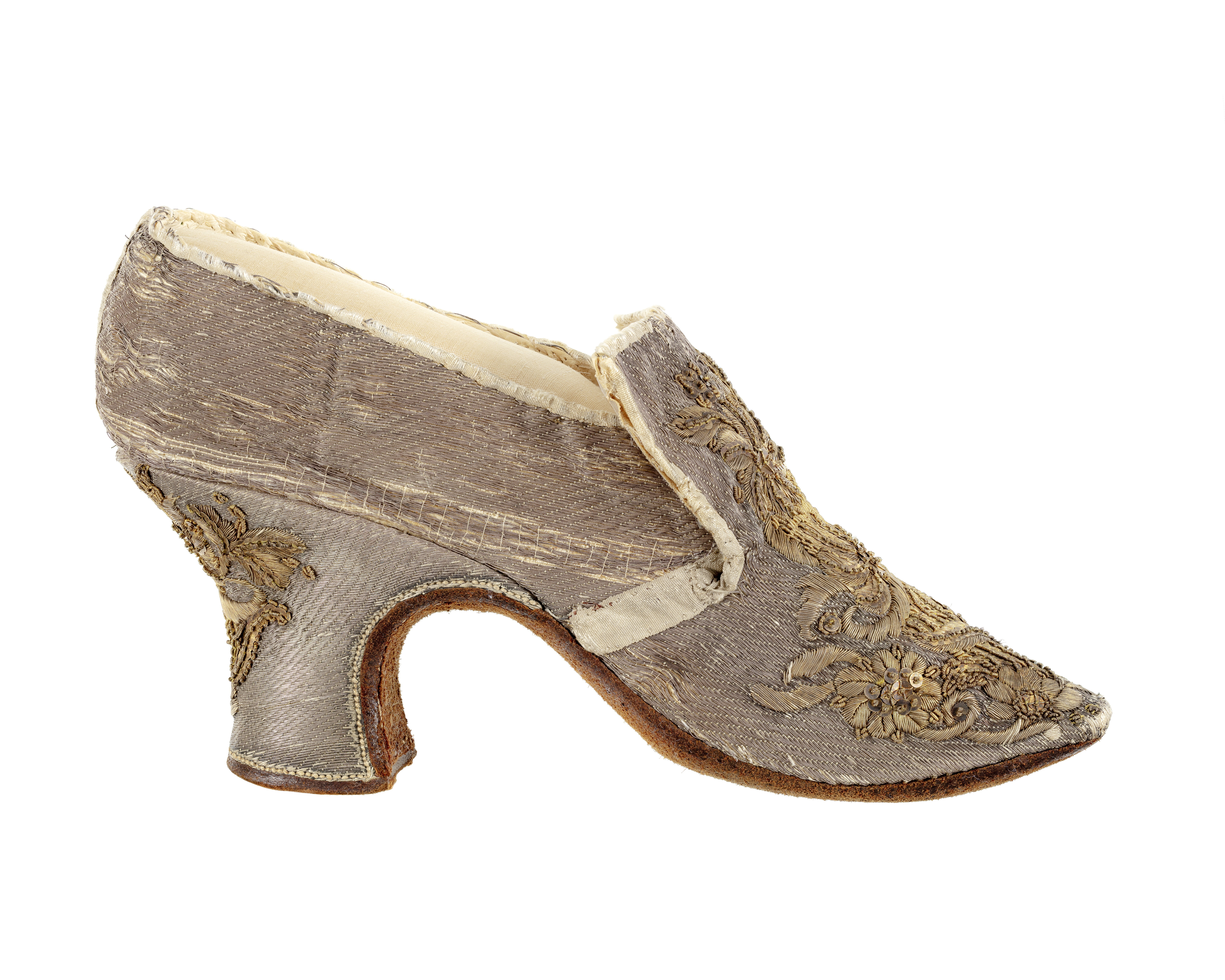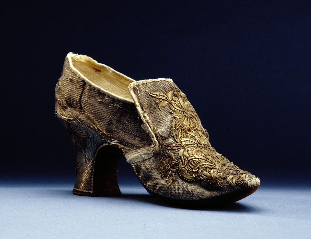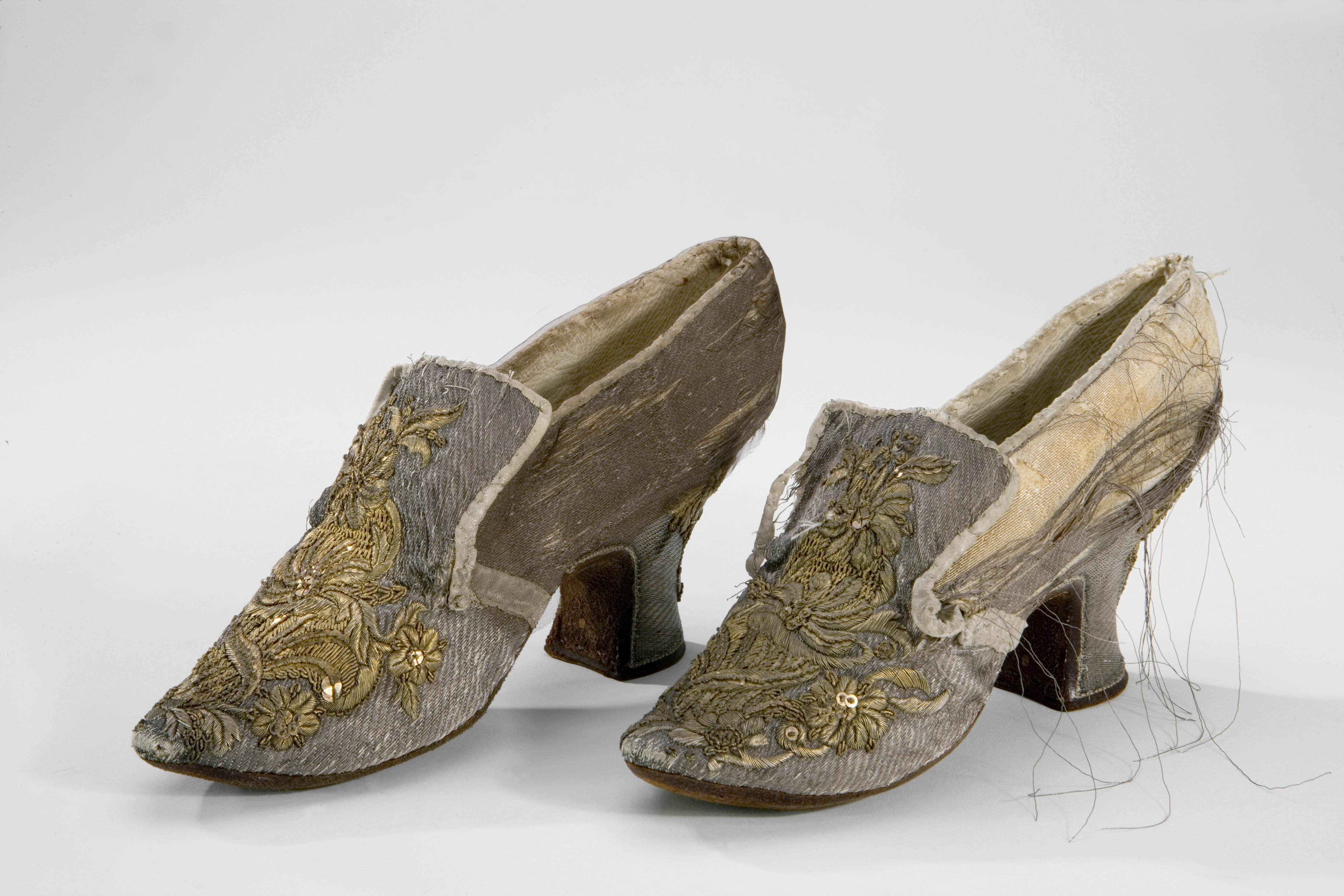 Skon är klädd med ett kypertvävt silvertyg med guldbroderi utfört av hovbrodör Christopher Sergell. Modellen är rak med uppnäst skospets och hög indragen klack. Skon är skuren med rak plös och bakstycken utdragna till korta slejfar. Framtill är skon fodrad med vitt linne och baktill med vitt getskinn. Det vegetativa broderiet är utfört med guldtråd, kantiljer och paljetter och täcker större delen av frampartiet, plösen och klackens baksida. Botten är vändsydd och slitsulan har klisterputsade kanter samt sex stjärnformiga pinnhålsstämplar. Skons längd motsvarar idag storlek ca 32.