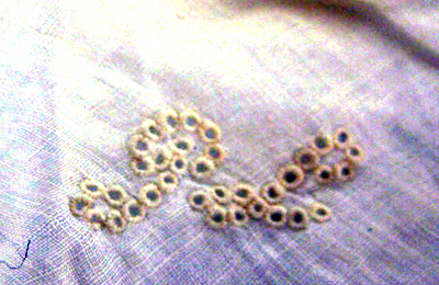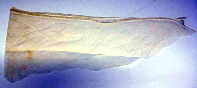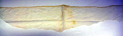 Fischy av tunt vitt bomullstyg. Upptill kantad av en fåll, b. 2 mm, samt av en knypplad spets, b. 3 mm. Med hålsöm står märkt i överkantens mitt: "PL".