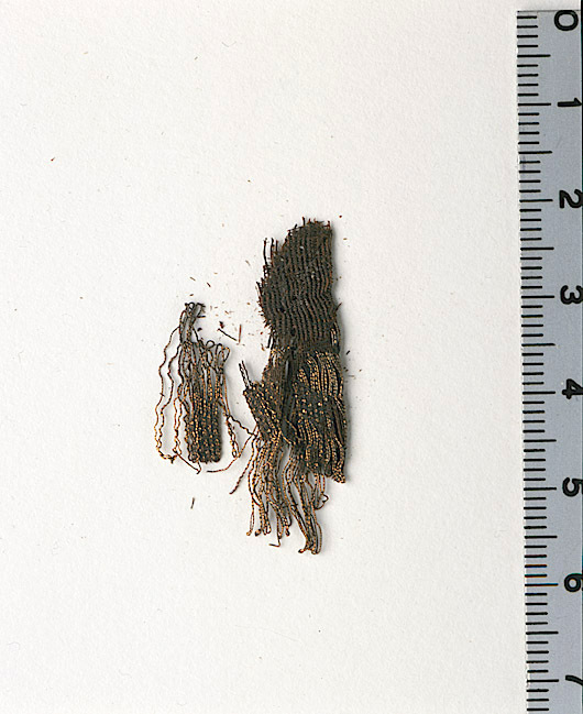 Praktdräkt, brokad med mönstrad botten av varprips och 8-skafts satin med guldbroscheringar. Fragment av siden i varprips med broscherad guldtråd. Påträffat vid fotänden av kistan. De ursprungliga färgerna delvis förändrade, fragmentet numera i brunt och guld. Fragmentet ingår i en samling fragment tagna som prov ur drottning Kristinas kista vid gravöppningen den 13-14 december 1965. Varprips Varp: 2-trådigt silke med svag s-snodd. Trådtäthet: 80 trådar/cm. Inslag: Dubbla inslag med 2-trådigt eller dubbelspolat garn med parallellt liggande fibrer, saknar snodd. Trådtäthet: 18 inslag/cm med 4 tr/inslag. Material: Silke. Teknik: Varprips, fr. gros de Tours. Kommentar: Nuvarande färg är brun. Satin Varp: 2-trådigt silke med svag s-snodd. Trådtäthet: 80 trådar/cm. Inslag: 2-trådigt eller dubbelspolat garn med parallellt liggande fibrer. Trådtäthet: 72 trådar/cm. Material: Silke. Teknik: Satin, 8 skaft. Kommentar: Nuvarande färg är brun. Broscheringen: Material: Förgyllt silverlan spunnet runt en silkekärna. Förgyllt på båda sidorna, guldskiktets tjocklek <0,1 um och lanets tjocklek är 0,03 mm. Teknik: Broscheringarna är ej avbundna utan flotterar. Garneringen som utgör knapphålen: Knapphålen som ej är uppskurna är broderade. Två virade lan (runt silkeskärna) tvinnade runt varandra (sk dubbelvirat lan) i z-snodd har lagts i fyra rader och sytts ned med enkla stygn tvärs över med jämna mellanrum. Material: Lanet är förgyllt på båda sidor, guldskiktet är <0,1 um, lanets tjocklek är 0,02 mm och bredd 0,22 mm. Kärna av silke. Teknik: Broderi