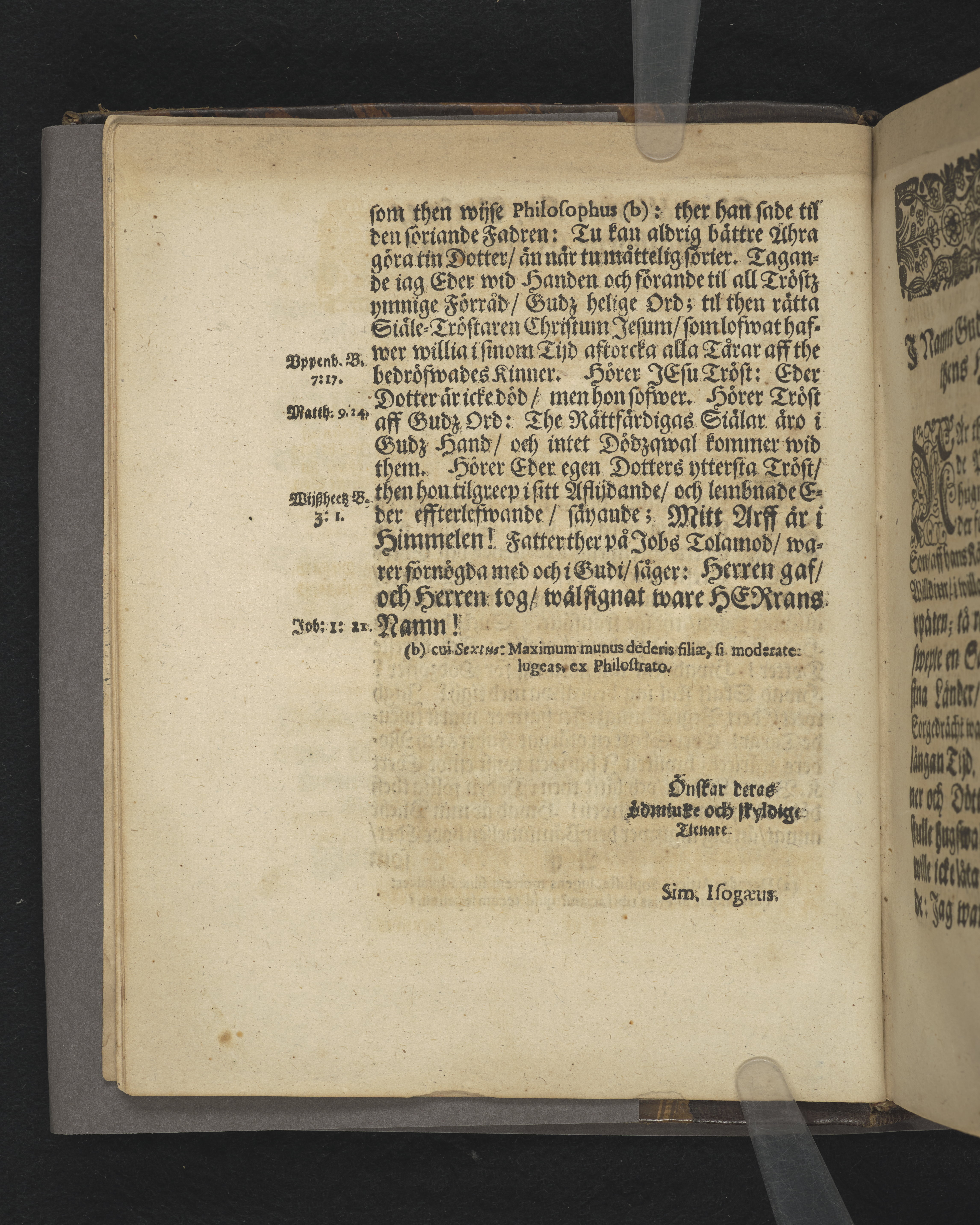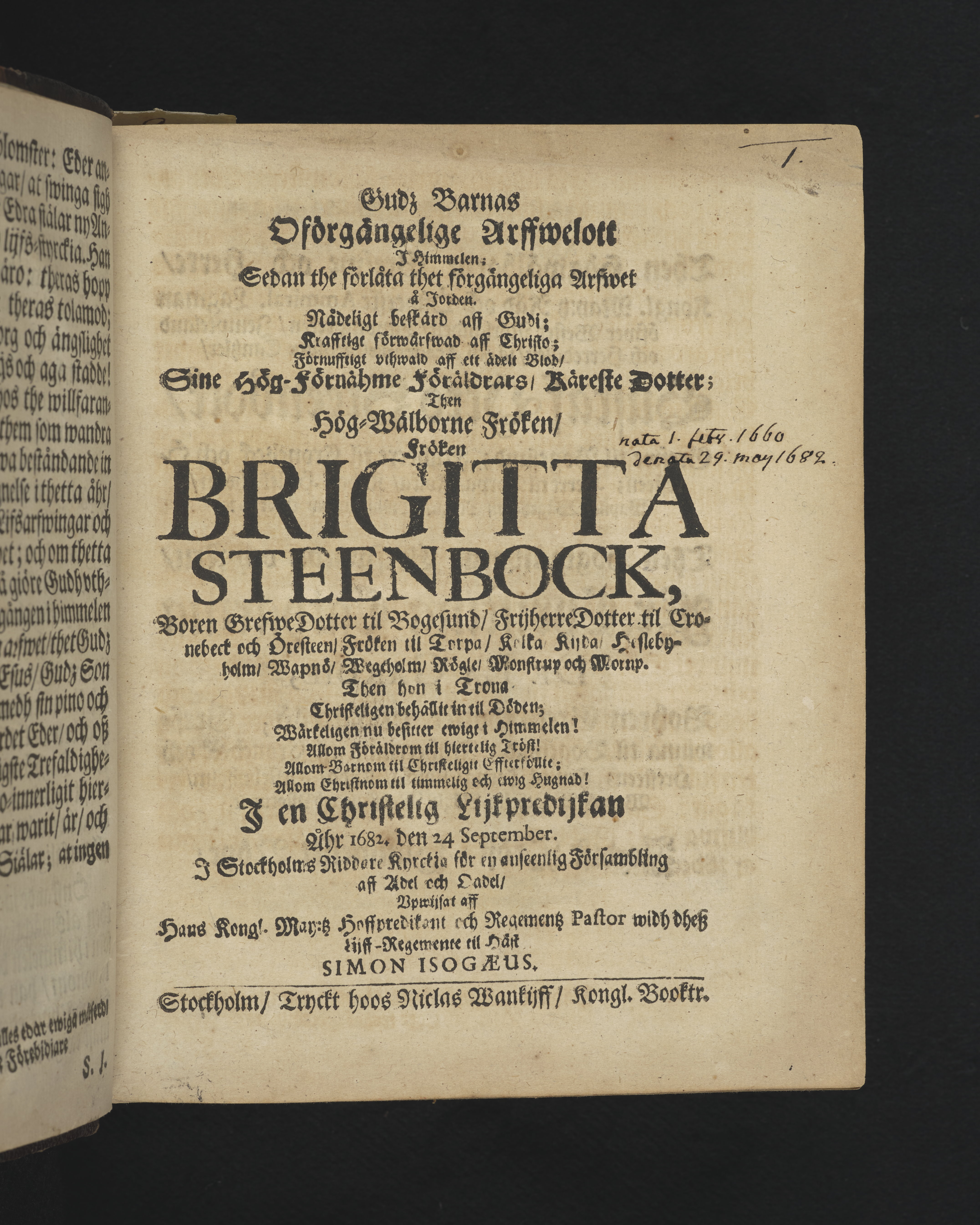 Gudz barnas oförgängelige arffwelott i himmelen... Fröken Brigitta Steenbock, boren grefwe dotter til Bogesund... i en christelig lijkpredijkan åhr 1682. den 24 september. I Stockholms Riddare kyrkia... upwijsat aff... Simon Isogæus. Stockholm, tryckt hoos Niclas Wankijff, kongl. booktr.