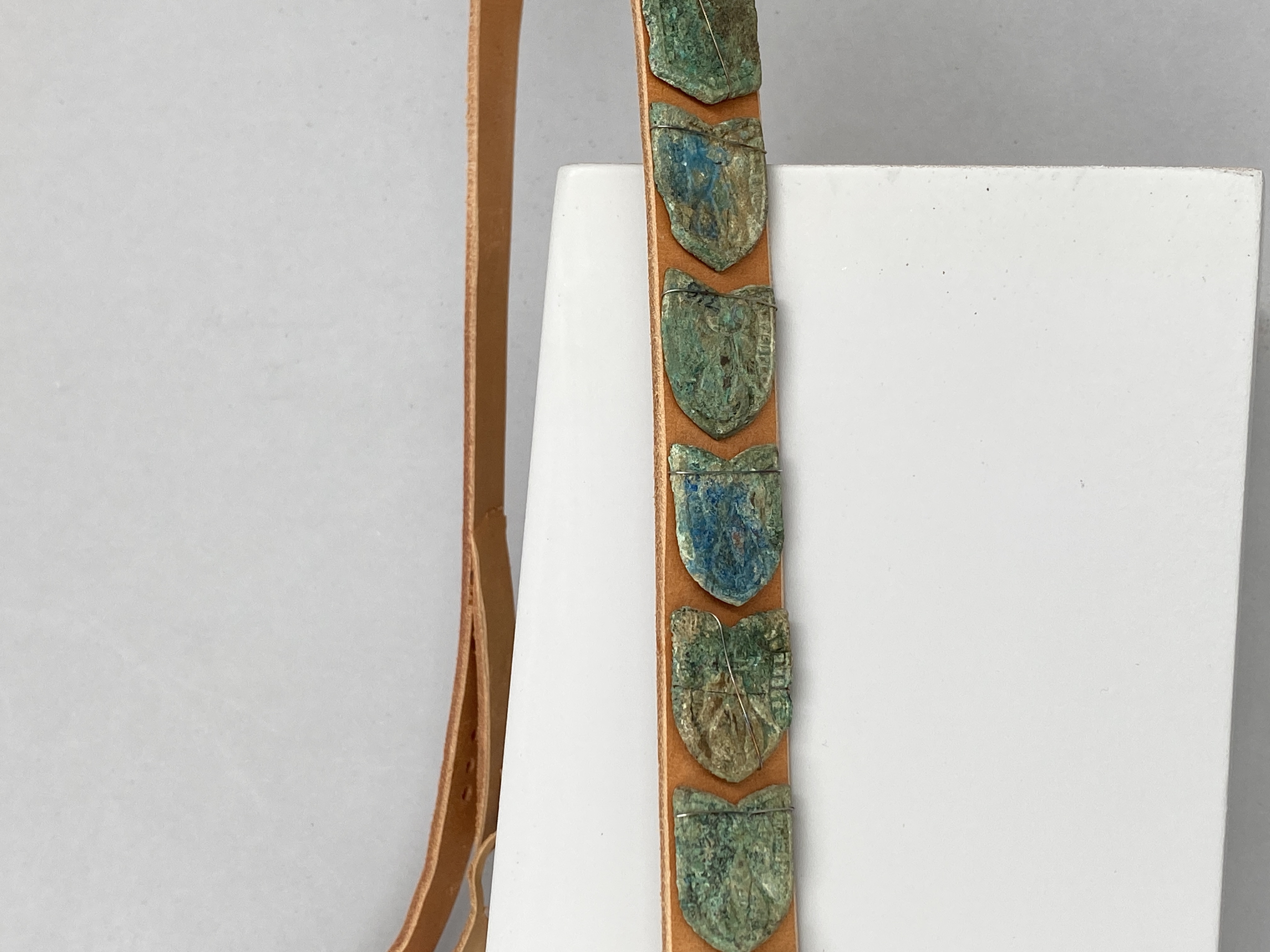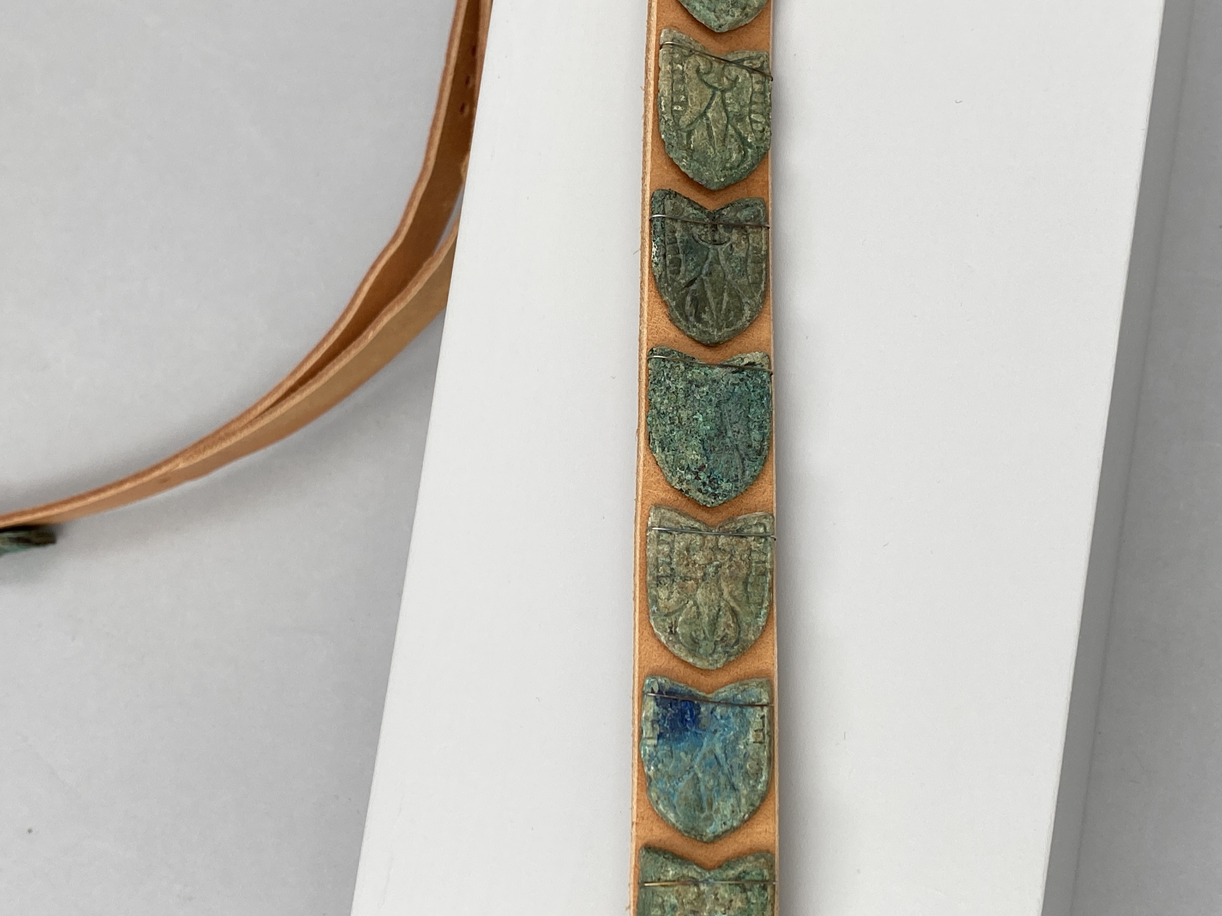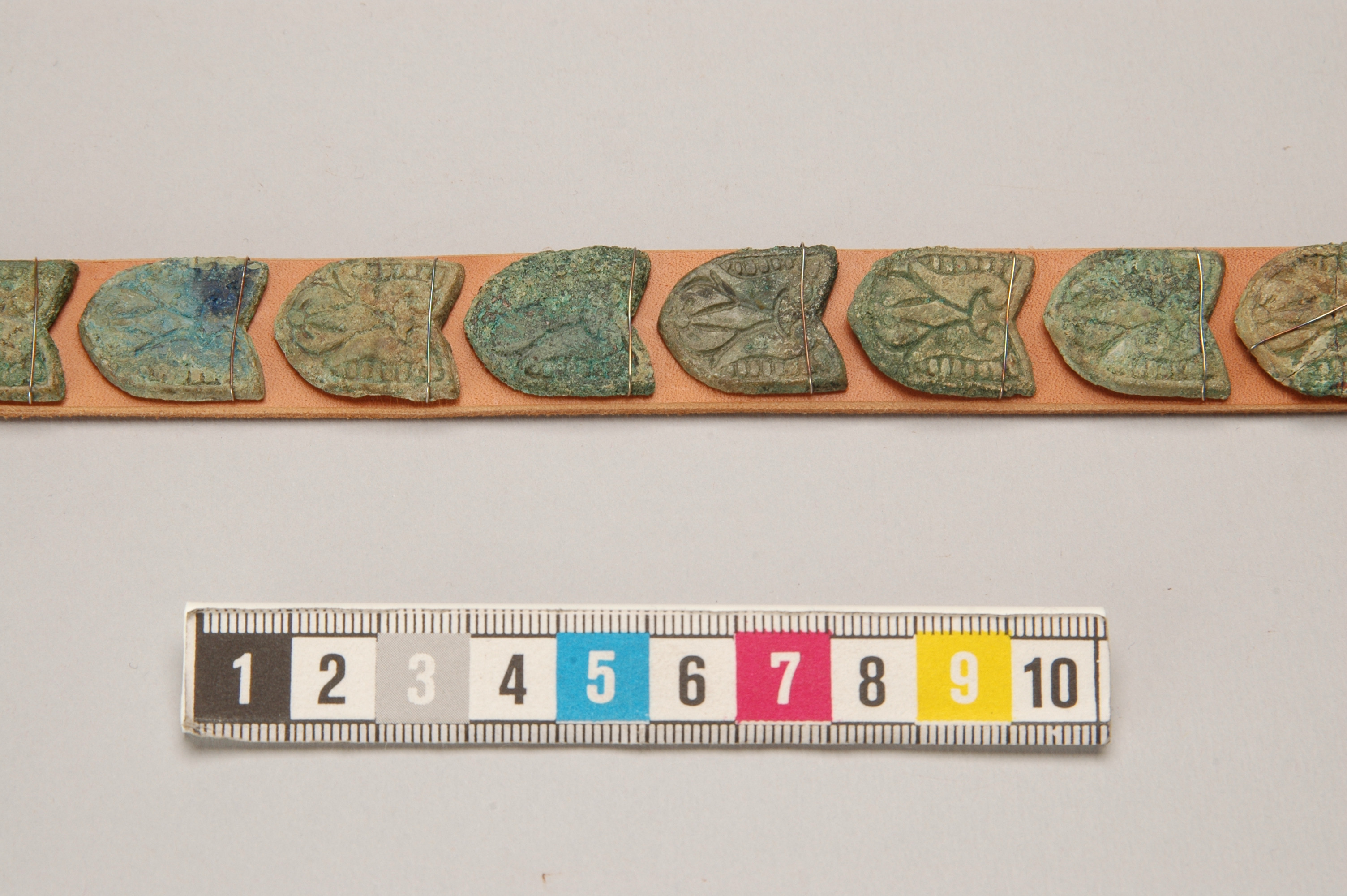 14 sköldformiga bältesbeslag monterade på modernt bälte.