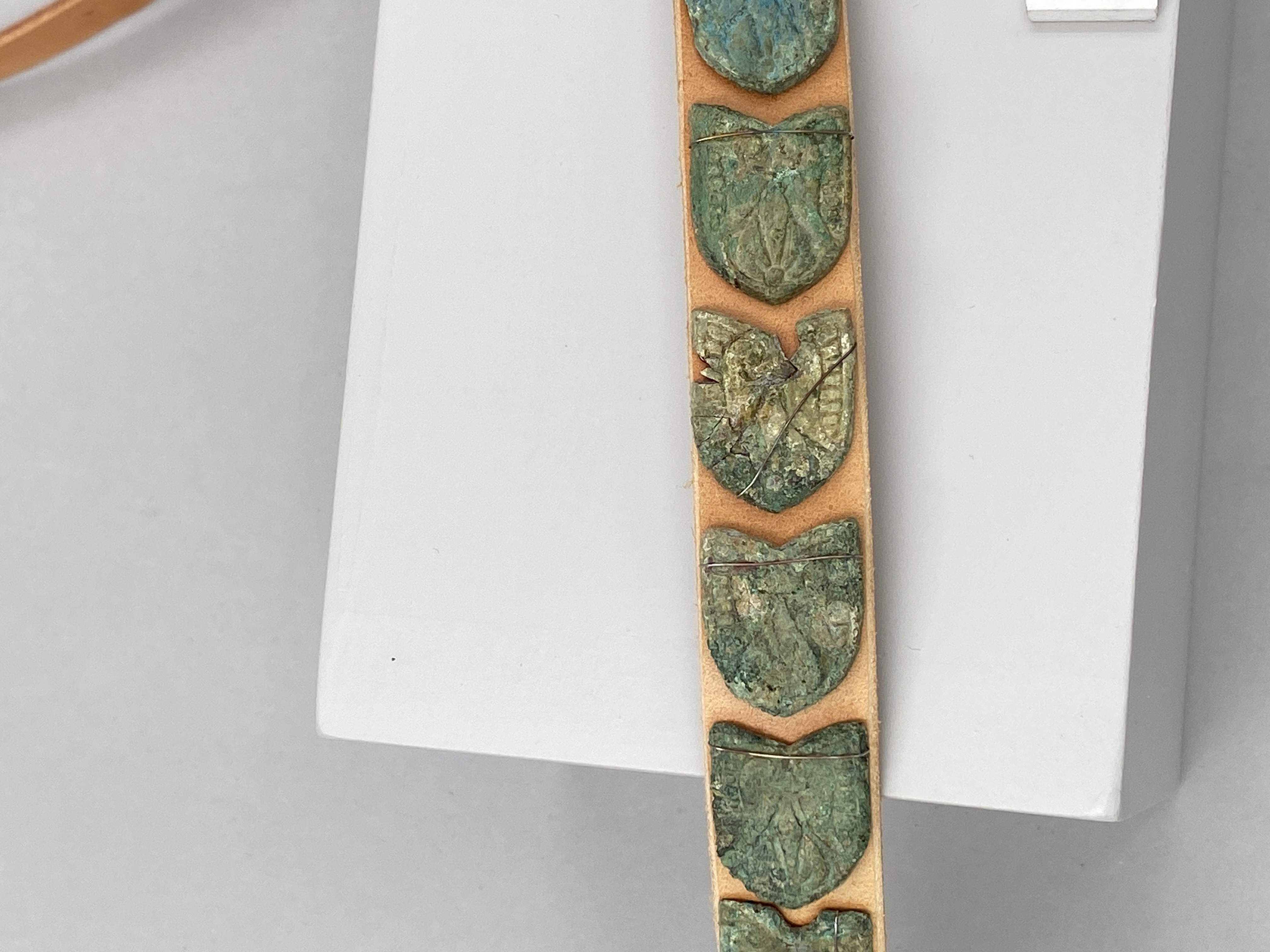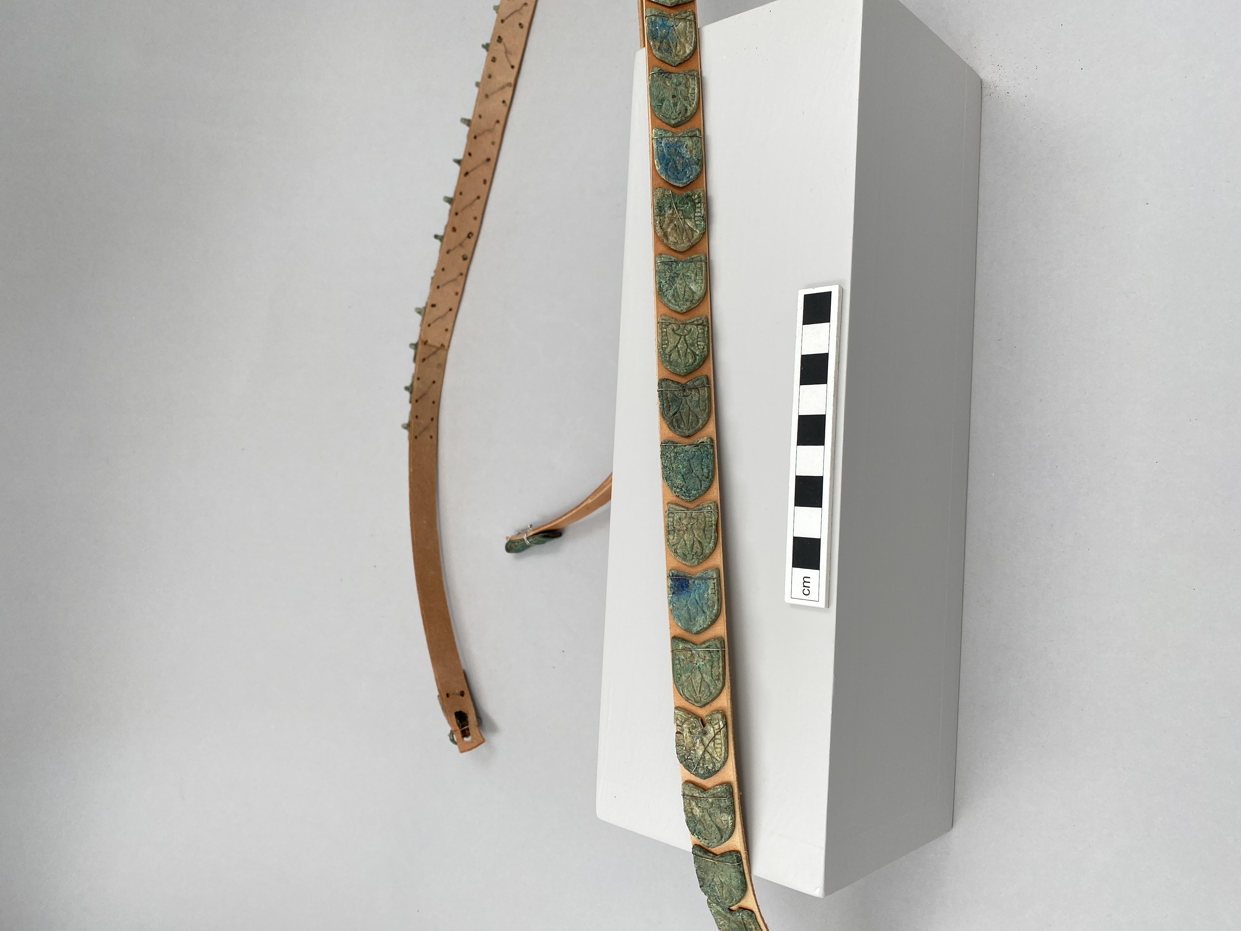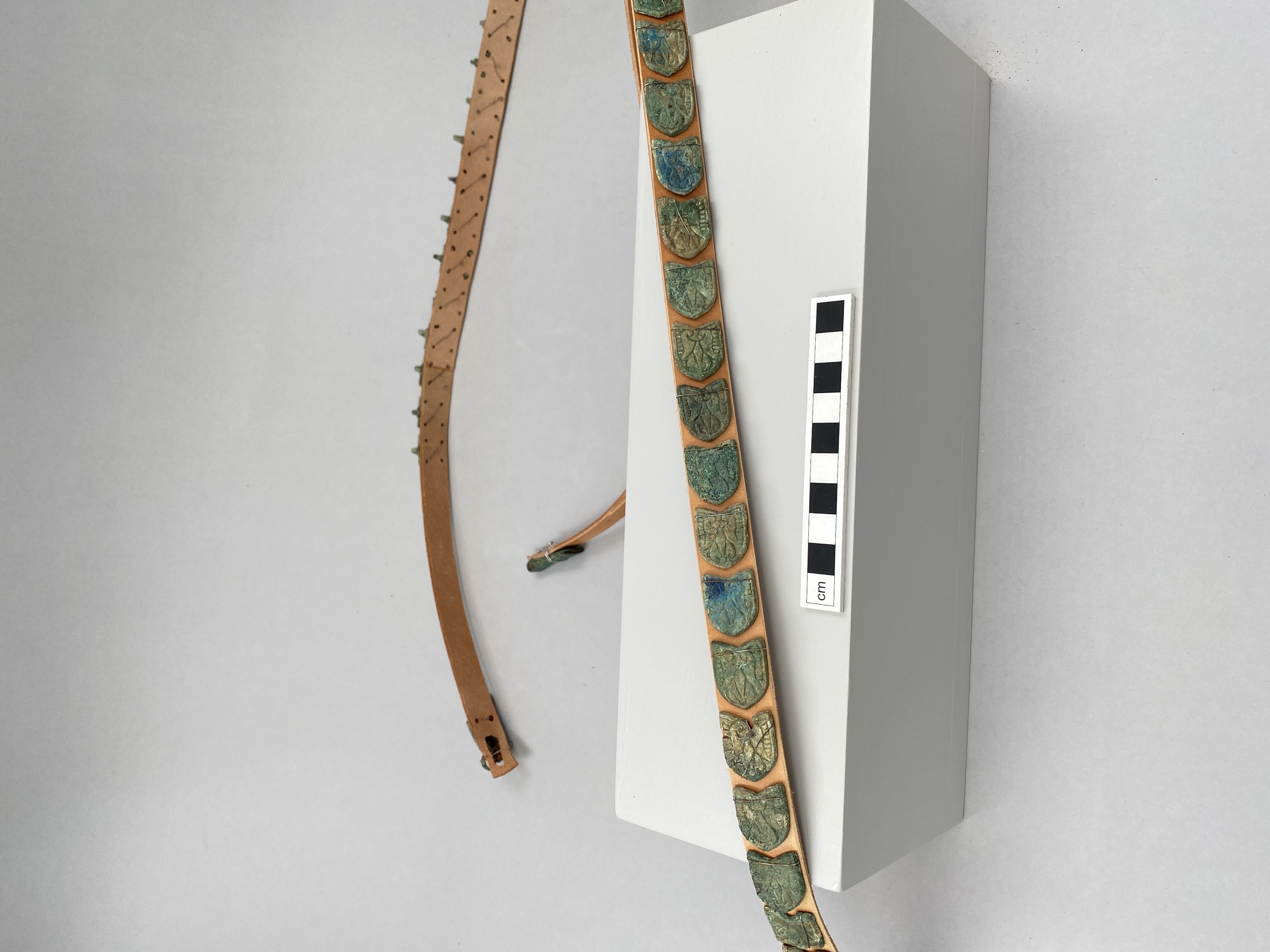 14 sköldformiga bältesbeslag monterade på modernt bälte.