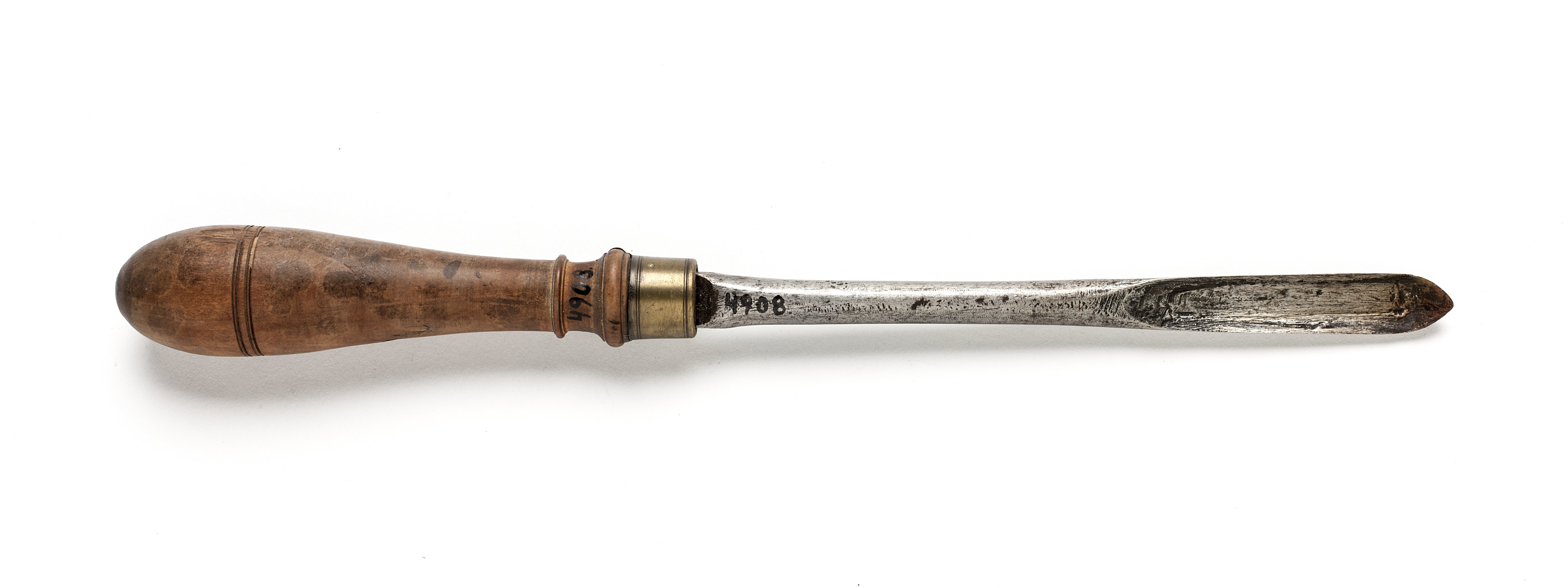 Rund klinga. Svarvat skaft av päronträ med två vulster nedtill ("skoklostertyp"). Mässingsring.