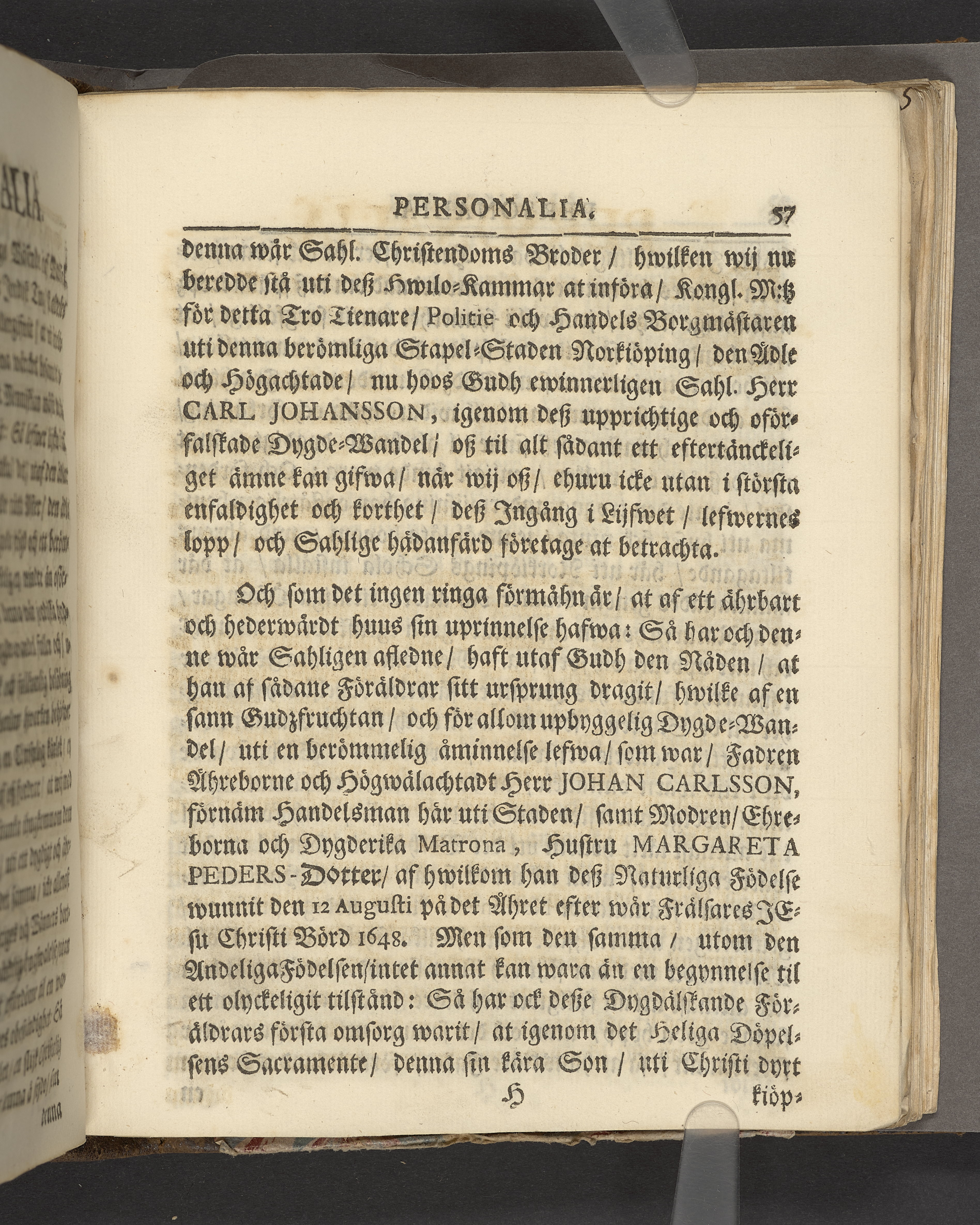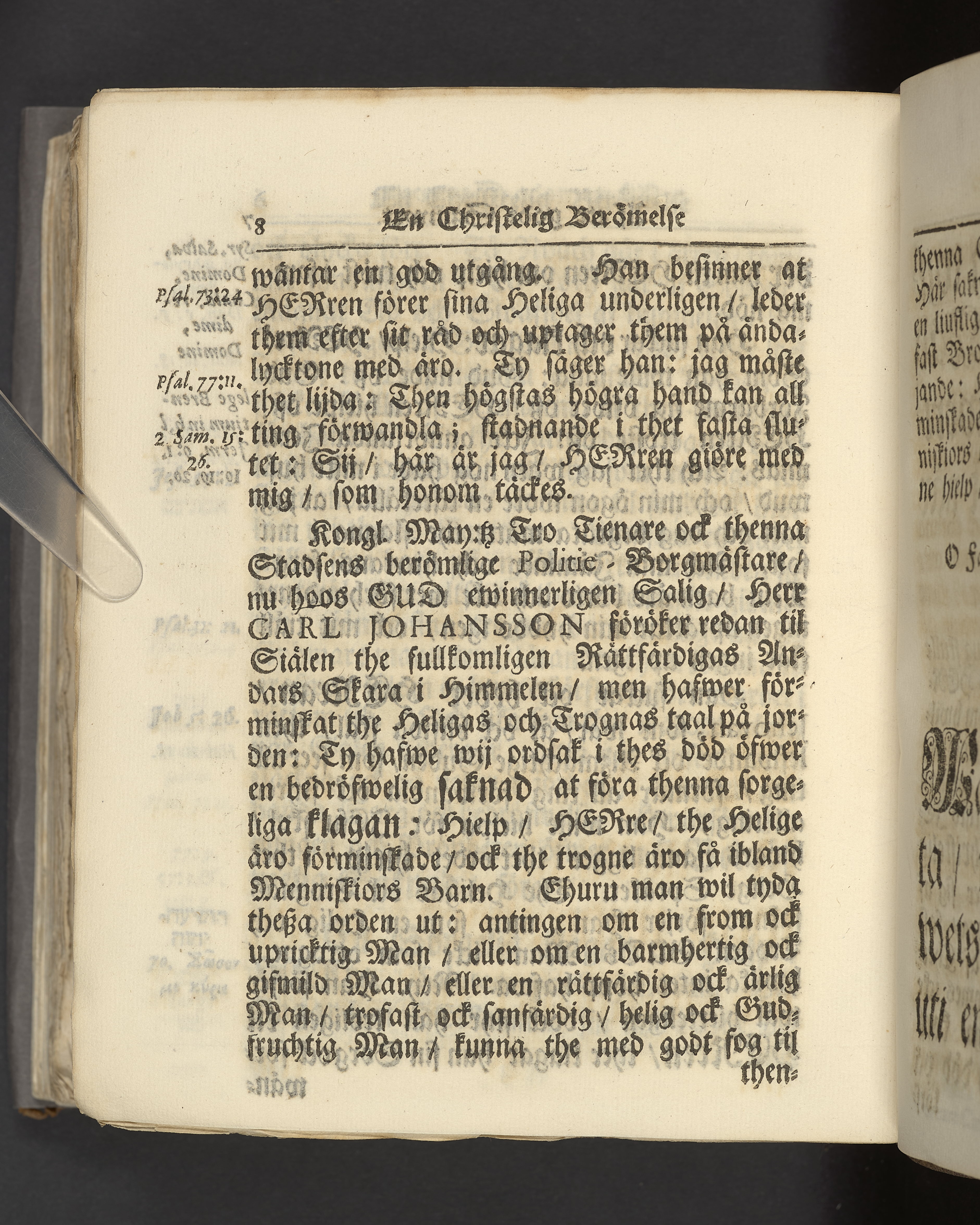 Gloriatio christiana, det är, en christelig berömelse af ett godt samwet. Hwilken den helige apostelen hafwer föreskrifwit; fordom kongl. may:ts tro-tienare ock Norkiöpings stads politie-borgmästare ... Carl Johansson altid älskat; och wid des jorde-färd uti en folckrijk församling den 23 febr. år 1708. allom christnom til efterdöme lemnat Petrus Asp ... Stockholm, tryckt, uti kongl. boktryckerie hos Joh. H. Werner, 1709.