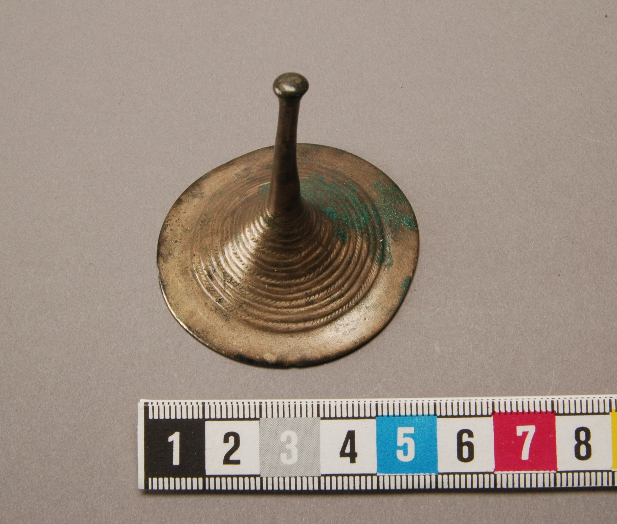 Tutulus av brons. På stångens topp finns en rund knopp. Tvärslån på baksidan är inte märkbart nött. Ornerad.