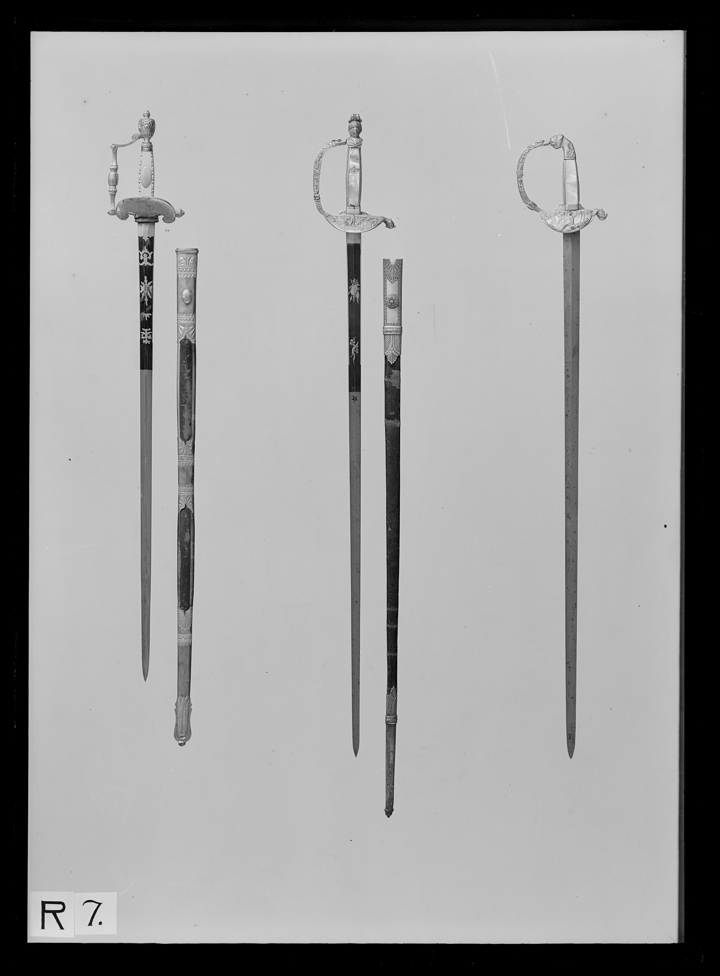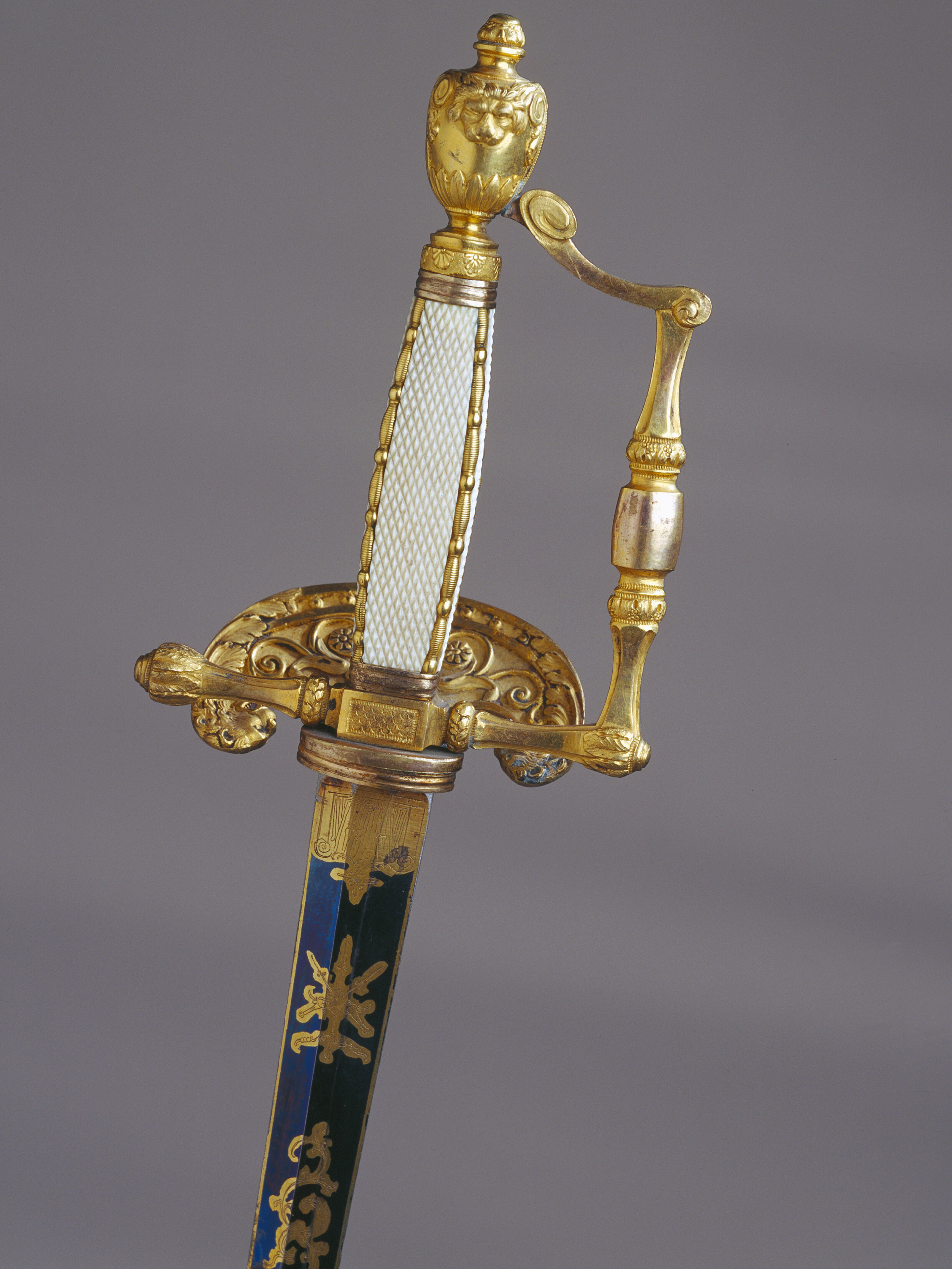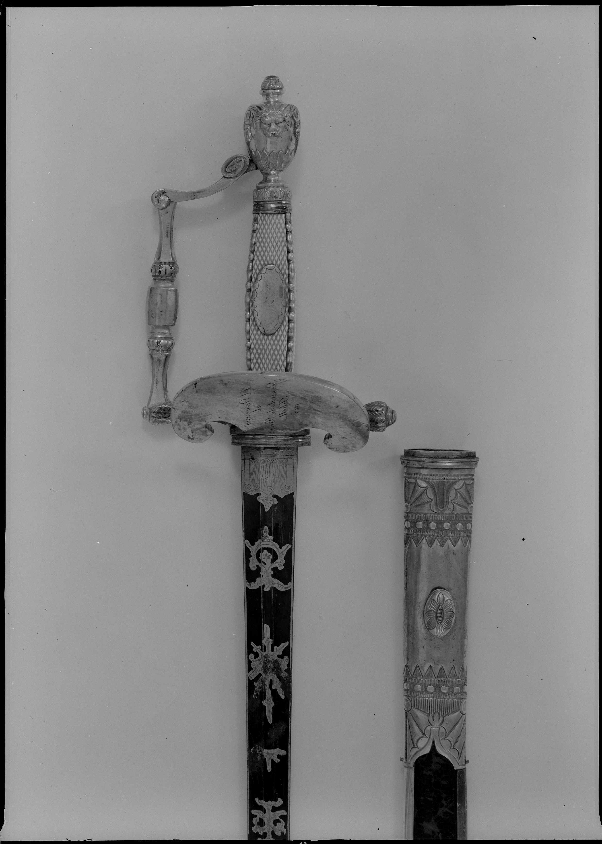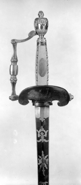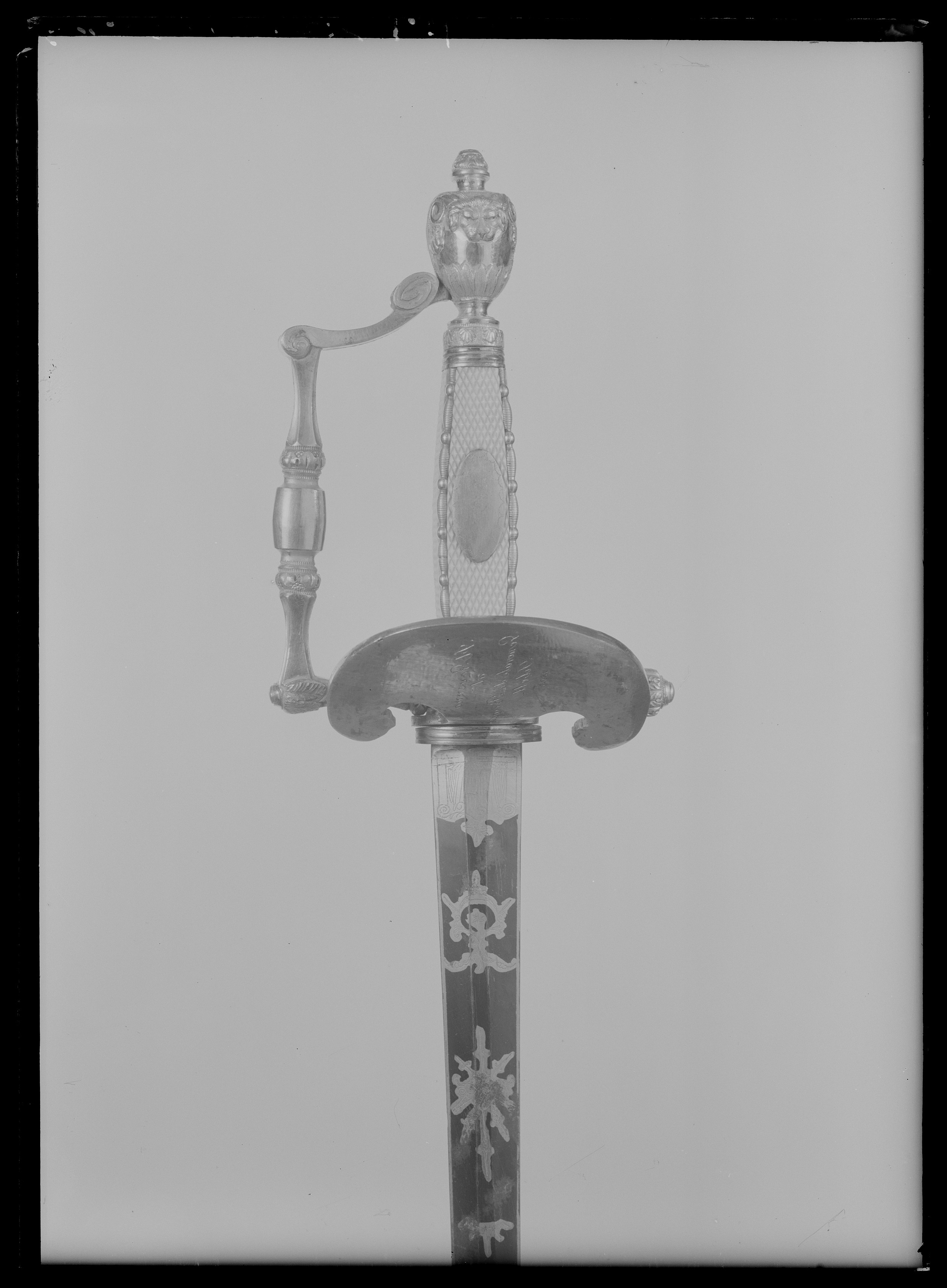Fäste av förgyllt, reliefornerat silver. Orneringen gjuten och ciselerad. Knappen urneformig med en lejonmaskaron på ut- och insidan. Nitknapp hög. Handbygeln vinkelformigt böjd och ornerad med reliefornament, mittpartiet slätt. Rak bakre parerstång med vidgad, rundad ytterände, smyckad med tättsittande blad. Yttre parerplåt i form av en uppåtböjd amasonsköld, vars insida är ornerad med bladslingor och profilerade lejonhuvuden. På parerplåtens utsida graverat i spegelvänd skrivstil:"Il Governo al Generale di Brigata Tibell 1803". Kavel med rektangulärt tvärsnitt, de fyra sidorna klädda med rutat elfenben, utmed kanterna reliefornerade, förgyllda silverstavar. På kavelns utsida en slät, förgylld, oval silverplatta. Klinga rak, tvåeggad, slipad med sexsidigt tvärsnitt. Starka delen blånerad med etsad, förgyllddekor i form av slingor och trofégrupp.