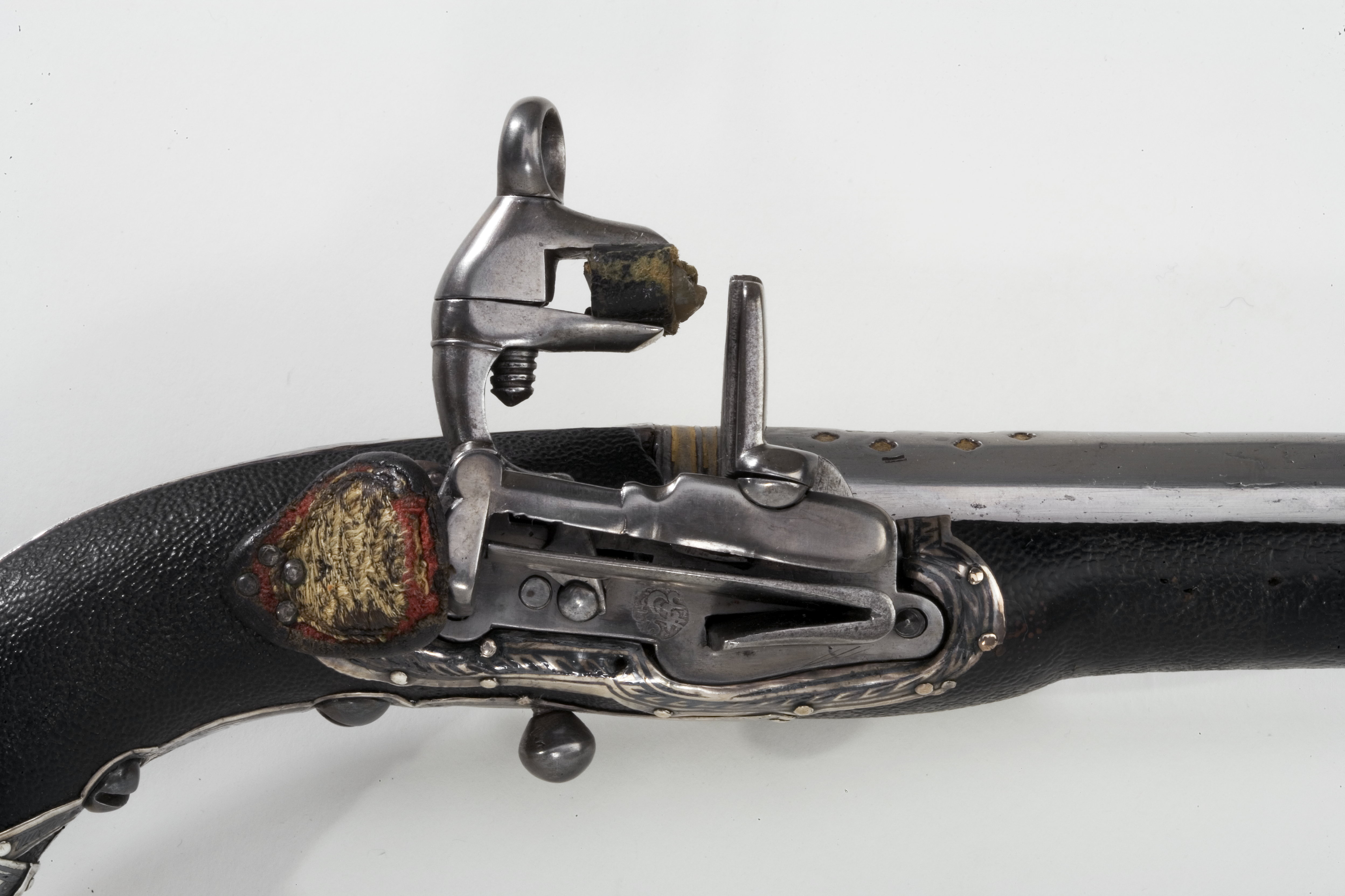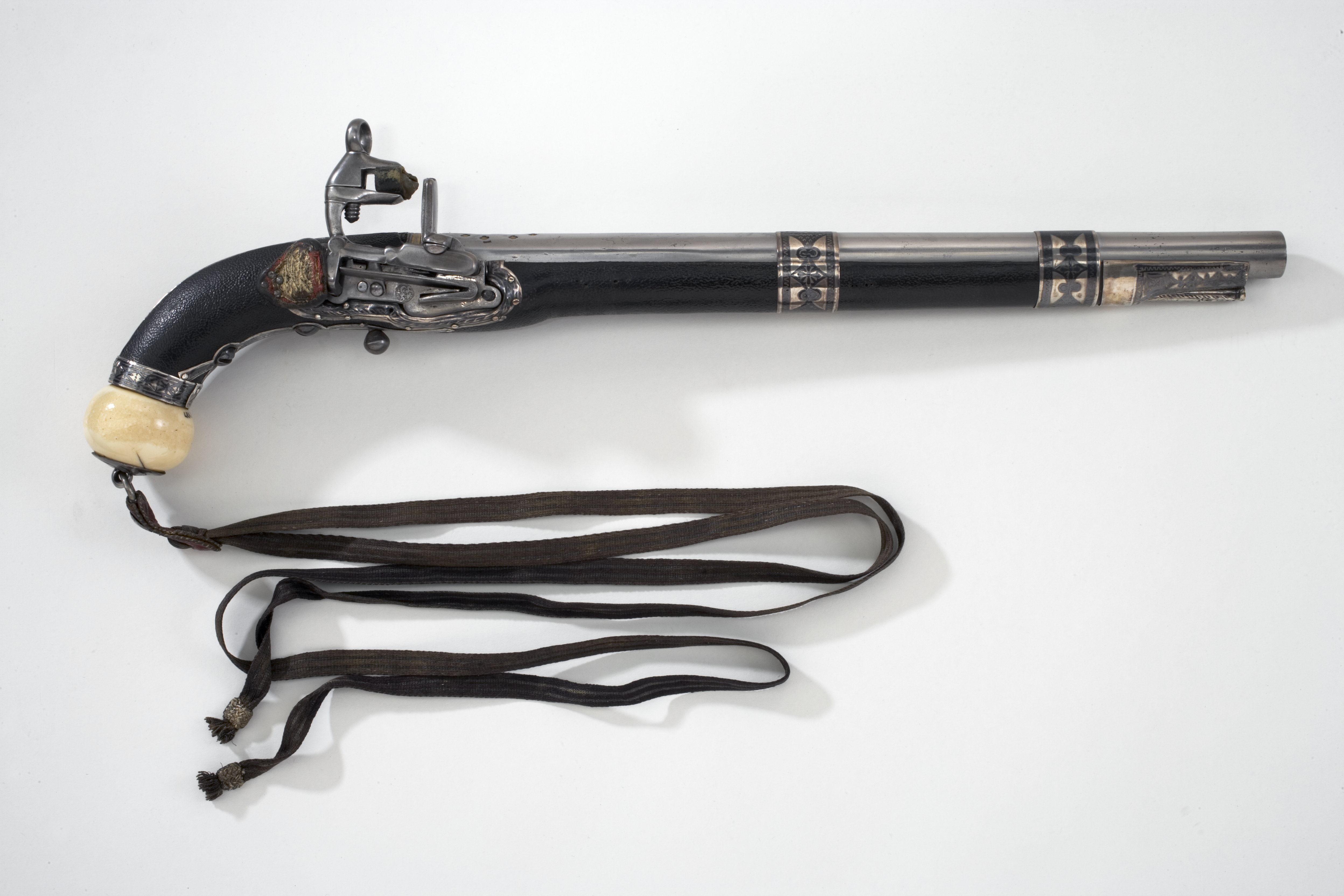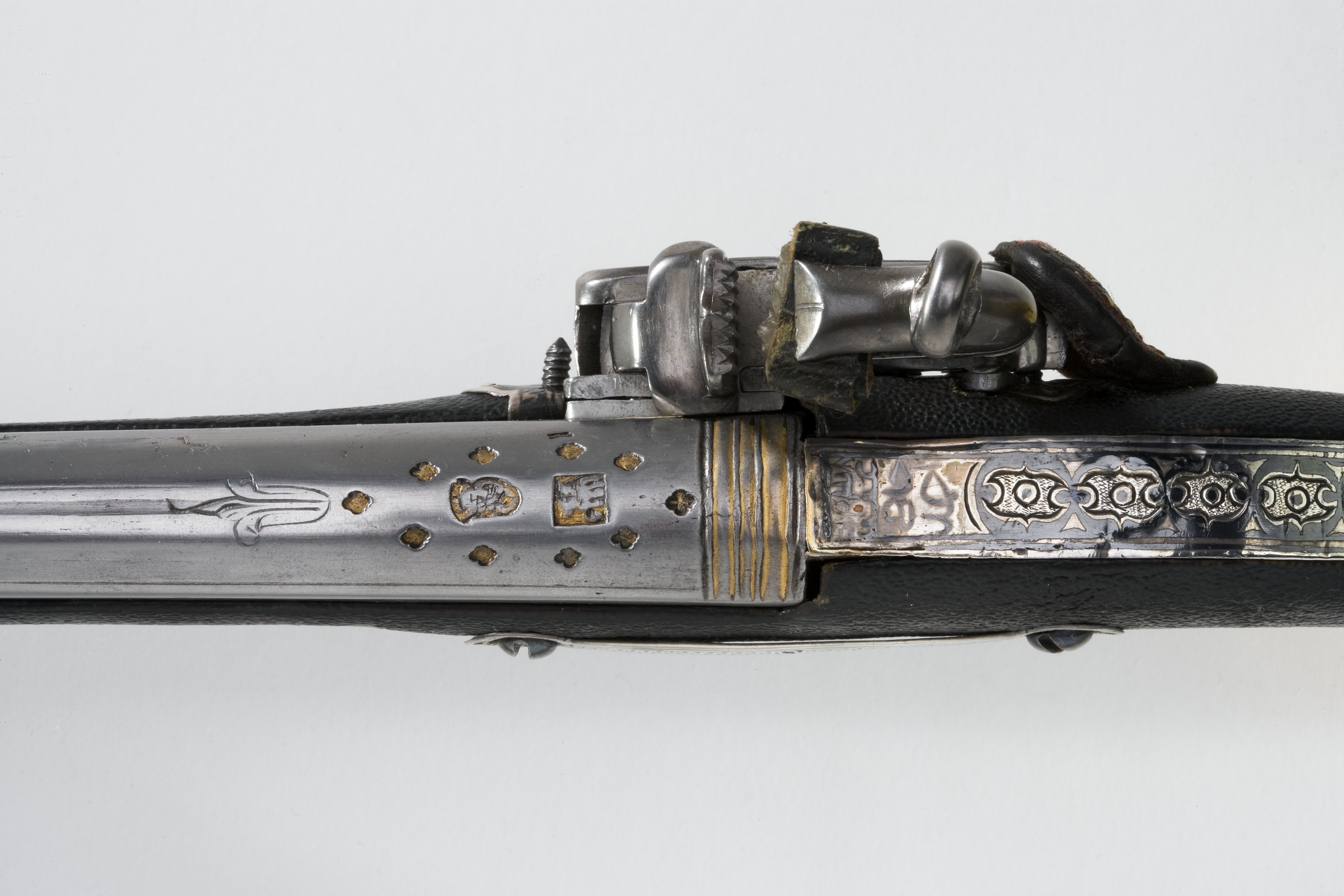 Rund, slätborrad pipa, vid pipbasen tre tvärgående, förgyllda band. På kammarens ovansida två stämplar, en rektangulär (Pegasus?) och en oregelbunden, båda med otydliga motiv. Dessa är omgivna av flera fyrpassformiga figurer, samtliga förgyllda. Framför dessa ett bladornament avslutat med en smal hålkäl som löper nästan ända fram till ett bakåtriktat, nästan helt bortnött bladornament vid mynningen. På kammarens undersida en stämpel: F. Fästning: Svansskruvblad, l: 132 mm, täckt med silverplåt med graverad och punsad ornering delvis i niello. Pipan fäst i svansskruvbladet med två skruvar underifrån. Runt pipa och stock två silverbeslag, b: 28 mm. Snapplås alla catalana. Litet, konturerat låsbleck med en rund stämpel innehållande turkiska skrifttecken. Hane med lös överkäke. Käkskruv med ringformigt huvud. Batteri med utbytbart eldstål. Gemensam studel för hane och batteri. Studeln döljer batterifjädern. Kort slagfjäder. Fästning och avtryckare: Kulformig avtryckare. Helstock av trä, överklädd med svart fårskinn med beslag av silver med niellodekor. Kolvkula av elfenben med centrumplatta av silver med kulformig hållare för ring till handrem. Ovanför kulan ett ringformigt beslag. Avtryckarbleck i ett med låsbrickorna på undersidan. Blecket framtill utdraget i två flikar. Urtaget för låset kantat med silverplåt som är fästat med små nitar. Vid låsets bakre kant ett litet tumskydd av rött ylle med guldtrådsbroderi (mycket nött), fodrat med läder. Sidbleck smalt och rakt vidgat i ändarna vid låsskruvarna. Näsband, l: 56 mm. Tillbehör: Laddstock av ljus trä, l: 296 mm med 56 mm långt ändbeslag av silver. I ytteränden en tunn mässingsskoning. Handrem av 9 mm brett band, vävt av guld- och silvertråd, fäst i kolven medelst en konturerad, röd skinnbit samt en silverknapp, d: 12 mm.