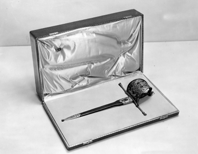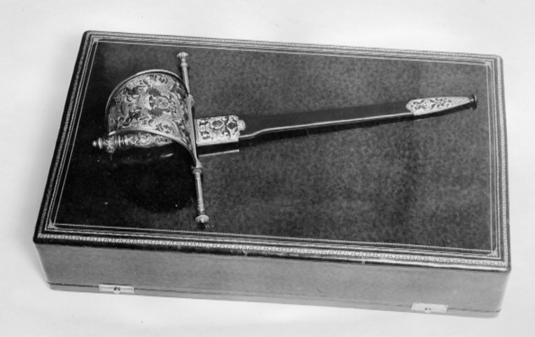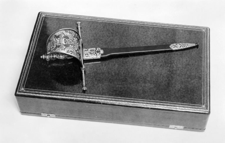 Rektangulärt schatull med rundade hörn och kanter, locket h: 113 mm, underdelen h: 30 mm. Utvändigt klätt med brunt skinn, på lockets översida fyra kantbårder i guldtryck av olika utförande, likaså på lockets underkant och underdelens överkant bård i guldtryck. Undersidan klädd med brun, mönsterpressad galon. Fyra sfäriska nithuvuden av vitmetall. Två lås av mässing med fjädrande skjutregel. Locket invändigt stoppat och klätt med blekgult siden. Fastsytt firmamärke, förgylld platta av stål med oregelbundna kanter, runt svärtat märke med blank kantring, därinnanför krona, två korslagda kanoner, kulhög med sex synliga kulor samt text: "ARTILLERIA FABRICA NACIONAL DE TOLEDO", allt förgyllt. I underdelen fast insats klädd med blekgul sammet, urtag för dolken.
