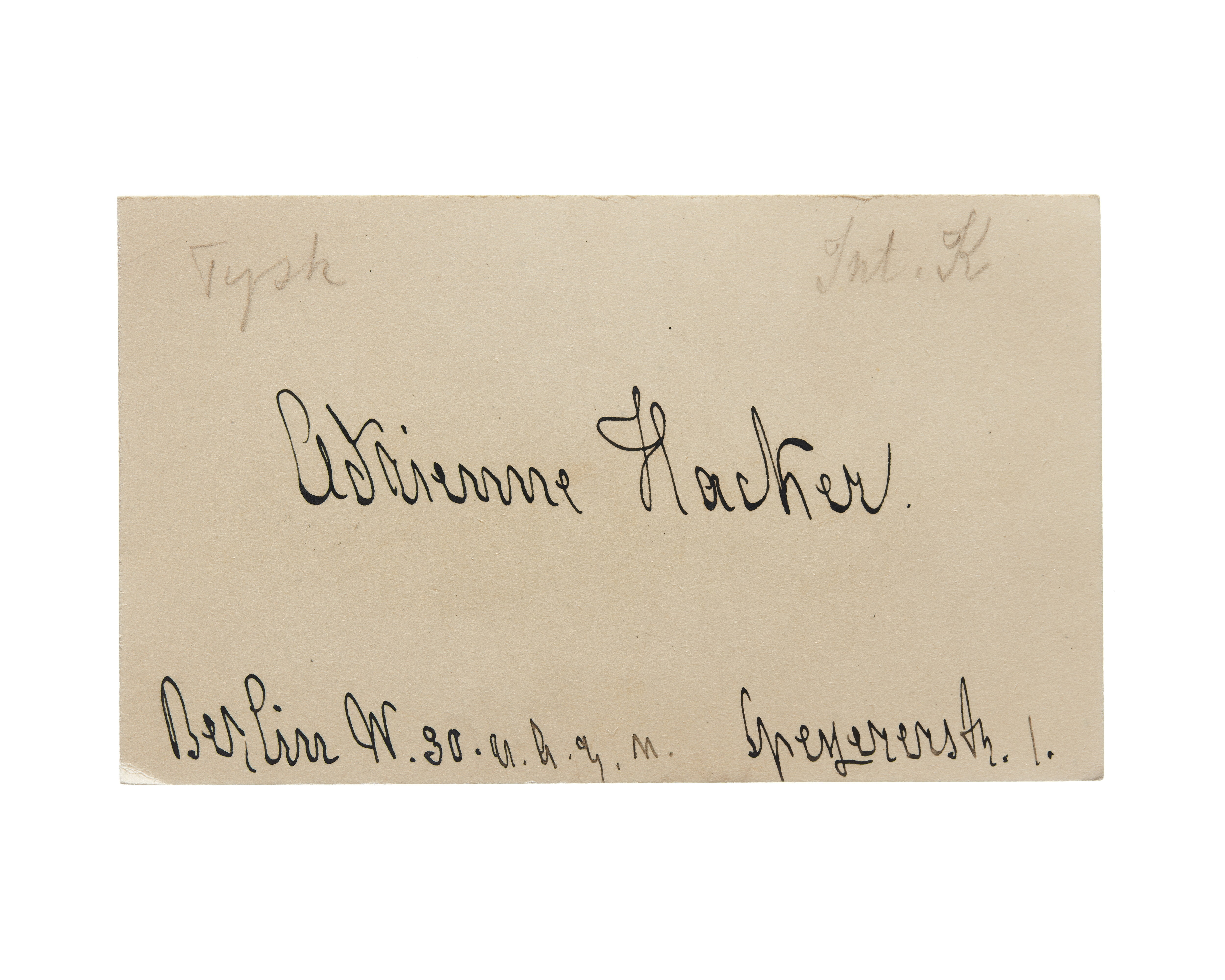 Ett visitkort från Adrienne Hacker, daterat 1911. Adress (nedre vänstra hörnet) Berlin W.30........ (nedre högra hörnet) ..... Överlämnat i samband med Internationella kvinnoförbundets kongress i Stockholm 1911.