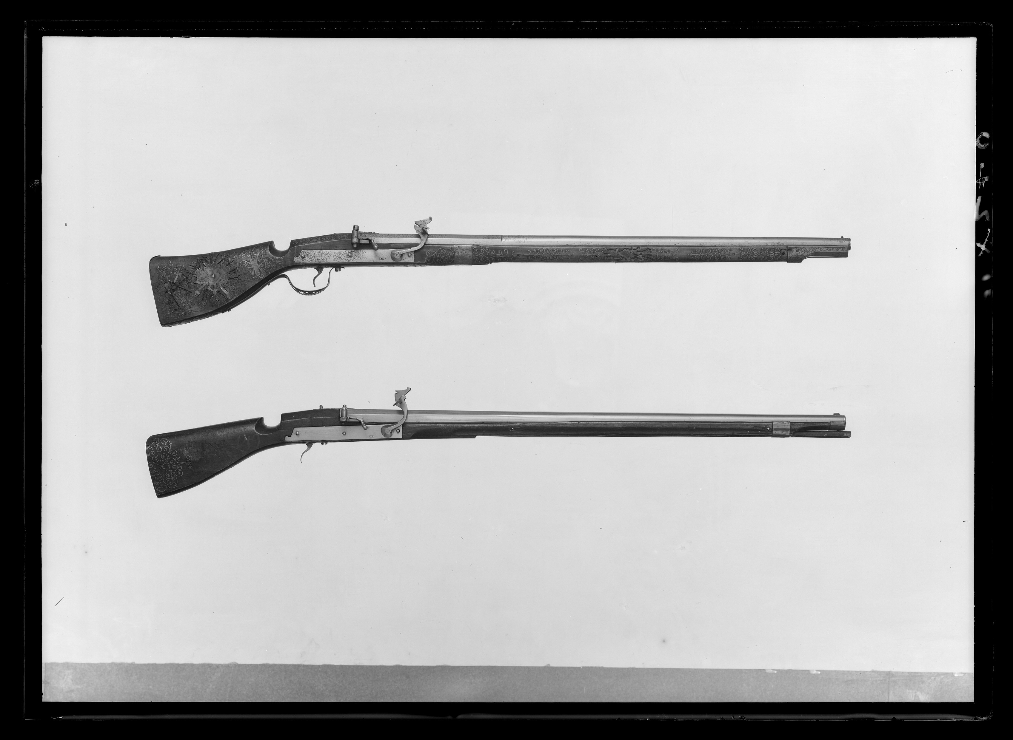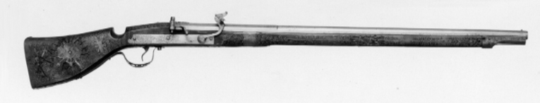 Rund, slätborrad pipa av stål med åttsidig kammare. Sikte av mässing i form av skårad klack med genombruten framåtriktad arm. Knoppkorn av mässing. Graverad dekor på kammaren vid övergången mellan kantig och rund del samt runt mynningen i form av växtornament mot punsad botten. På kammaren en stämpel: krona (se Livrustkammarens vägledning 11921:252). Fängpanna fäst vid kammarens högra sida, vridbart fängpannelock med arm. I fängpannan ett kryss i relief. Eldskärm med konturerad överkant. På svans-skruvbladet en graverad blomma. Två häften. Pipan fäst med krysskruv underifrån (varbygelskruven) samt två pipstift av trä. Luntlås av stål med rektangulärt låsbleck med braverade blommor på bakre delen. Böjd hane med drakformig luntklämma med vingformig klämskruv. Två låsskruvar. Hävstångsmekanism, c-formig avtryckare. Brun helstock, möjligen av björk, med tidig fransk kolv med rak rygg och nedskuret tumläge. Beslag och rika trådinläggningar av mässing med graverad dekor. Bakplåt med kort tunga, bladdekor på tån liksom på den bandformiga spetsrörkan. På kolven inläggningar i form av trofégrupper, på anslaget inlagt: C R S (Carolus Rex Suecia) ovanför ett hål efter en inlagd platta, där enl. inv. Kongl. Maj:ts Wapn" funnits. Två fyrpassformiga, graverade låsskruvbrickor. Enkel varbygel med genombruten, graverad bygel.