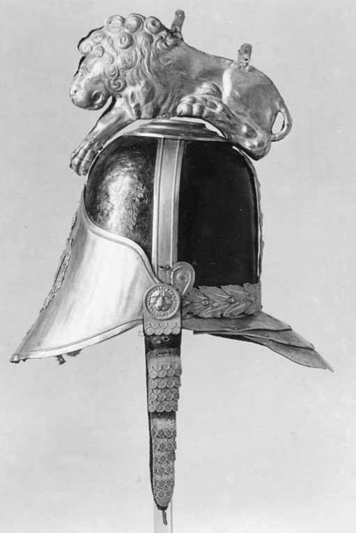 Kask för Livdrabantkåren. Kask av svartlackerat läder med beslag av förgylld mässing. På framplåten finns fäst Riksvapnet med en krönt sköld med tre kronor inom serafimerordens kedja med ordenskors. Kasken har en kam i form av ett lejon med lockig man. Lejonet är sammansatt av två delar av plåt med mönstret pressat i relief. Lejonet ligger med framsträckta framben och bakbenen uppdragna mot kroppen. Baktill på kasken finns en tredelad nackplåt. Fyra byglar går från kaskens nederkant till dess topp där de hålls samman av en rundel i tre avdelningar (ca. 11,5 cm i diameter), varpå lejonet vilar. Bygeln baktill (ca. 3,4 cm bred), liksom ett band längs kaskens nederkant baktill, har inpressad dekor i form av parvis ställda lagerblad och bär. Övriga tre byglar är släta med en upphöjd rand i var sida. Hakrem med fjällformade beslag, bredast upptill (ca. 3,6 cm) och avsmalnande nedåt (ca. 2,7 cm). Remmen har foder av brun sammet och med en hake fäst i änden. Ett runt beslag dekorerat med ett lejonhuvud (ca. 3,2 cm i diameter), finns där hakremmen är fastsatt. På höger sida saknas hakremmen liksom det runda beslaget som brukar finnas där remmen är fäst. Foder/innerhuva av brunt tunt läder. Huvan är öppen på hjässan, avslutad med flikar, i var flik finns ett hål och en snodd är genomdragen, med snodden regleras vidden/storleken. Skärm och bakstycke har foder av blått siden. Längs kaskens nederkant är sytt ett svart band. På det blå sidenfodret på bakstycket finns skrivet: "RS" och "Sand???" Jämför med Armemuseum inv.nr 13154 och 70521; beslag av förgylld mässing, likadana som Lrk inv.nr 22205-08, 22351-68 och 28493.