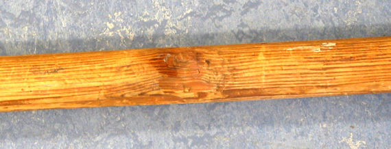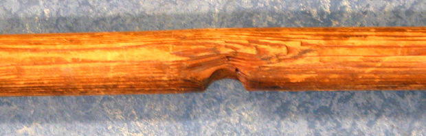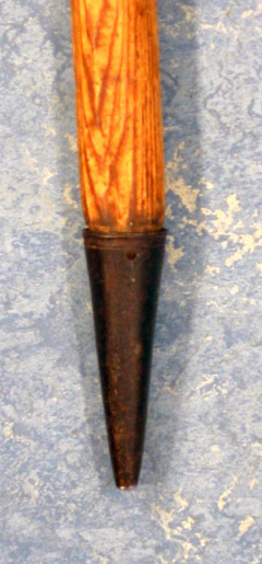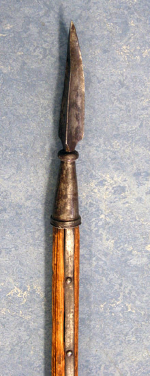 Från Stora daldansen 1743. Tresidig spets av stål med skålade sidor, l: 140 mm, nedtill insvängda kanter till rund, tillplattad kula, d: ca 25 mm. Därnedanför en konisk holk, l: 79 mm. Ifrån holken utgående två skaftskenor, b: 11 mm, l: 298 respektive 310 mm, den kortare skenan fäst med två, den längre med tre spikar. Obehandlat skaft av furu, två skålade urgröpningar (naturliga?), något förskjutna i sidled. Doppsko av stål, l 00 mm, konisk, avsmalnande nedåt med trubbig spets, upptill två tunna kantringar, en skålning samt ytterligare en tunn ring. Doppskon ursprungligen fäst med två nitar med välvd huvuden, den ena saknas.