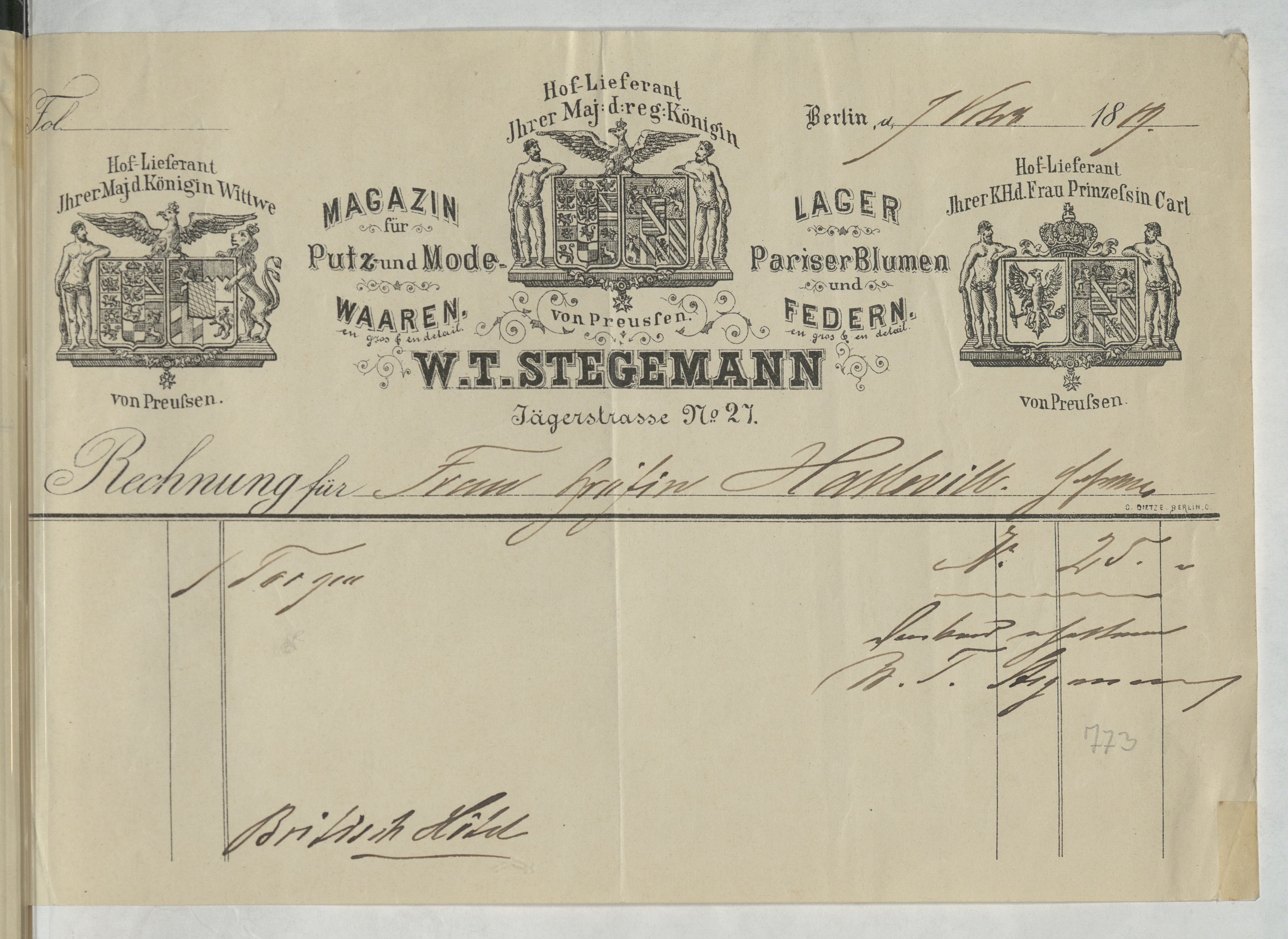 Kvitto från W. T. Stegemann. Berlin, 1889.