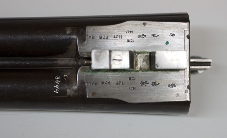Dubbel pipa för hagel, helt blånerad. På v. Pipas översida graverat: "JOSEPH LANG & SONS". På h. pipa: "22 COCKSPUR STREET. LONDON". Plan spång med littrat, vattrat mönster. Vid pipbasen ett ej vattrat parti, l: 29 mm, vid pipbasen en 1 av guld. Spången baktill koniskt förlängd, system Westley-Richard, på ovansidan graverat en palmett. Knoppkorn av silver. Klackplattan oblånerad, på båda sidor om klackarna engelska kontrollstämplar: GP under hjälmprydnad med lejon (provisional proof mark ) krönt V (London View) krönt CP (definitive proof) 14 och 12B samt: NOT FOR BALL. På pipornas runda delar därframför stämplat: CHOKE och 6221 på spången däremellan: 24252. På lilla pipklacken stämplat: W.