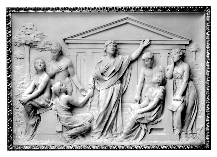Skulptur. DIKTEN, relief av marmor från Carrara (Italien). Liggande rektangulär marmorrelief föreställande sju figurer, män och kvinnor framför ett tempel med kolonner i jonisk stil. Kvinnan i mitten symboliserar diktkonsten. Modellerad efter besällning av Walter och Wilhelmina von Hallwyl av konstnären Gusten Lindberg 1897.