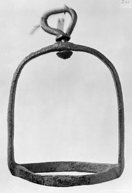 Stigbygel av järn, med vridbar remsölja, trampytan oval, mittjärnet saknas.