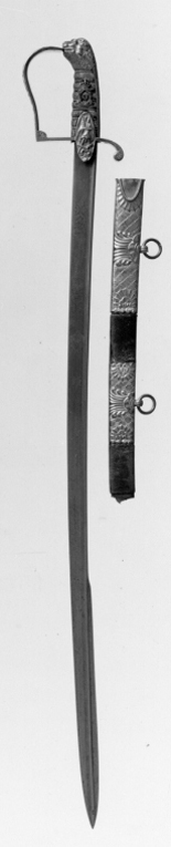 Fäste av förgylld reliefornerad mässing. Modellen densamma för officerssabel vid Livgardet till häst och Kronprinsens husarregemente (tidigare Husarregementet konung Karl XV). Skall enligt uppgift har burits av generalen Claes Arvid Bror Cederström (1824-1893). Kappa i form av ett lejonhuvud med lång man, kappan direkt övergående i den något konvexa ryggskenan. Handbygel platt, upptill utåtböjd och breddad samt intappad medelst en smal ten i lejonets gap; utsidan i sin helhet ornerad, upptill en tvärställd trumpet över en ulanmössa mellan två korsade lansar med stora tvåtungade lansflaggor, nedanför dessa två korsade pistoler, varemellan en sabel i balja, längst ned en trofégrupp ovanför en bladranka; handbygelns raka nederdel rätvinkligt övergående i den platta släta främre parerstången, som bakåt övergår i en nedåtböjd bakre parerstång, vars ytterände är bladformigt inrullad. Styrskenor utdraget ovala, båda ornerade som på handbygelns överdel med ulanmössa och korsade lansflaggor ovanför två korsade lansflaggor. På undersidan av bakre parerstången en oval stämpel med svärdfejarens signering i antikvaversaler: " I. A. E K" (verksam i Stockholm c. 1860-1885). Kavel klädd med grått fiskskinn och lindad (sju varv) med två parter förgylld mässingstråd. På kavelns utsida Karl XV:s 30 mm höga krönta monogram i silver (tjänstetecken för adjutant hos Karl XV). Klinga demaskerad, böjd, eneggad utom vid den 300 mm långa tvåeggade jelmanen, rygg stavformig fortsättande som en välvd list över jelmanen till udden. På starka delen etsad och förgylld ornering. På utsidan skriftband, vari inskription i fraktur: "Fäderneslandet", härovanför ett tämligen litet krönt trekronorsvapen med lejon som sköldhållare och en strålande stjärna. På insidan ett skriftband, vari inskription i fraktur: "Konungen".